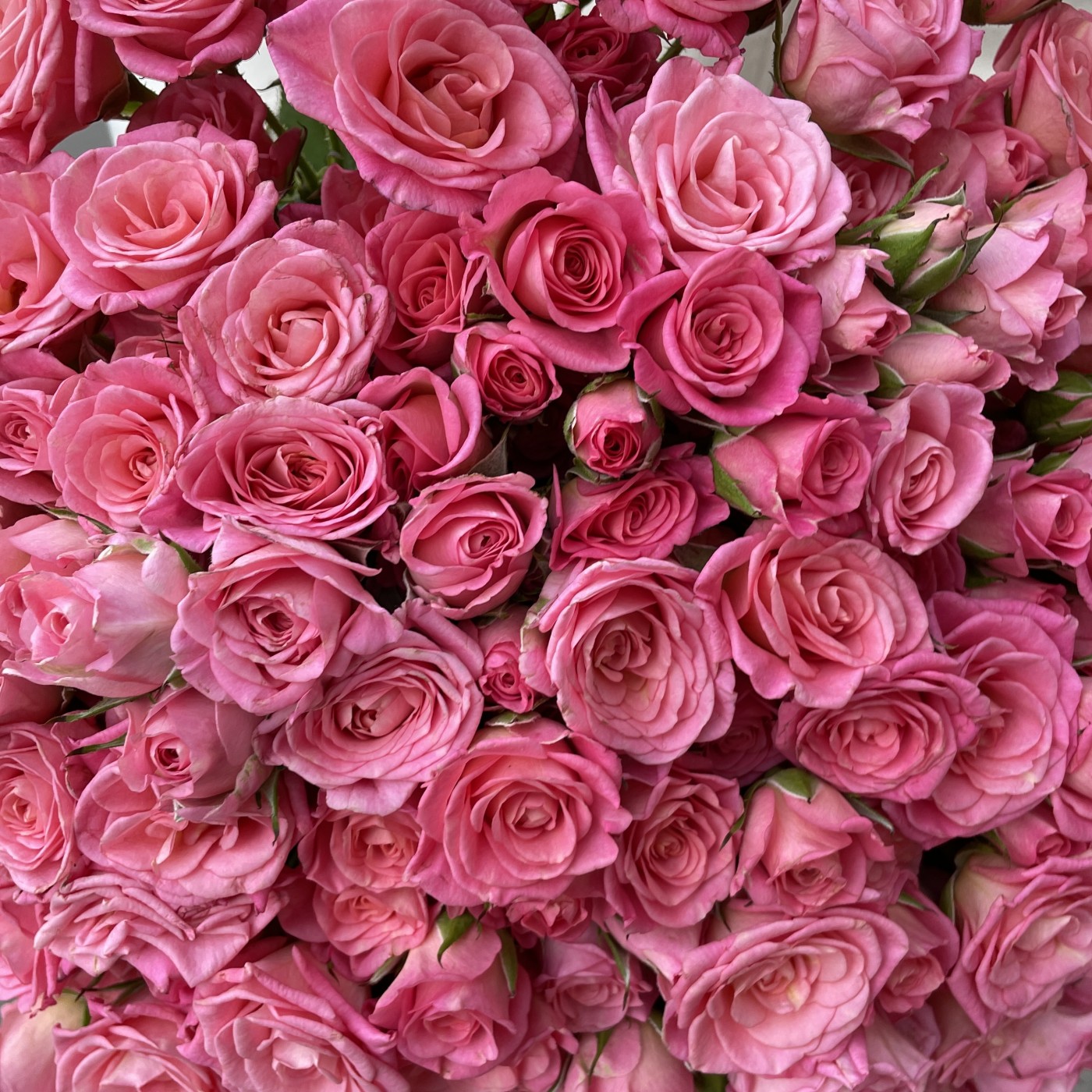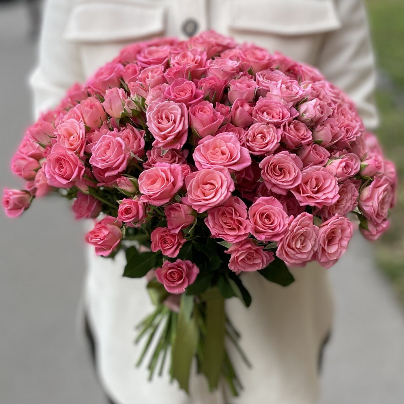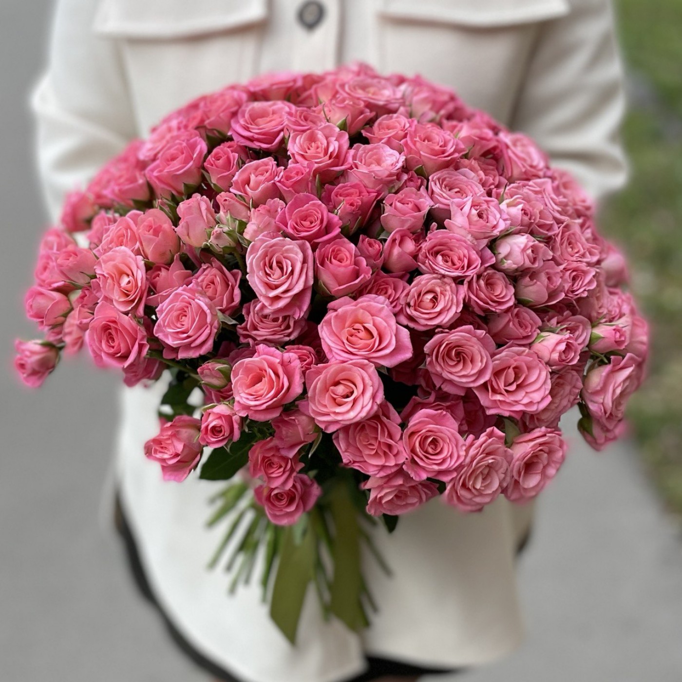 Кустовые розы насыщенного розового оттенка. На фото представлен букет из 21 ветки.