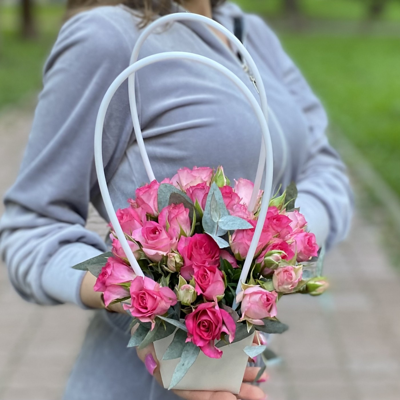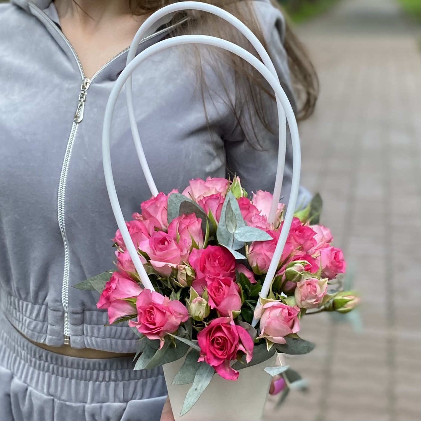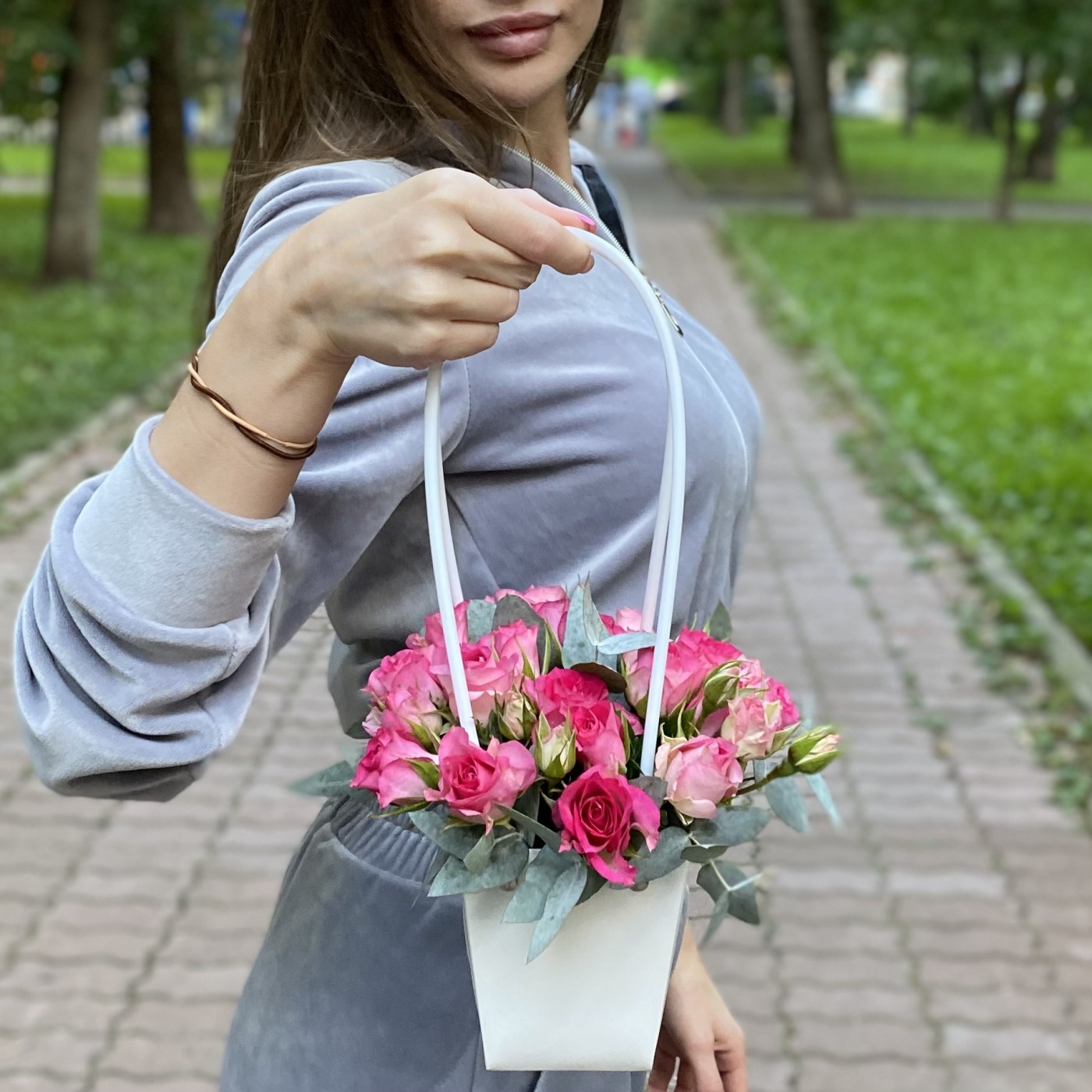 Композиция из розовых кустовых роз сорта Рупски с ароматным эвкалиптом в стильном пакете сумочке. Это отличный подарок учителю на 1 сентября или подруге на день рождения. Доставляем букеты и композиции по Москве и Подмосковью круглосуточно!