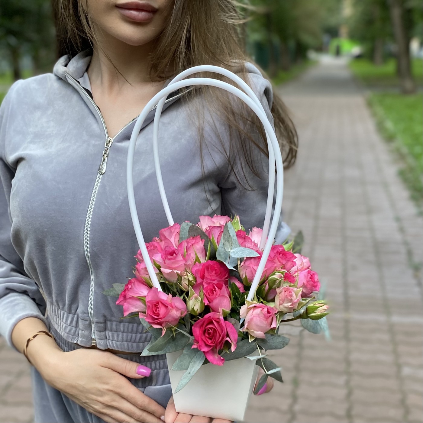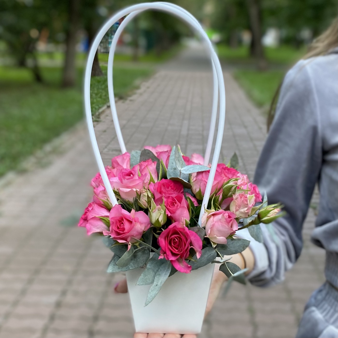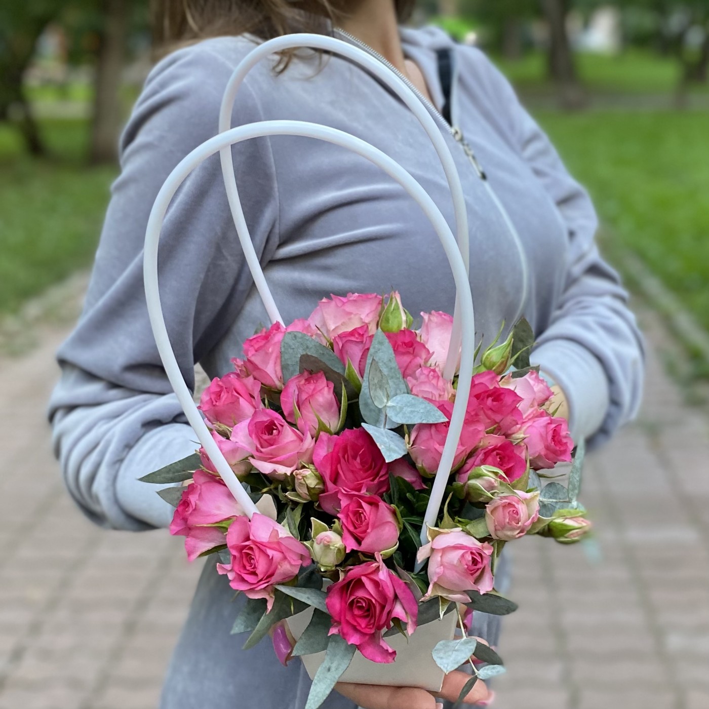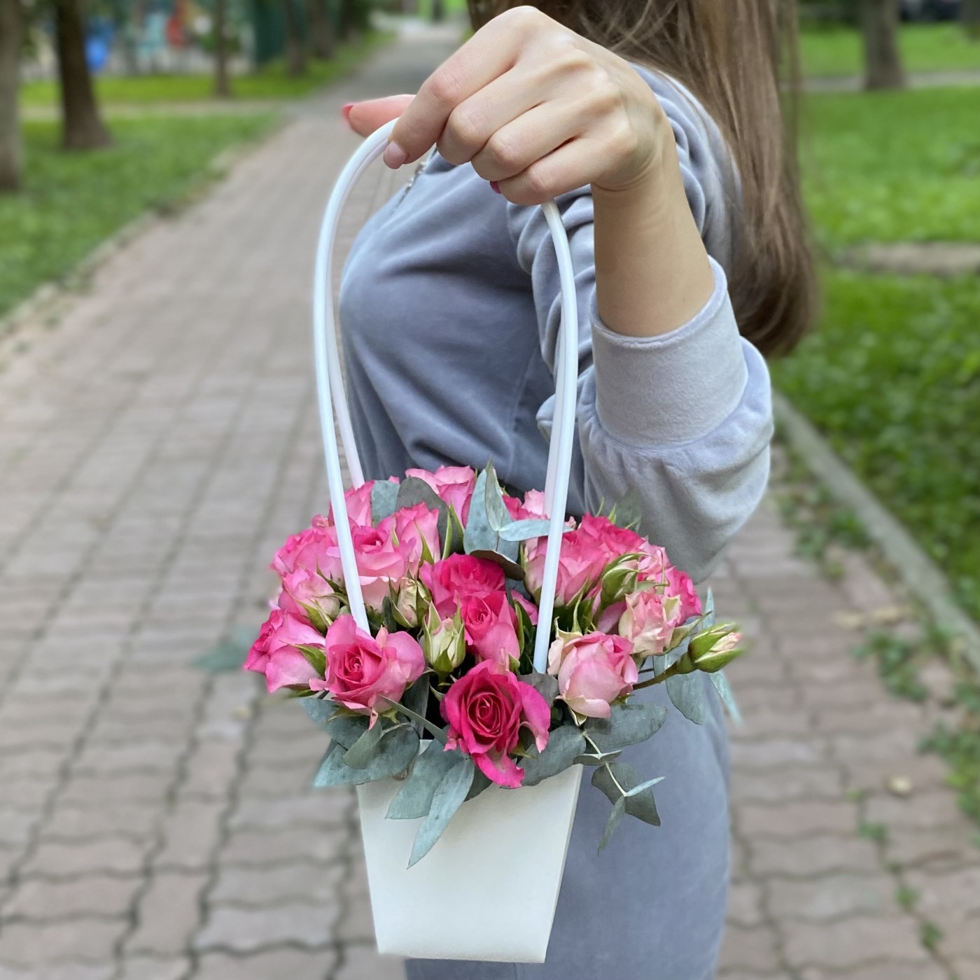 Композиция из розовых кустовых роз сорта Рупски с ароматным эвкалиптом в стильном пакете сумочке. Это отличный подарок учителю на 1 сентября или подруге на день рождения. Доставляем букеты и композиции по Москве и Подмосковью круглосуточно!
