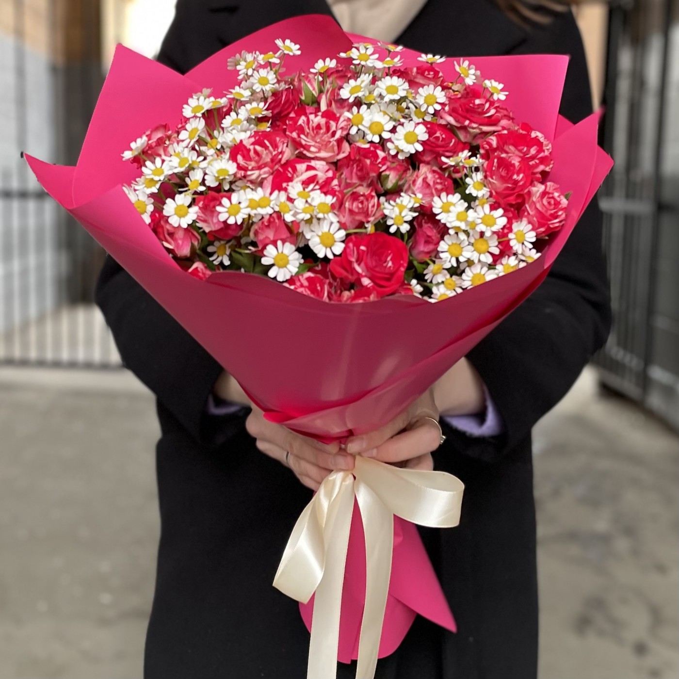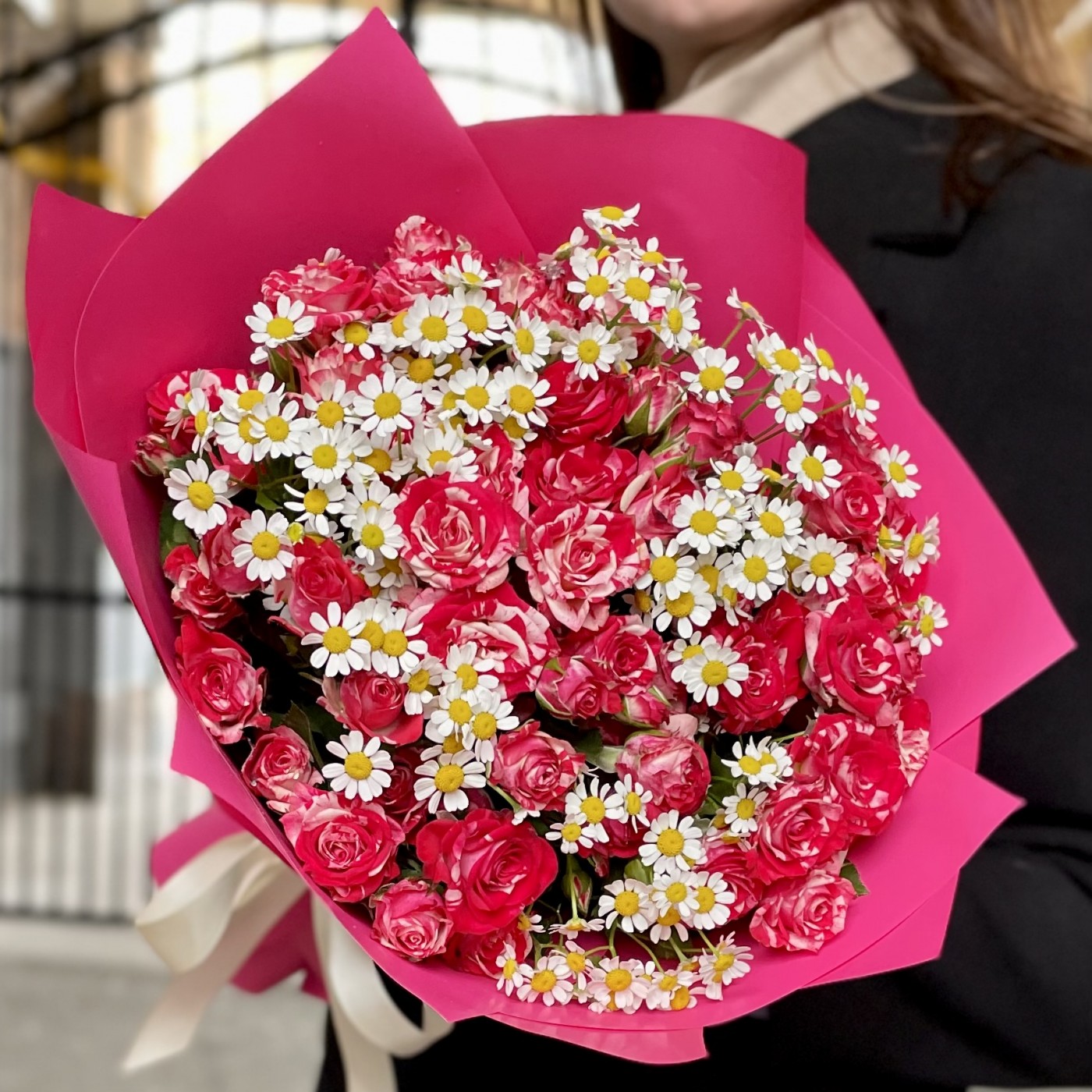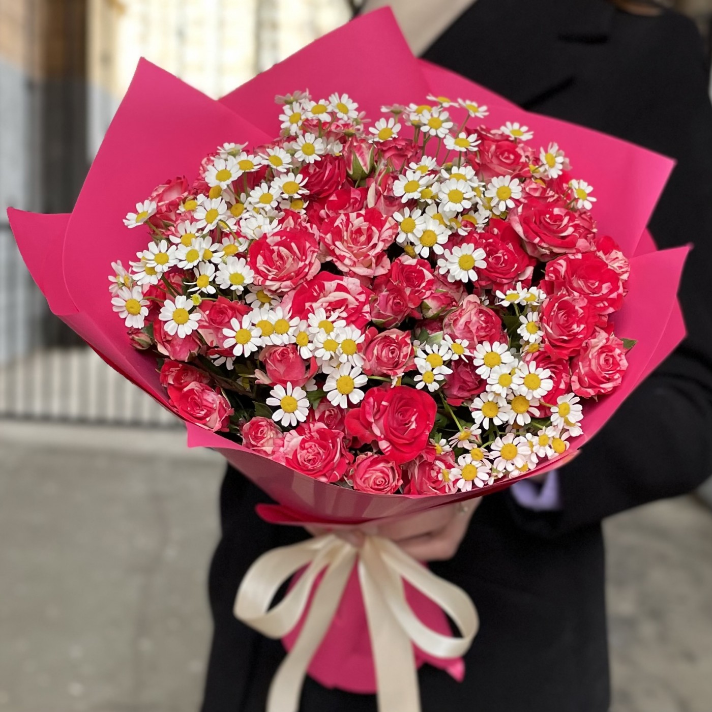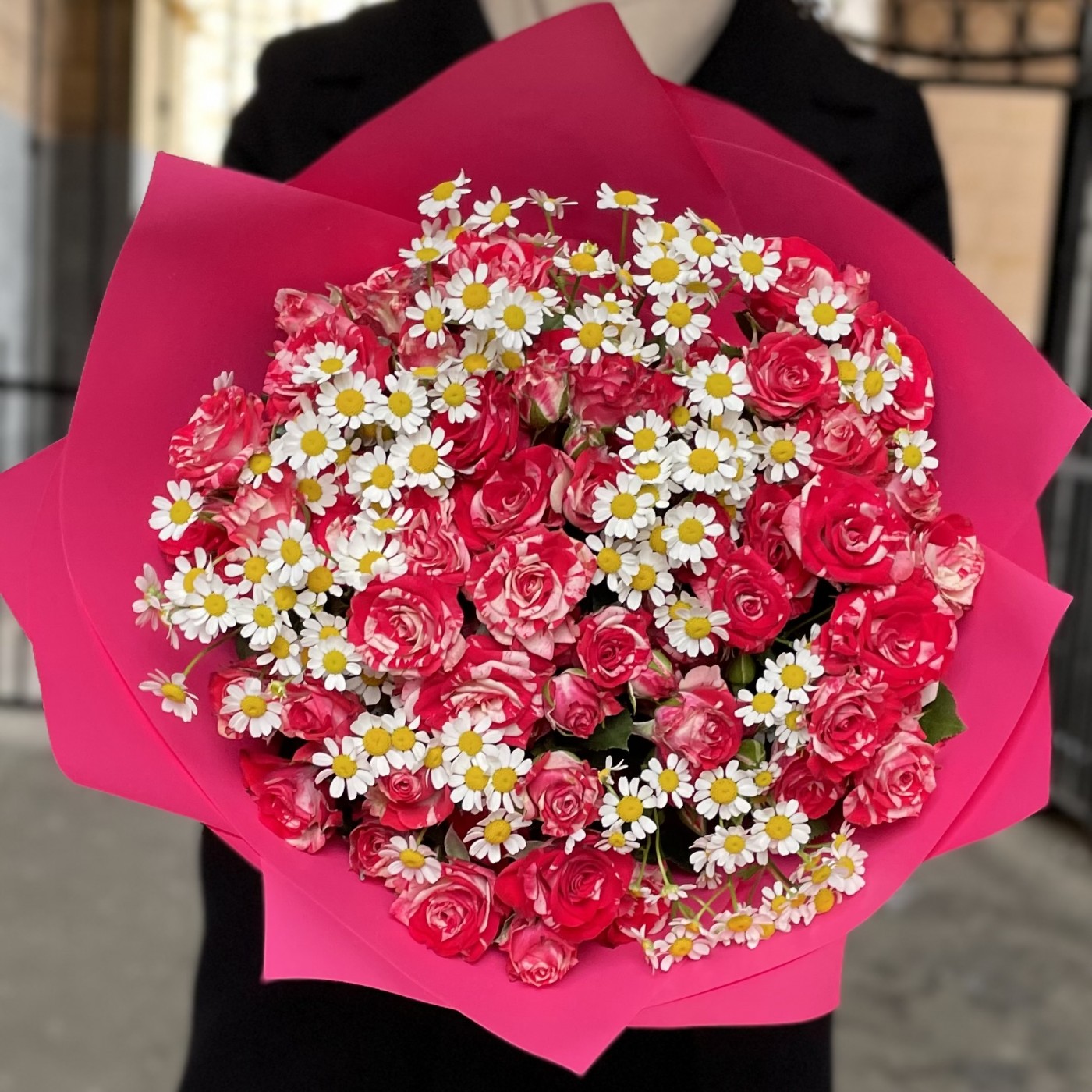 Яркая кустовая роза малинового цвета с белыми прожилками. В состав букета входит ароматная кустовая ромашка. Летний и радостный букет на день рождения. Так же этот букет можно преподнести в качестве комплимента и поднять настроение любимому человеку на долгое время.
