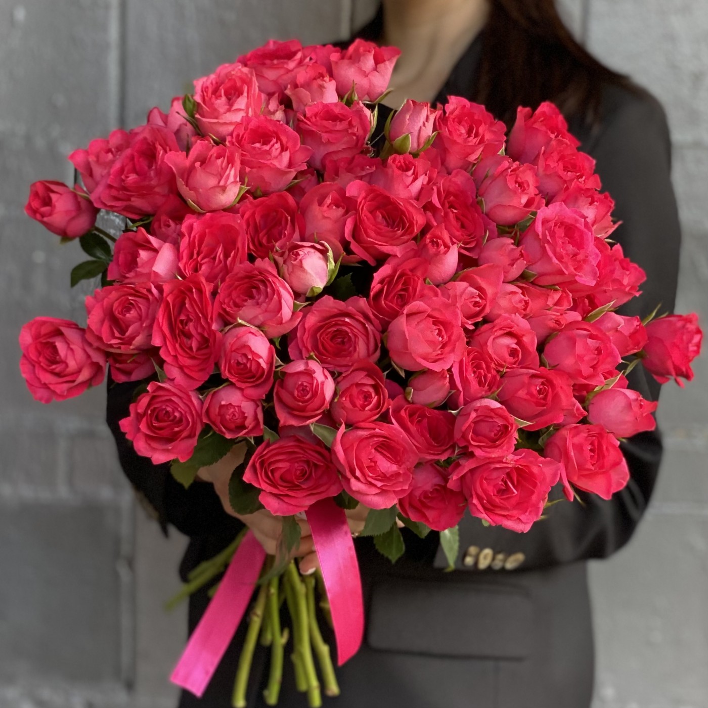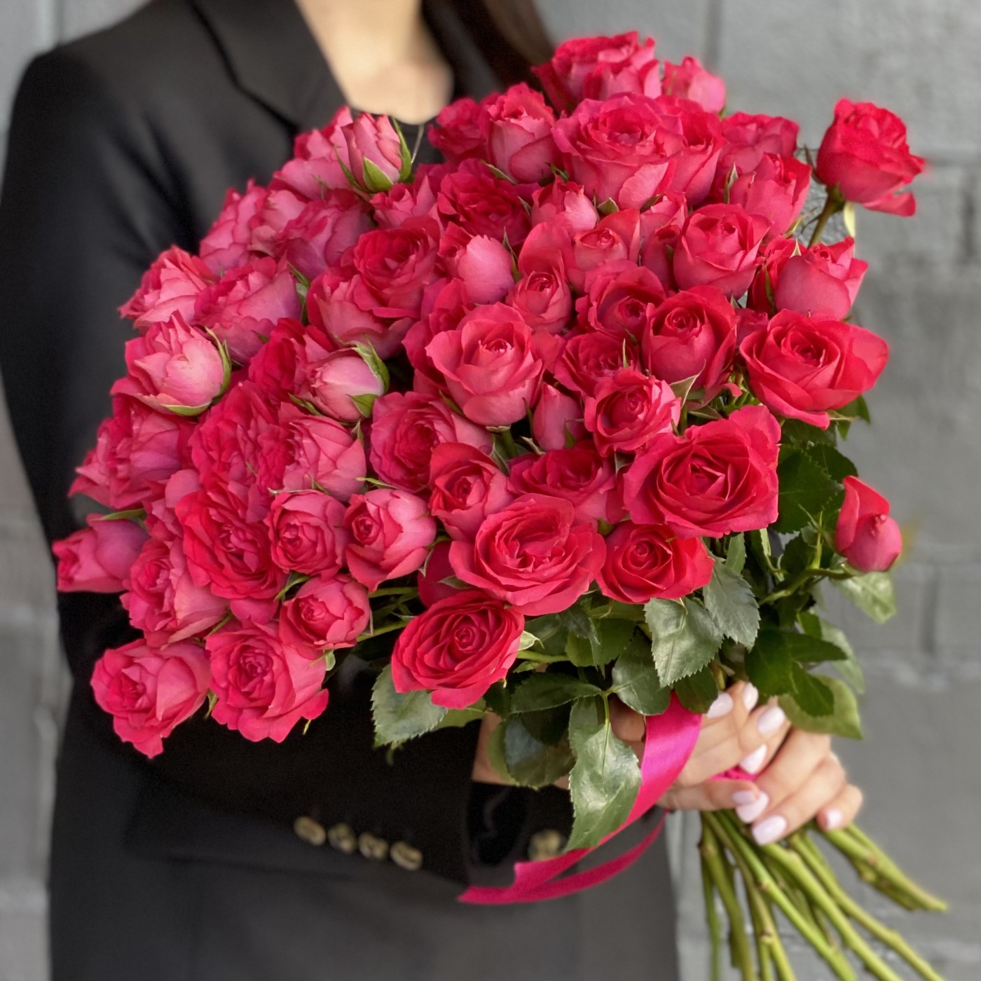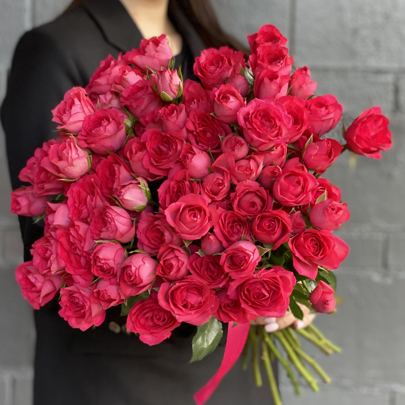 Анна о заказе: 51 малиновая розаСпасибо! Букет великолепный! Цветы свежайшие, упругие, очень красивые, крупные. Добавлено 4 коралловые розы и зелень