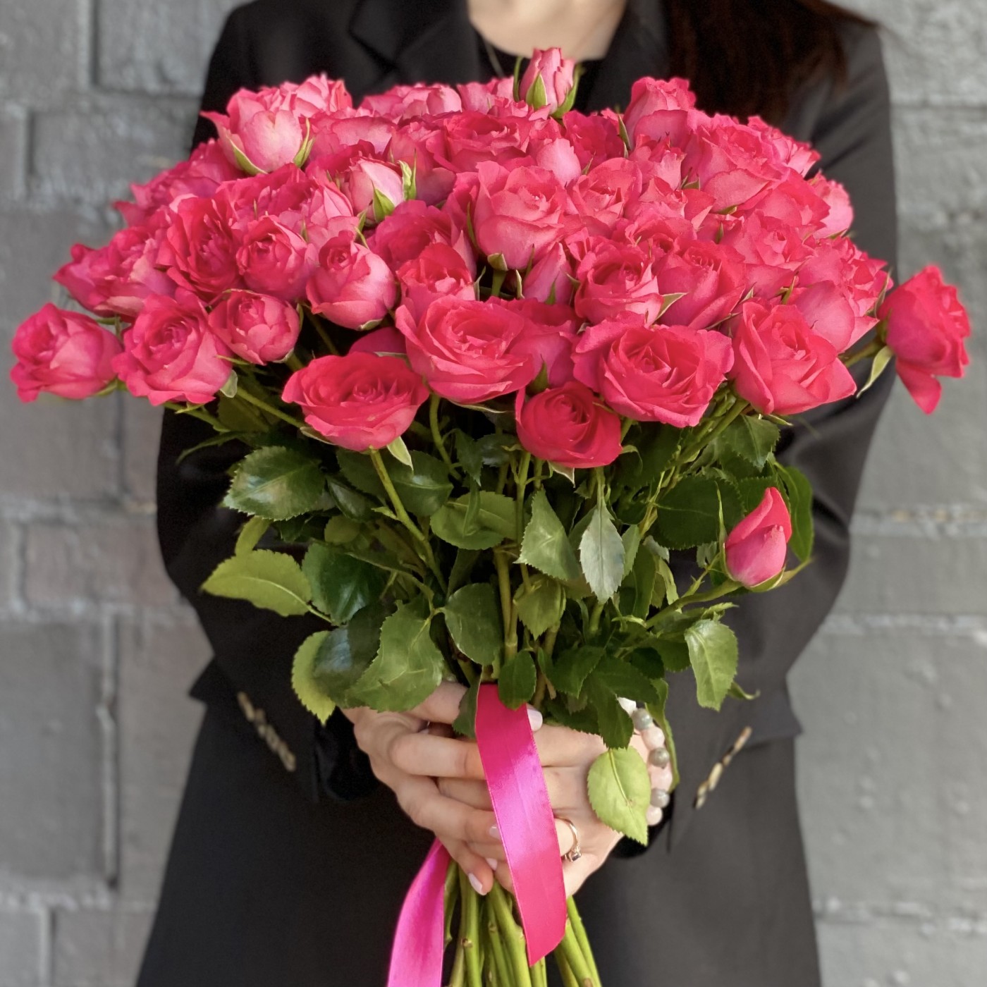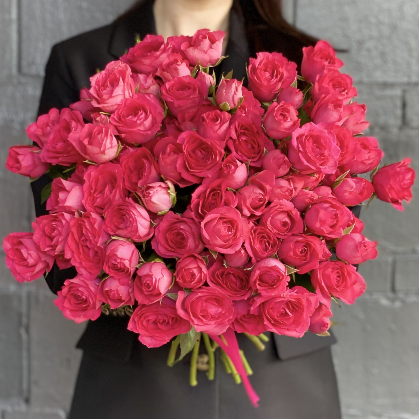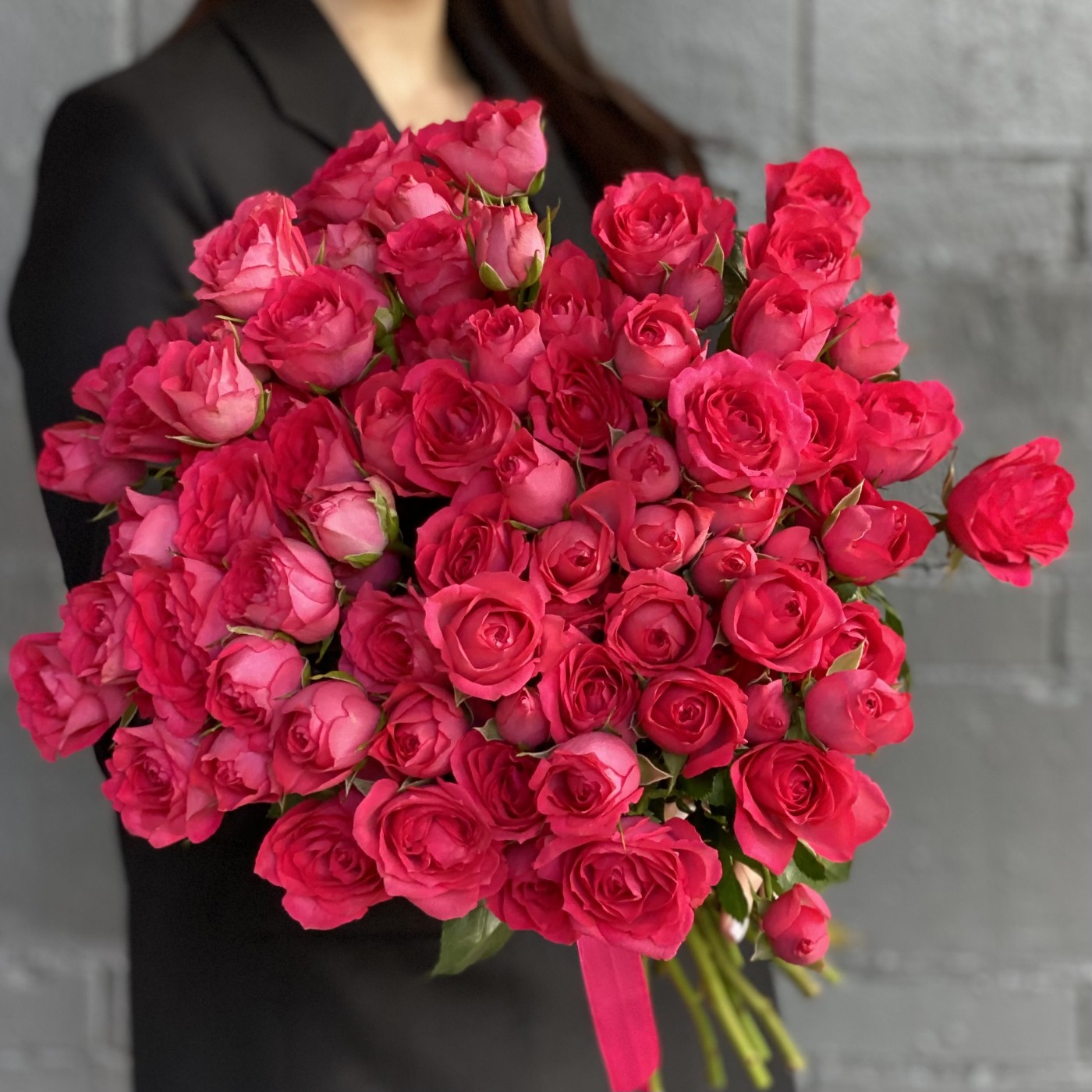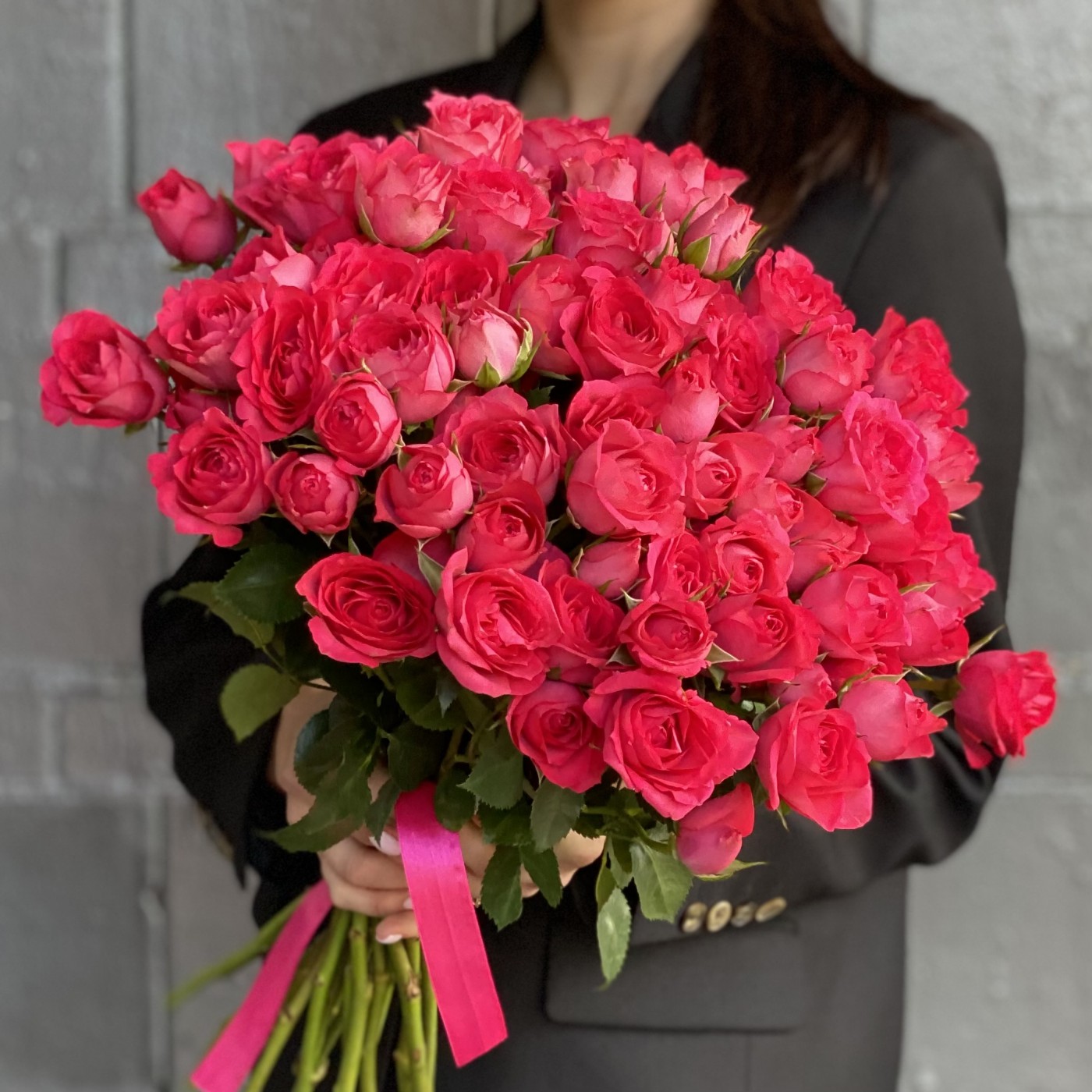 Анна о заказе: 51 малиновая розаСпасибо! Букет великолепный! Цветы свежайшие, упругие, очень красивые, крупные. Добавлено 4 коралловые розы и зелень