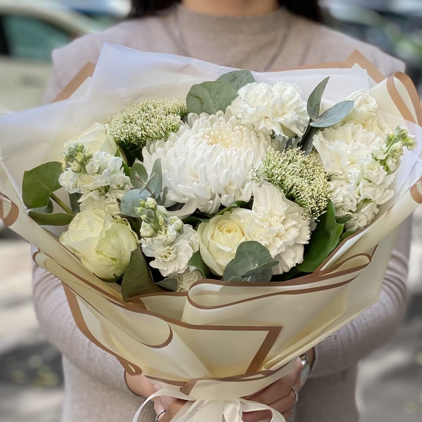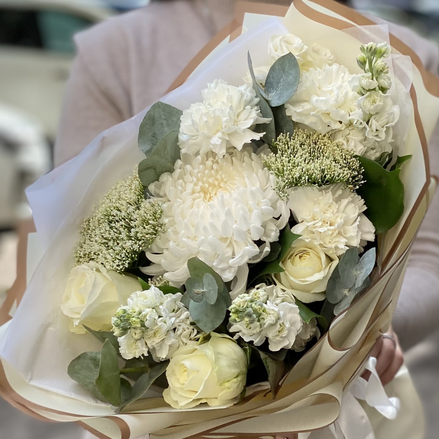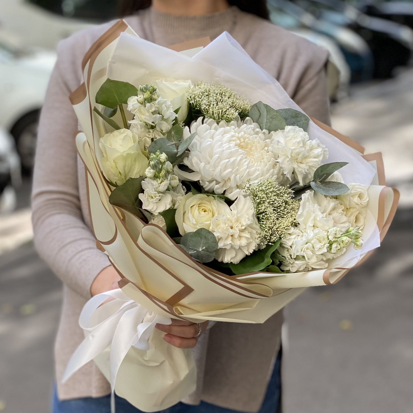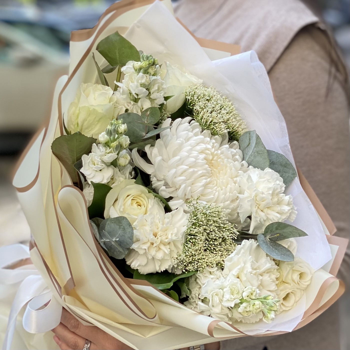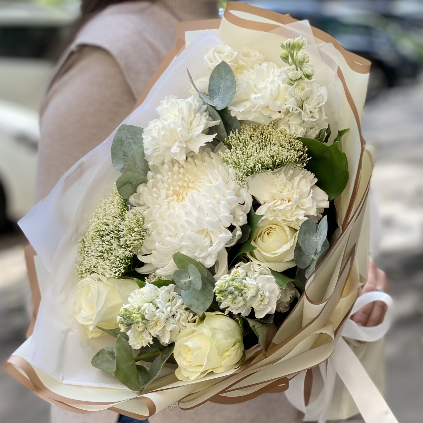 Светлый и воздушный букет с белой хризантемой, розой и маттиолой. Для утончённых натур сошедших со страниц Бунинских рассказов.