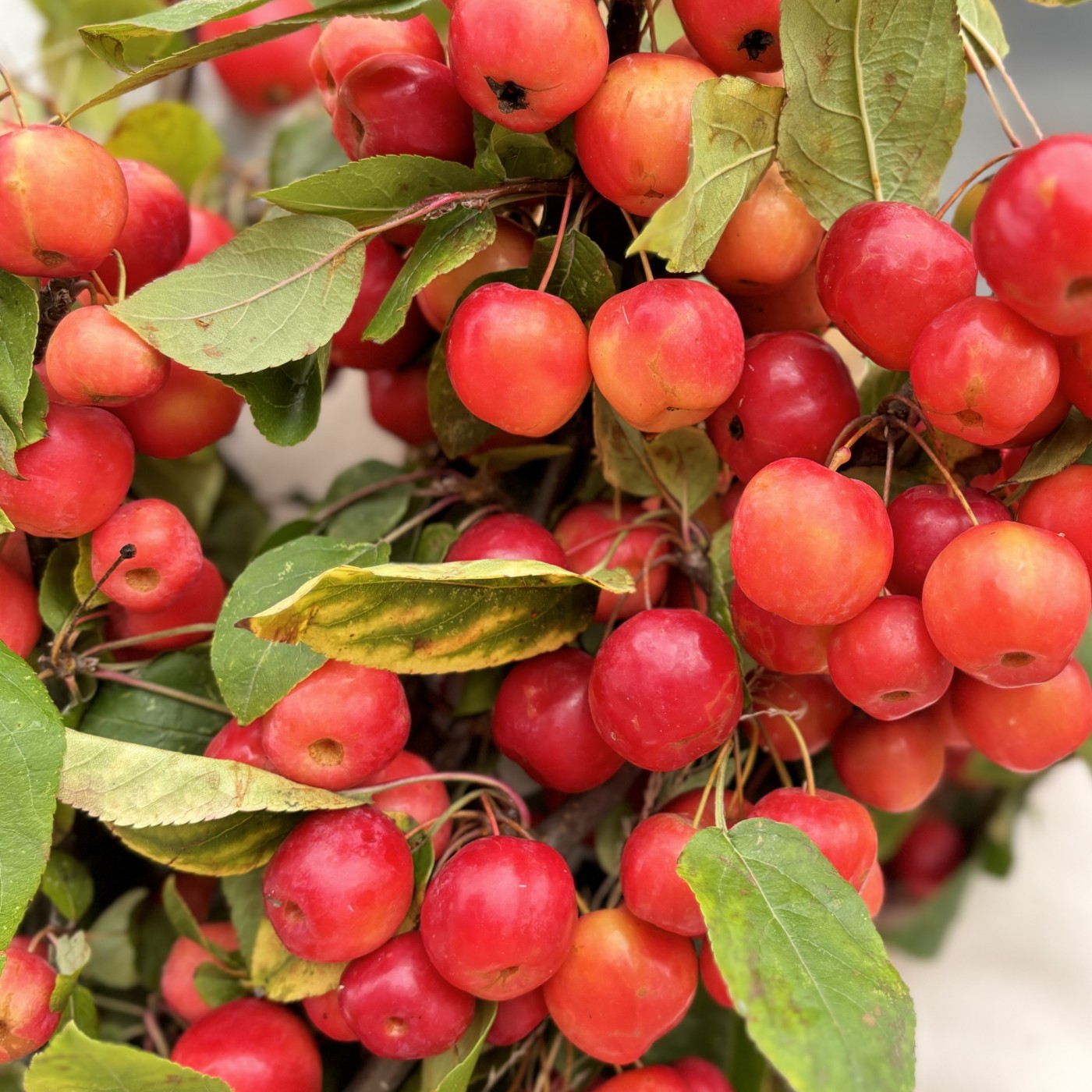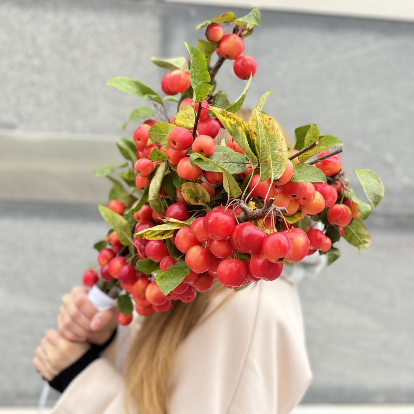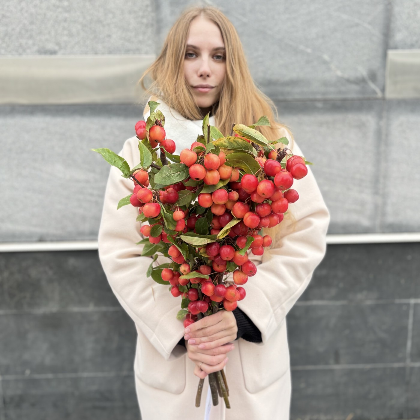Плоды малуса небольшого размера, с яркой окраской станут стильным дополнение к букету или станут интересным элементом интерьера.
