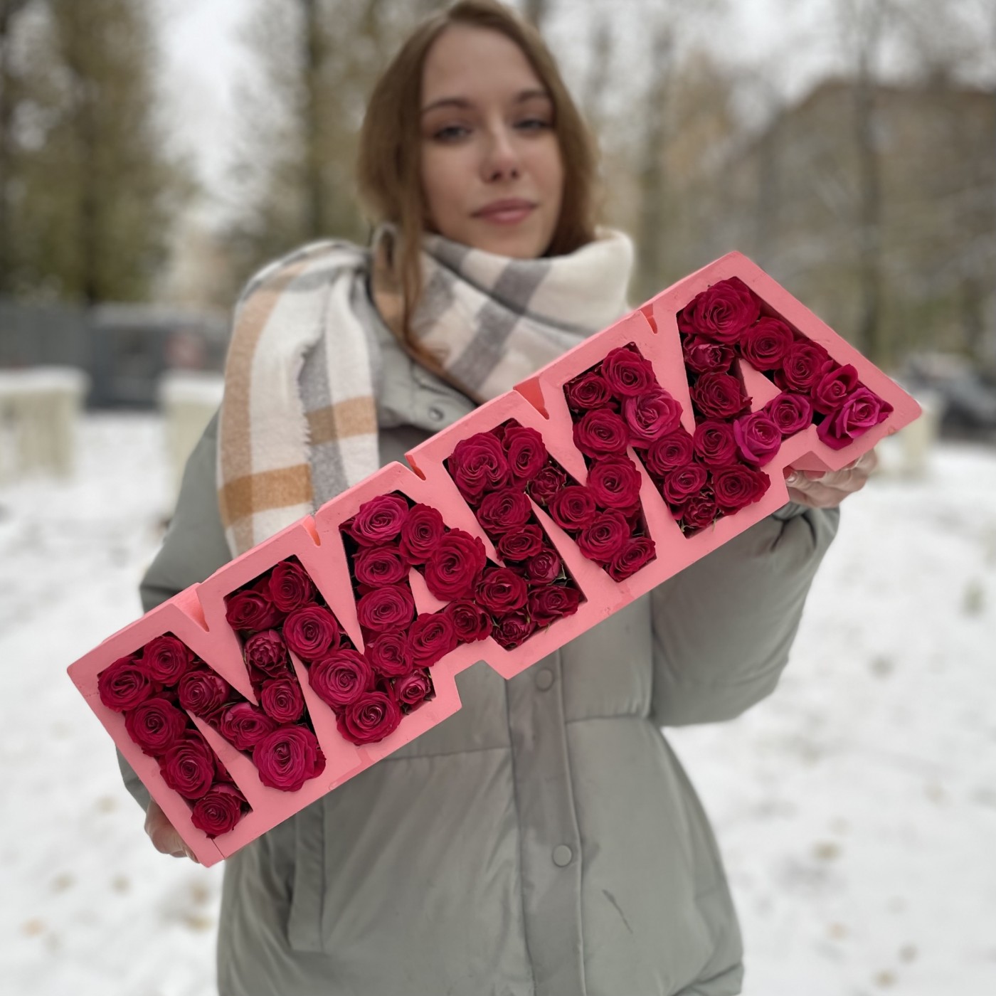 Коробка с надписью Мама из малиновых роз