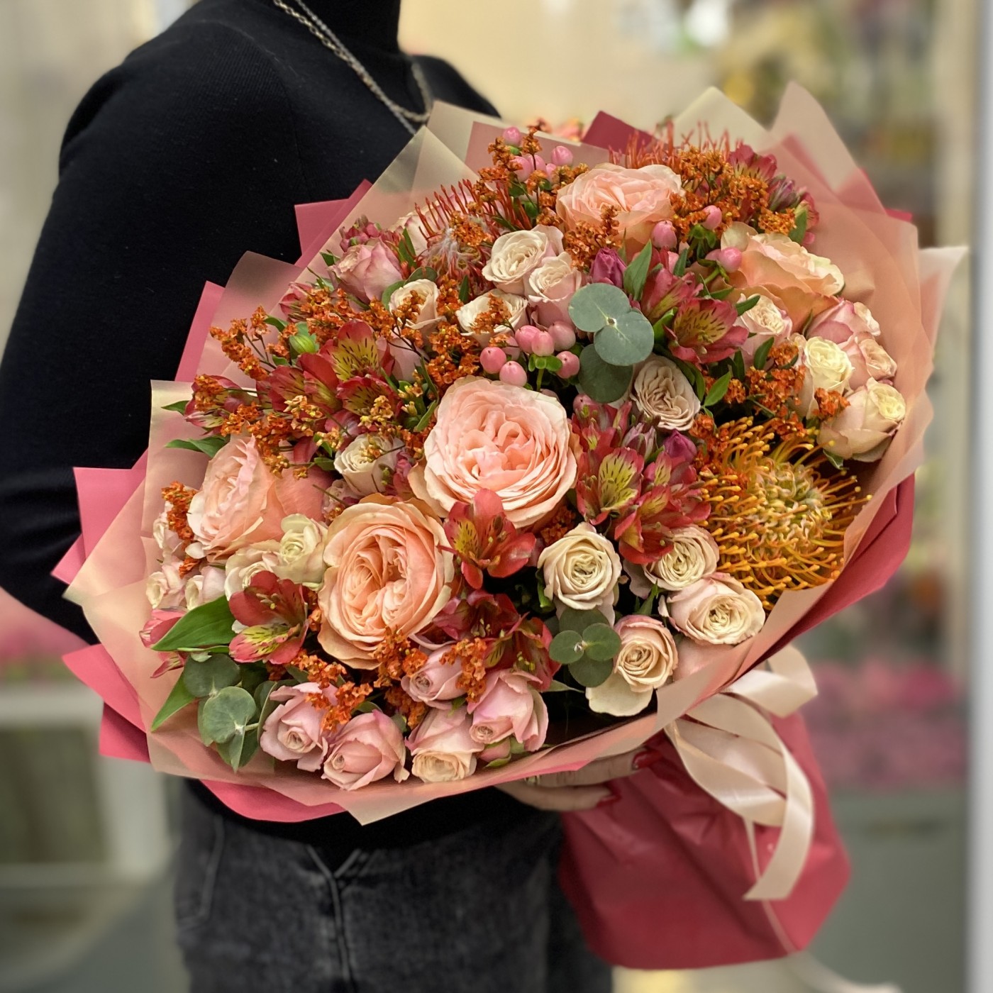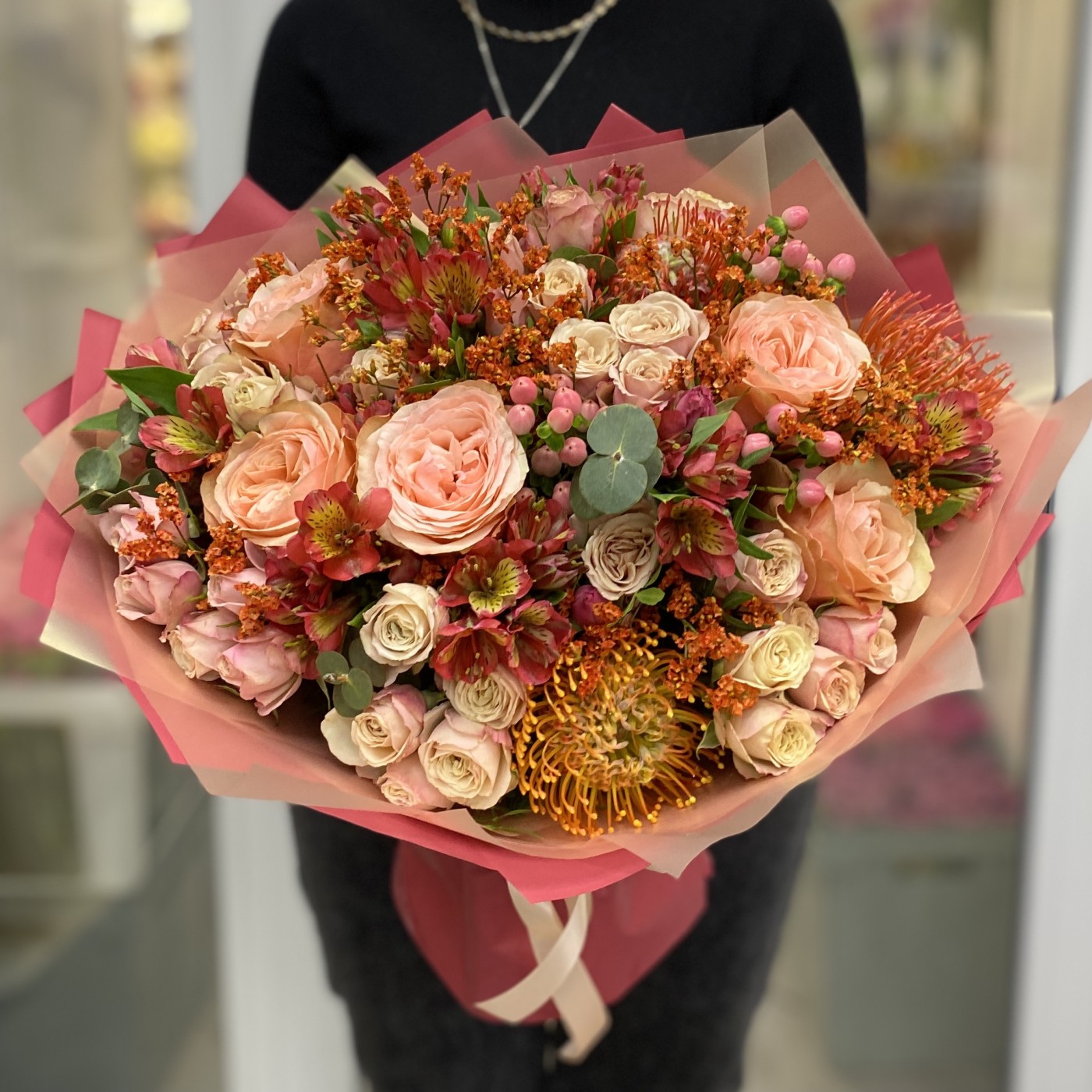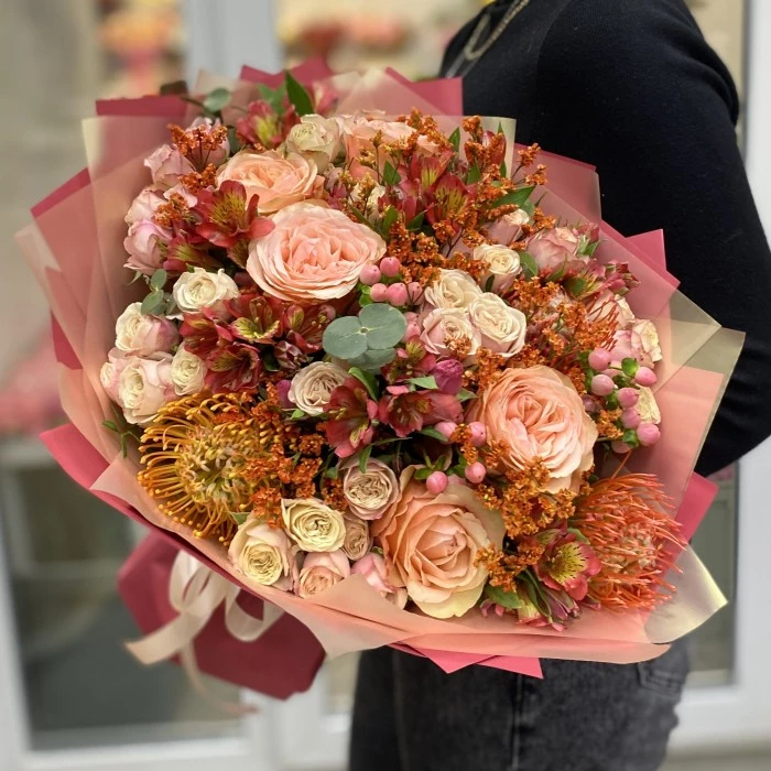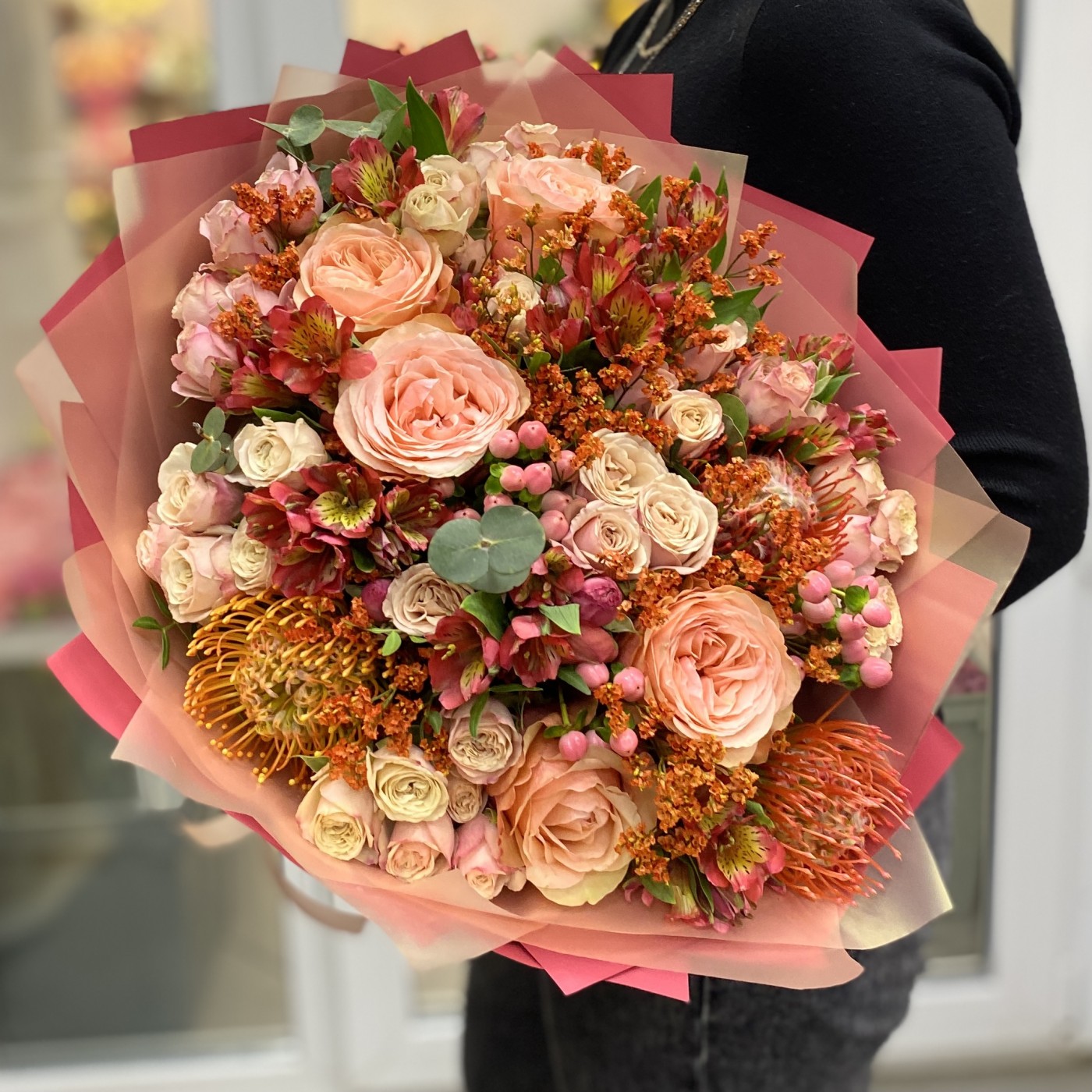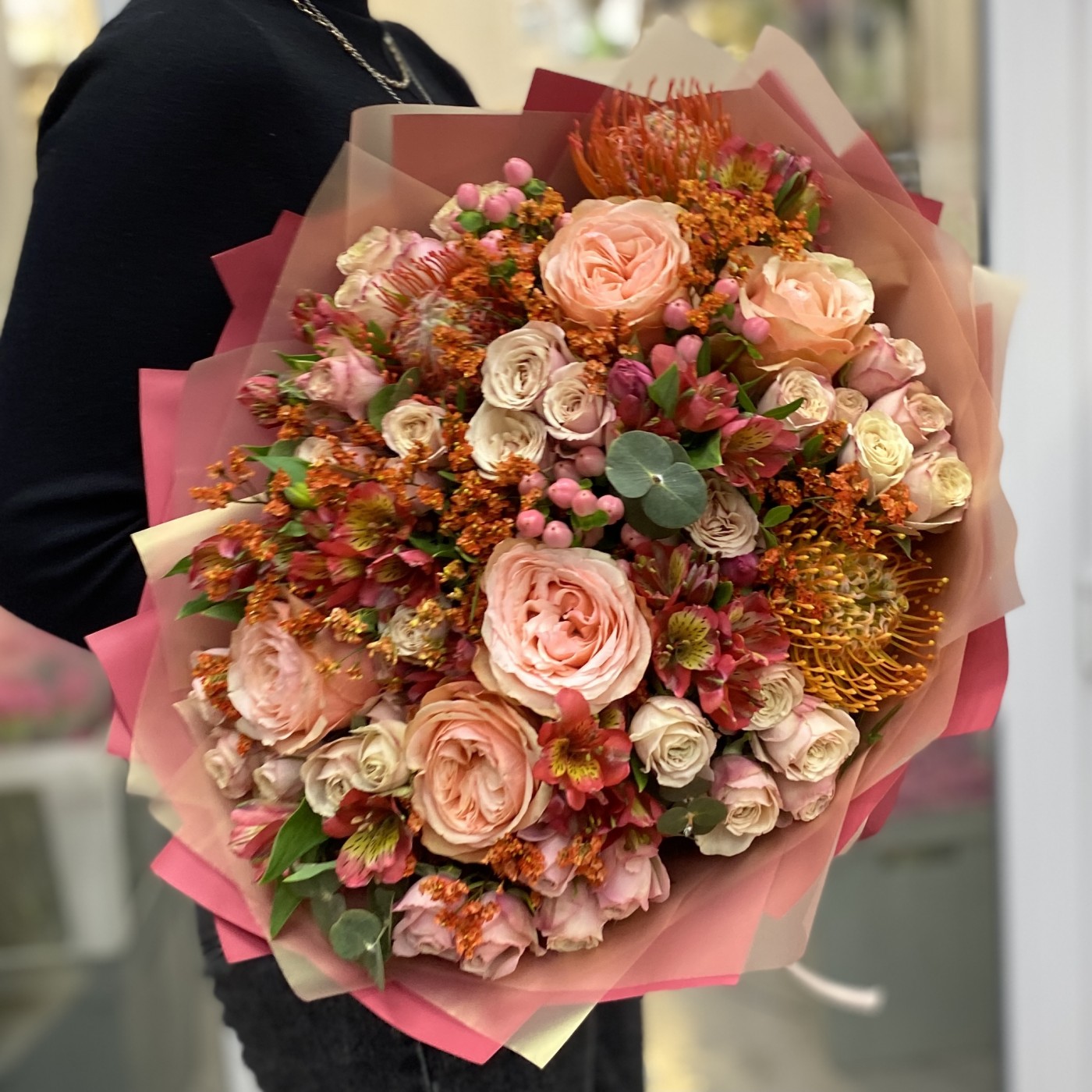 Фактурный и интересный букет в приглушенных тонах с необычной экзотичным составом.