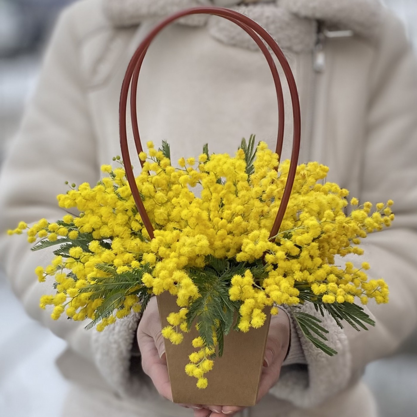 Небольшая композиция из пушистых желтых мимоз - первый знак весны, приближающегося тепла и яркого солнечного света, который Вы можете подарить любимым и дорогим людям.