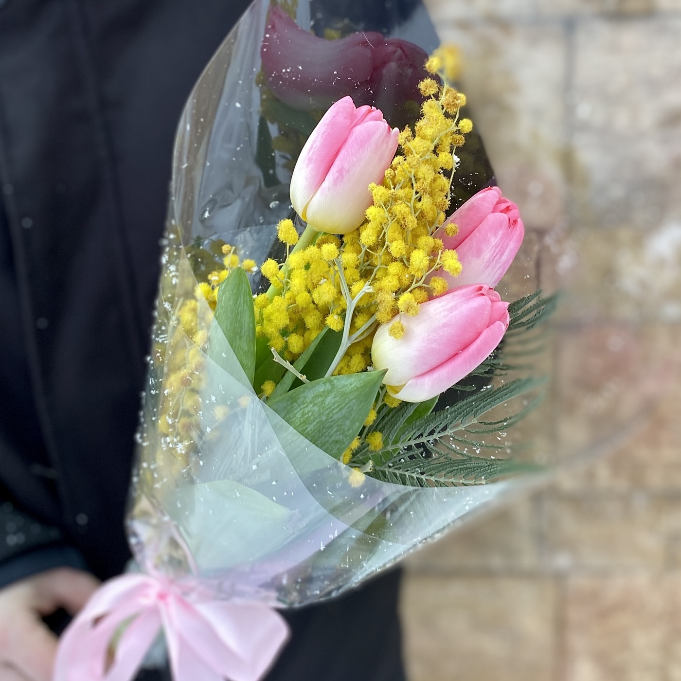 Мини букет из яркой мимозы и тюльпанов. Прекрасно подойдет для корпоративных мероприятий на 8 марта или любой другой повод.
