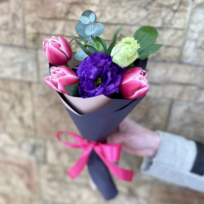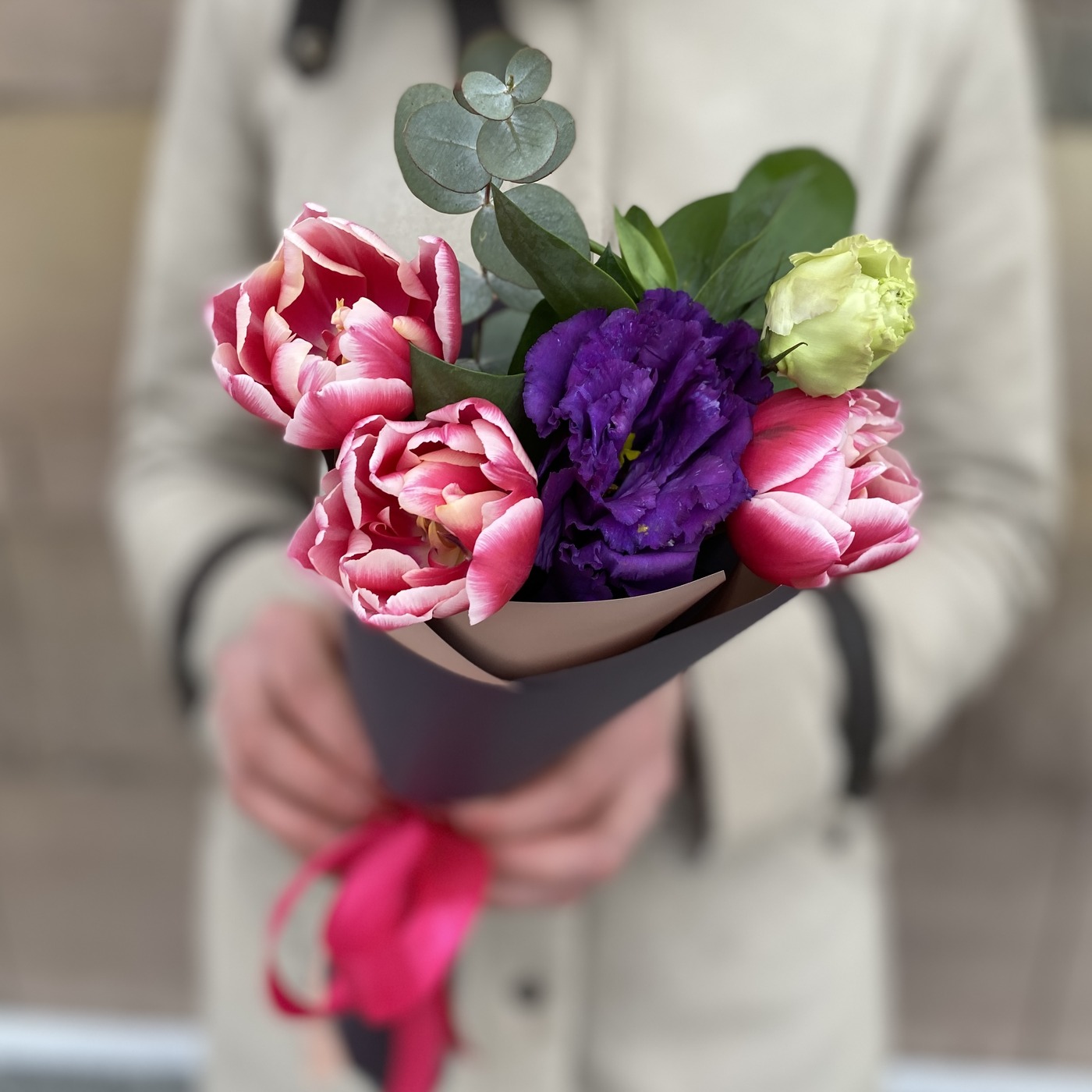 Небольшой букетик из тюльпанов в сочетании с эустомой и ароматным эвкалиптом – прекрасный подарок для сотрудников, коллег, людей, которым хочется сделать комплимент.