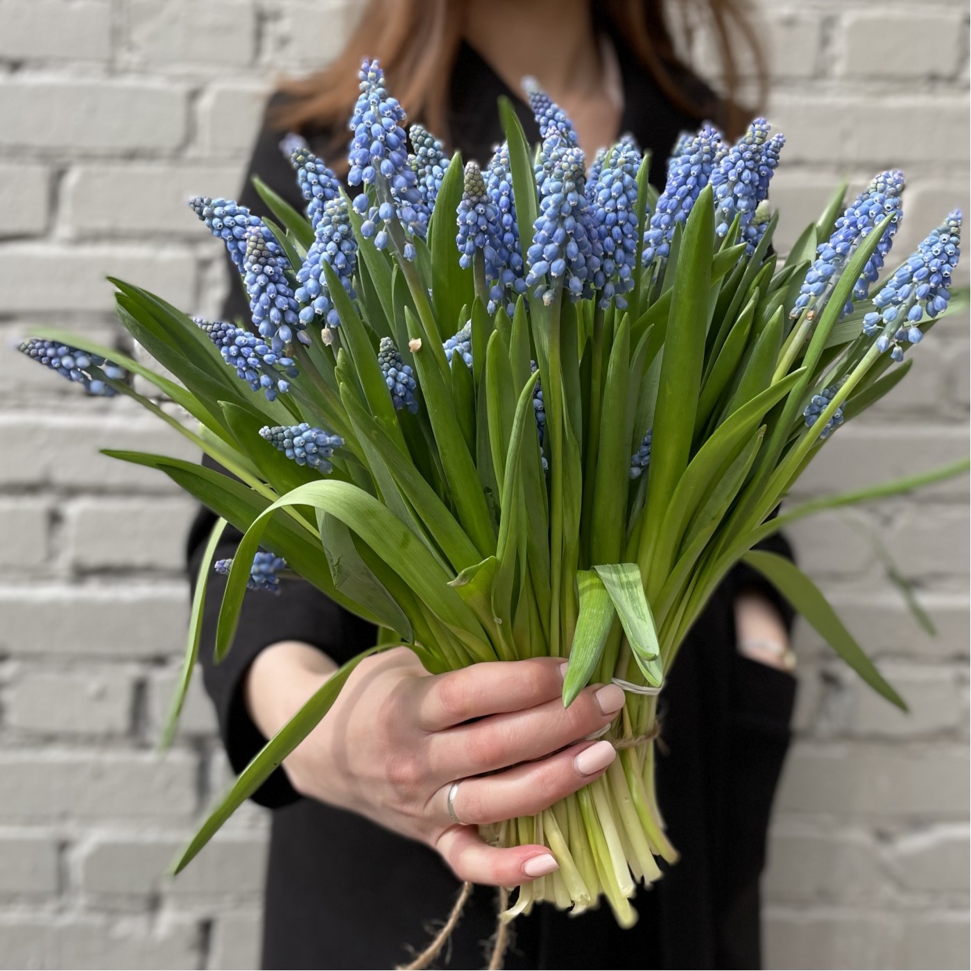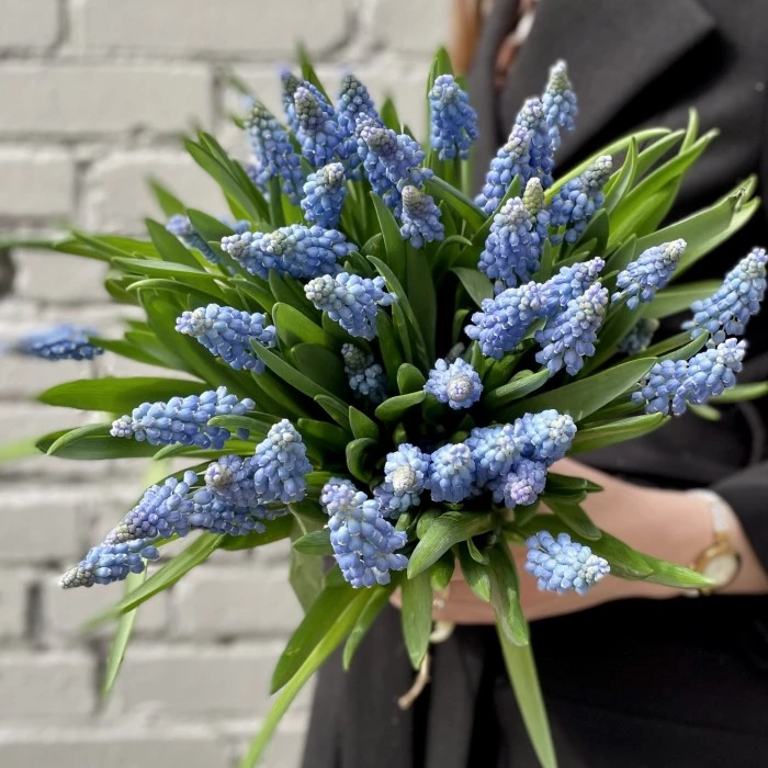 Нежные весенние цветы Мускари голубого цвета. Купить можно поштучно для дополнения к букету или композиции или приобрести их как самостоятельный букет. Они прекрасно смотрятся в вазе в качестве интерьерного букета.