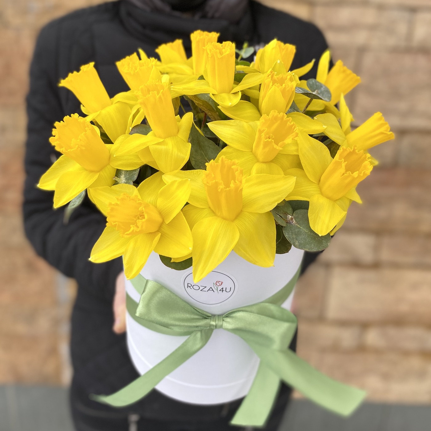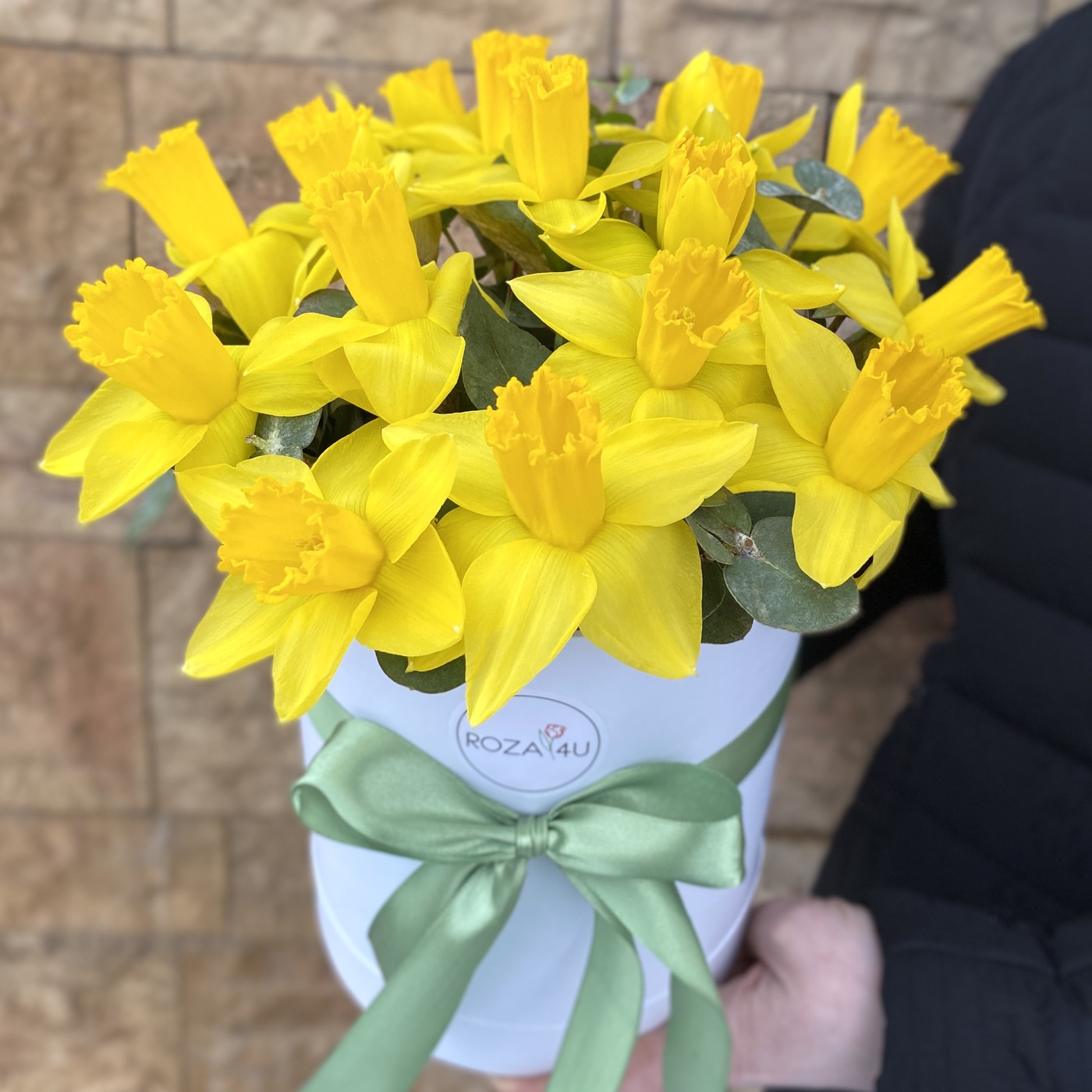 Солнечная монокомпозиция из нарциссов с эвкалиптом доступна к заказу. Подарите цветы любимым и поздравьте со знаменательным событием близкого человека.