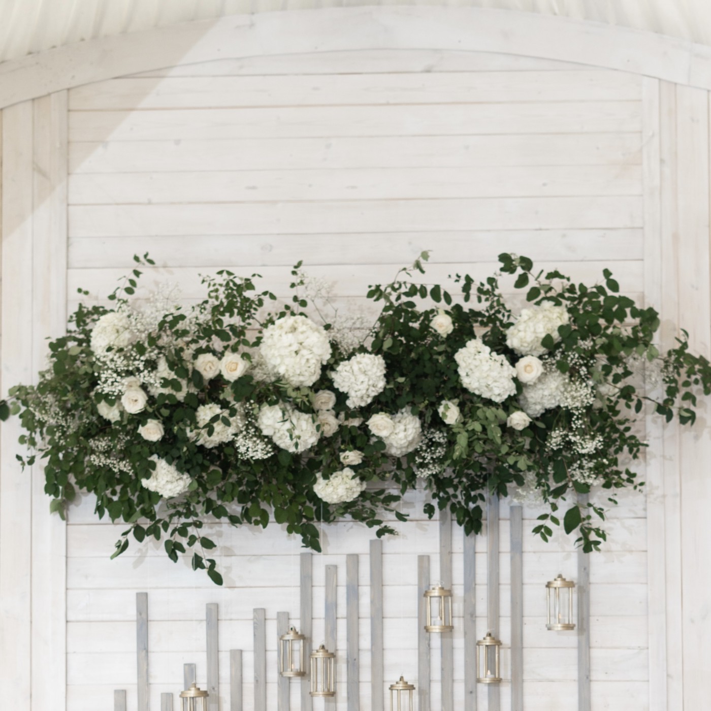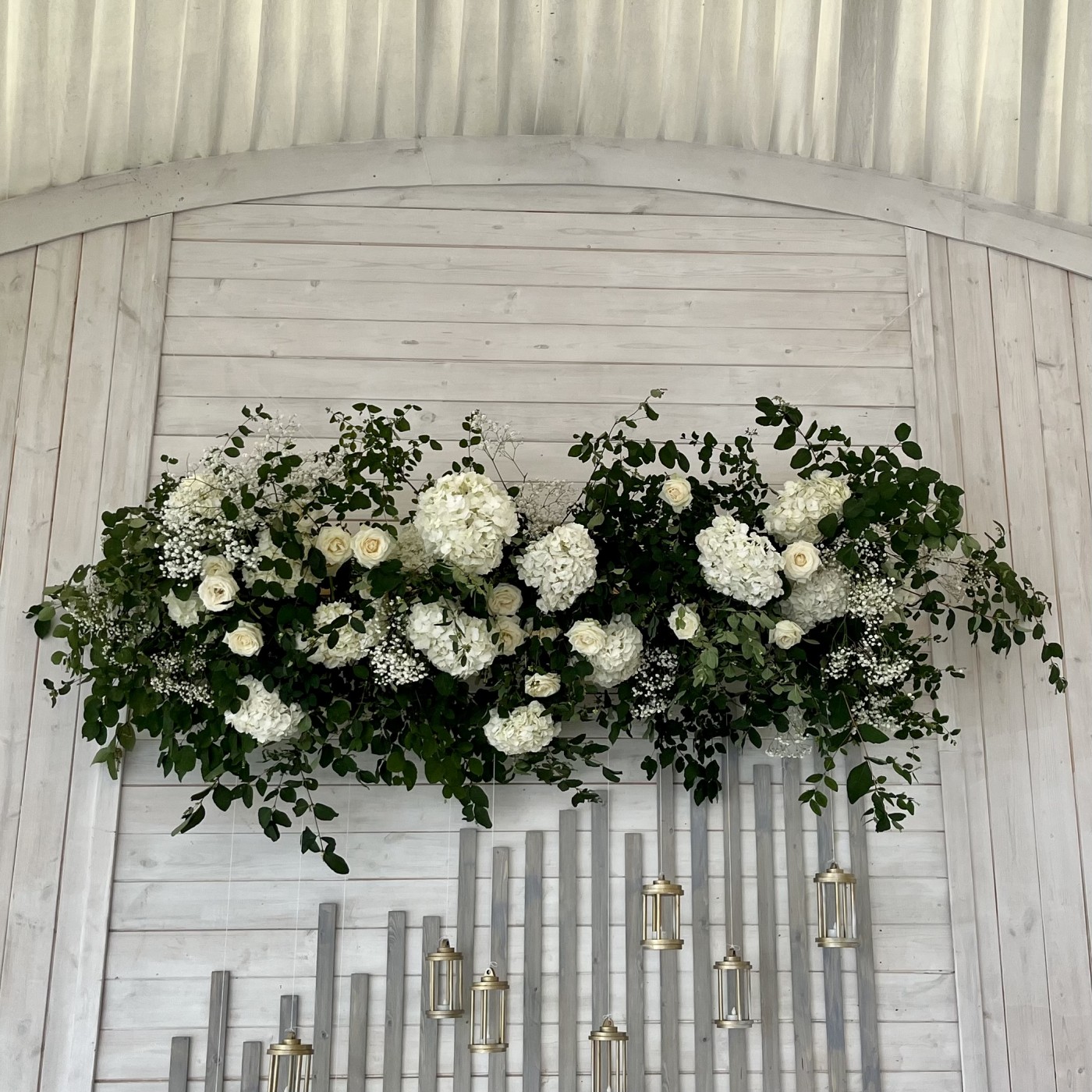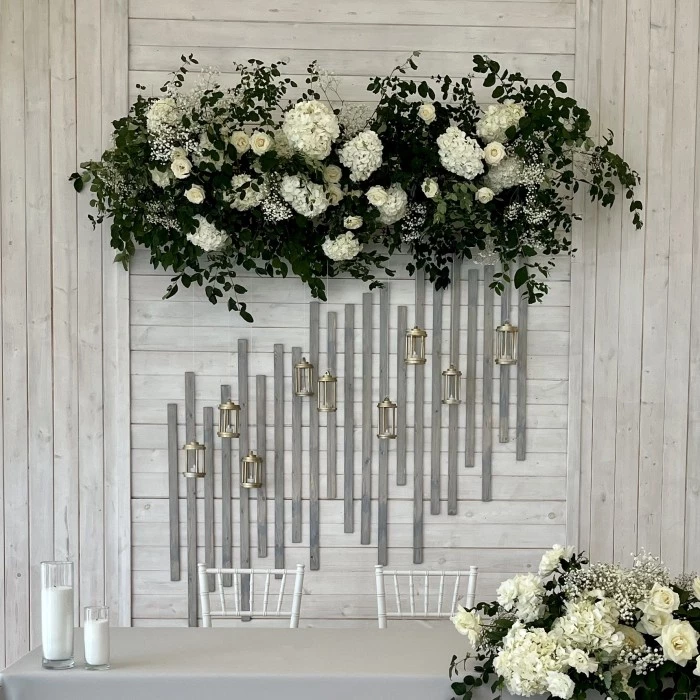 Президиум (или стол) молодоженов принято украшать живыми цветами. Эта настенная композиция из белых гортензий и роз — стильный вариант, который отлично впишется в интерьер любого банкетного зала. Яркая зелень удачно подчеркивает нежность бутонов и придает композиции особый шарм. Фотографии на фоне такой красоты получаются просто волшебными!