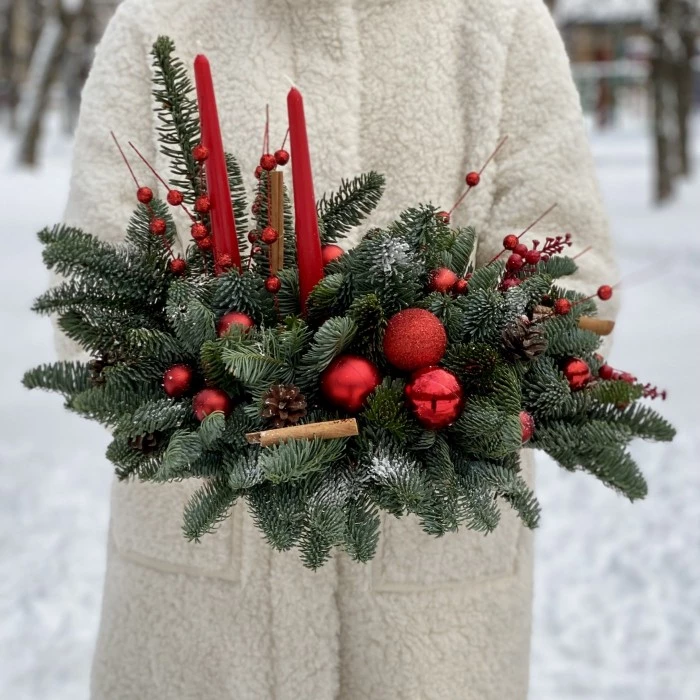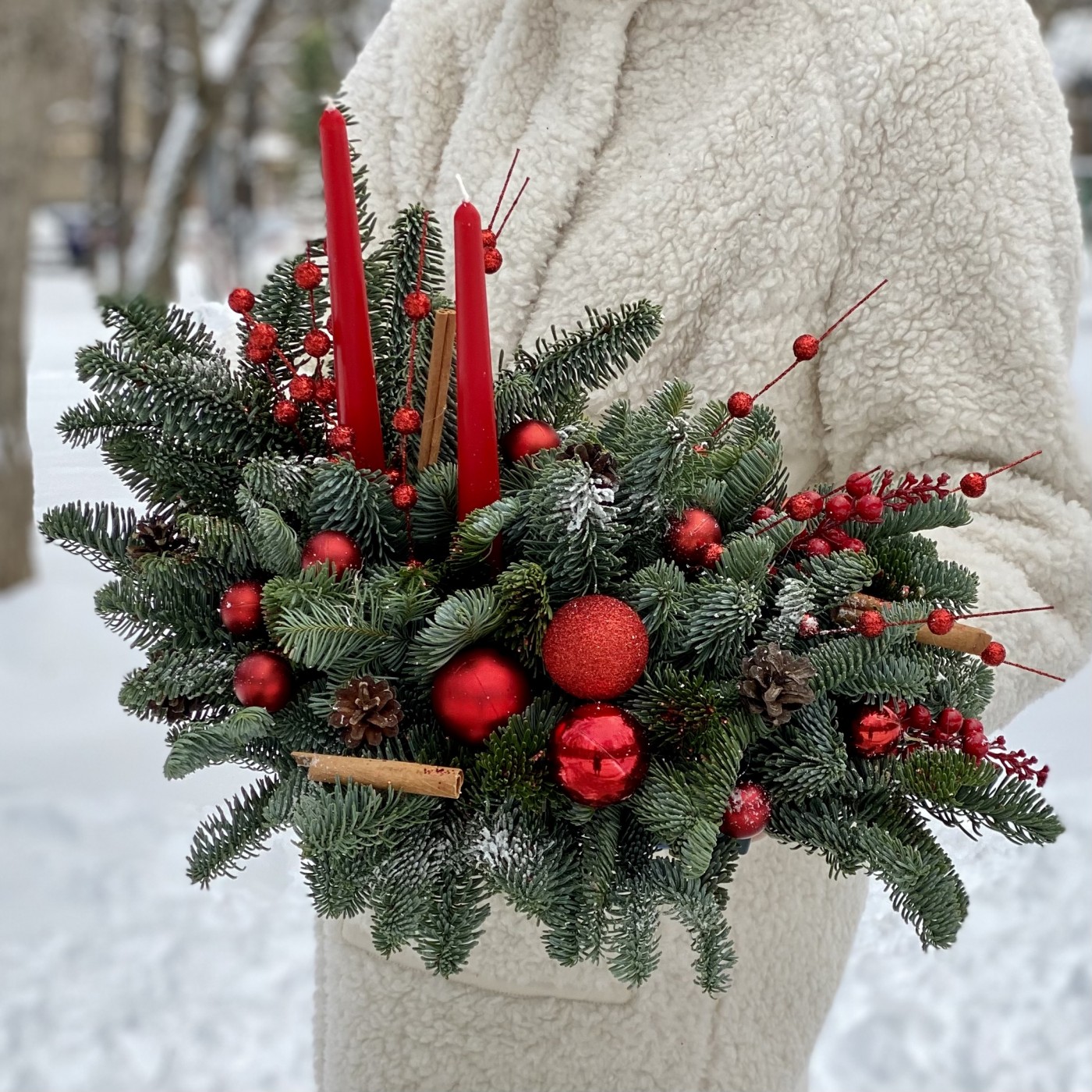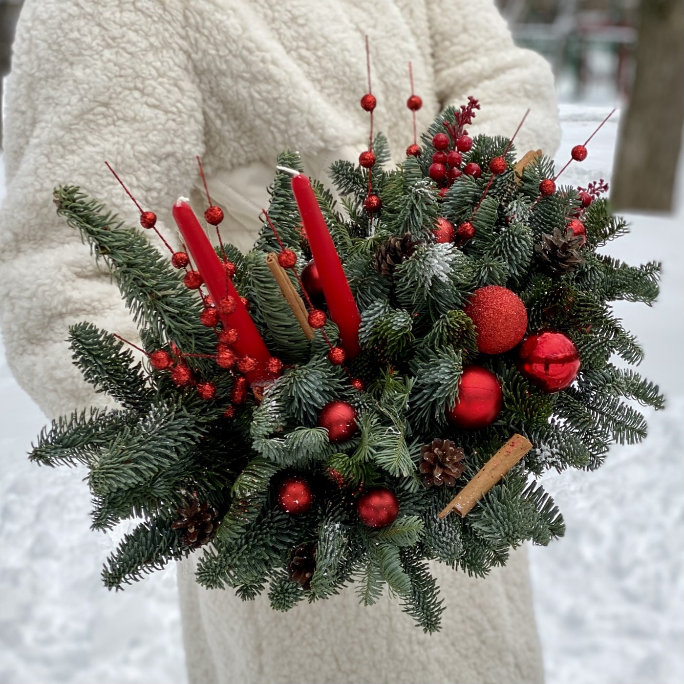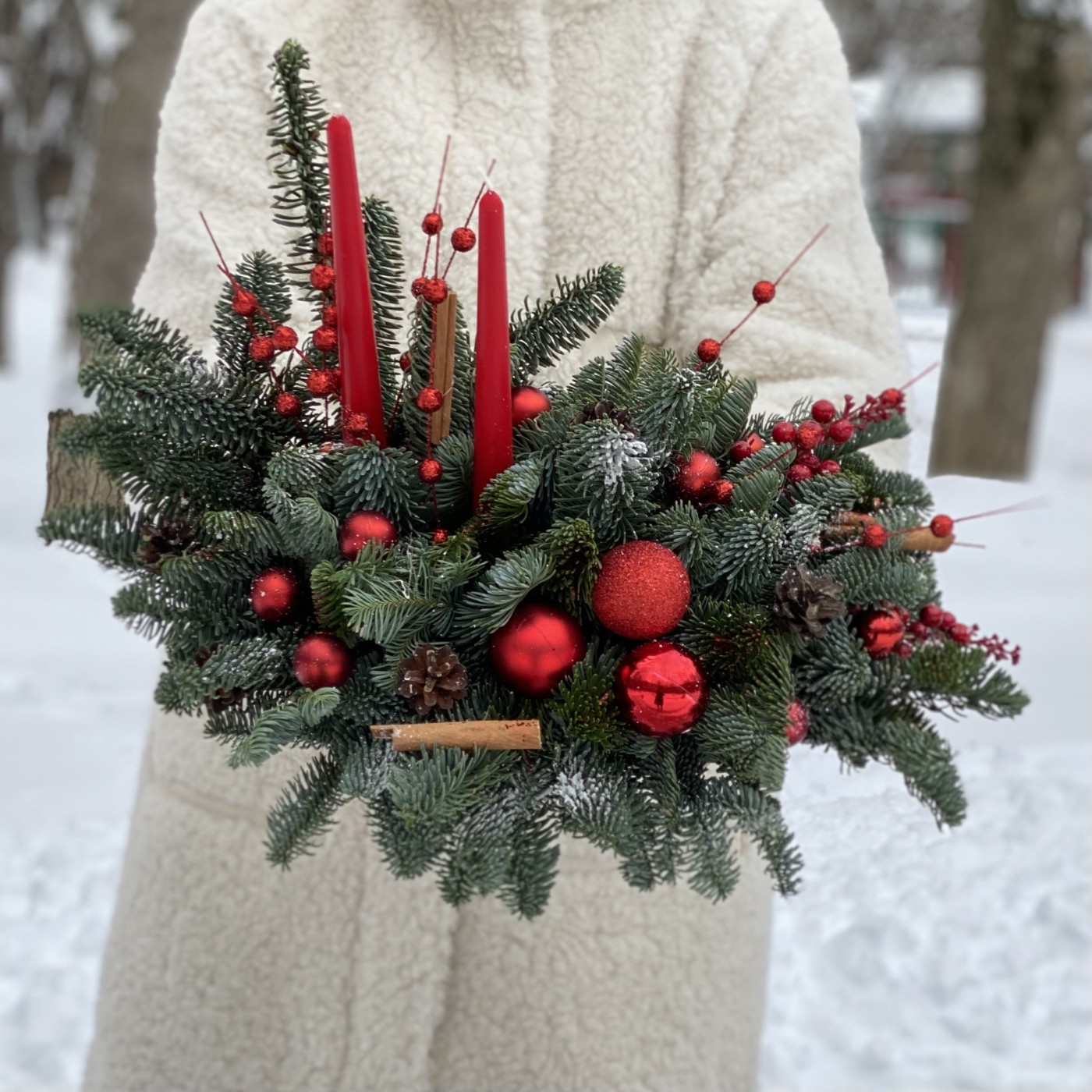 Новогодняя композиция для украшения праздничного стола или ресепшен. Хороший новогодний подарок для сотрудников на работе или вашим любимым людям.