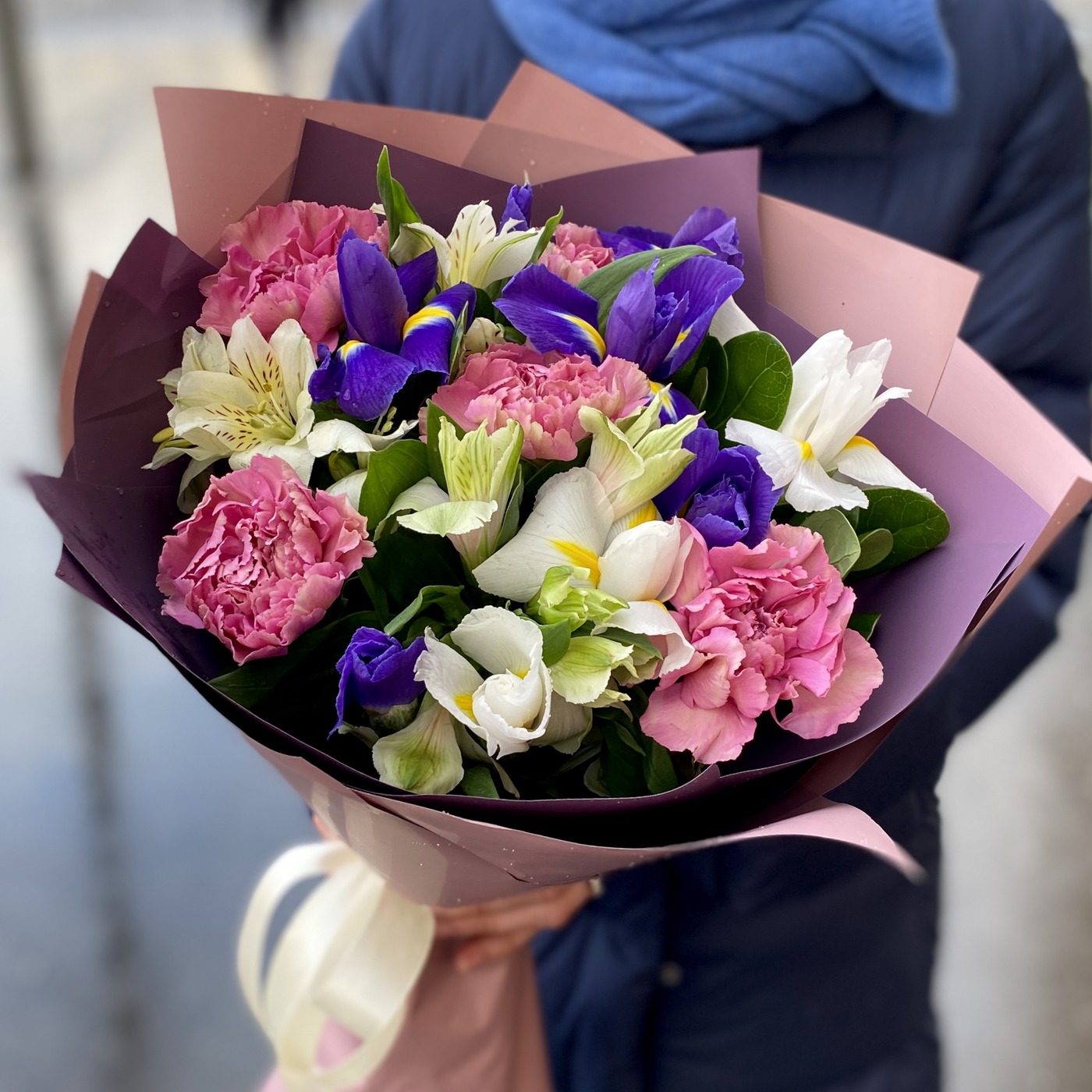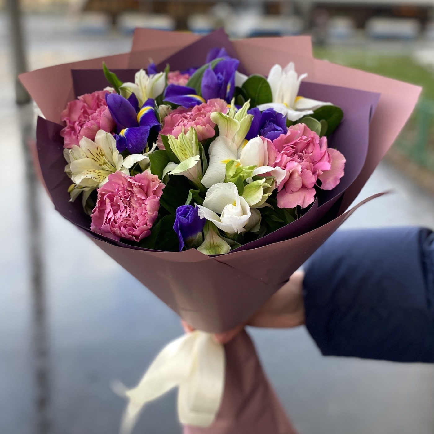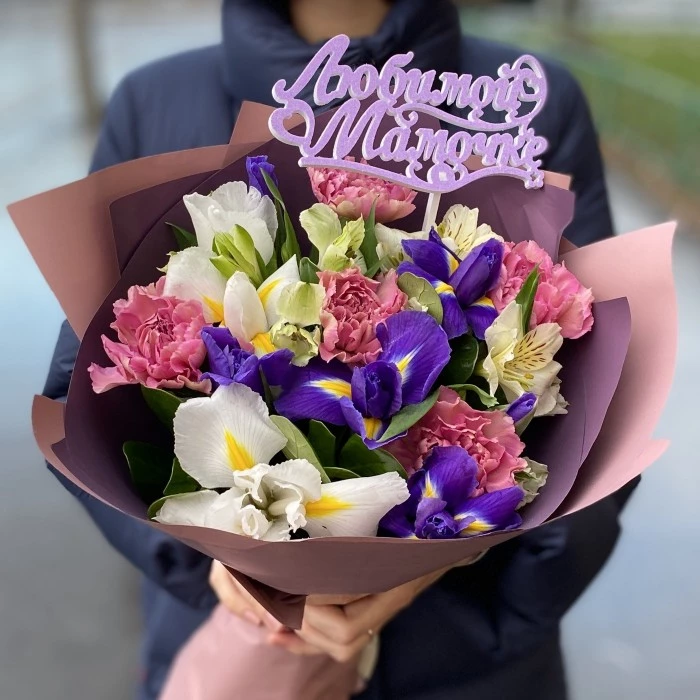 Нежный букет в пастельных оттенках подарит массу эмоций Вашей дорогой мамочке. Подарите букет из нежных ирисов и необычной гвоздики, удивите любимого человека.