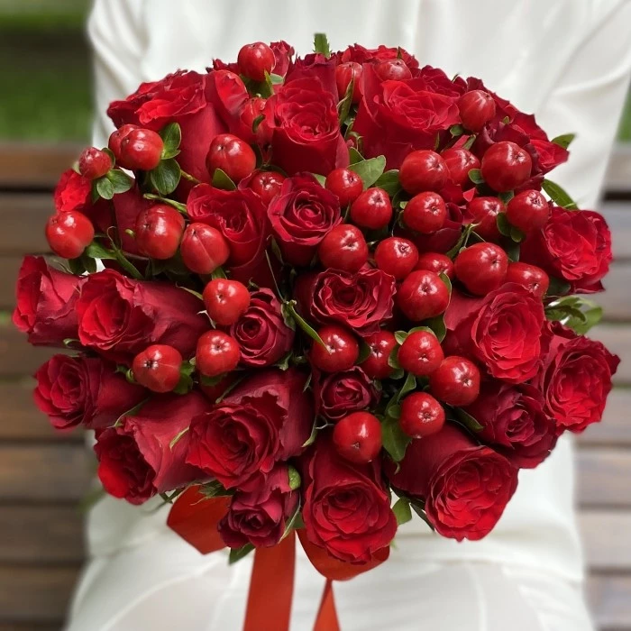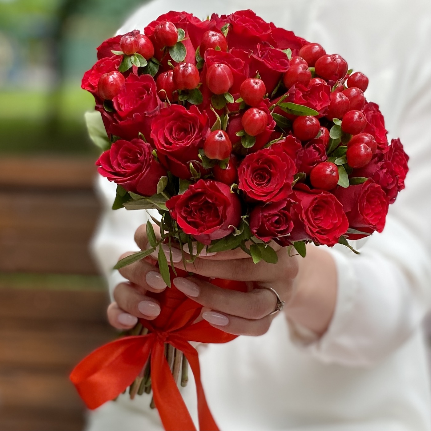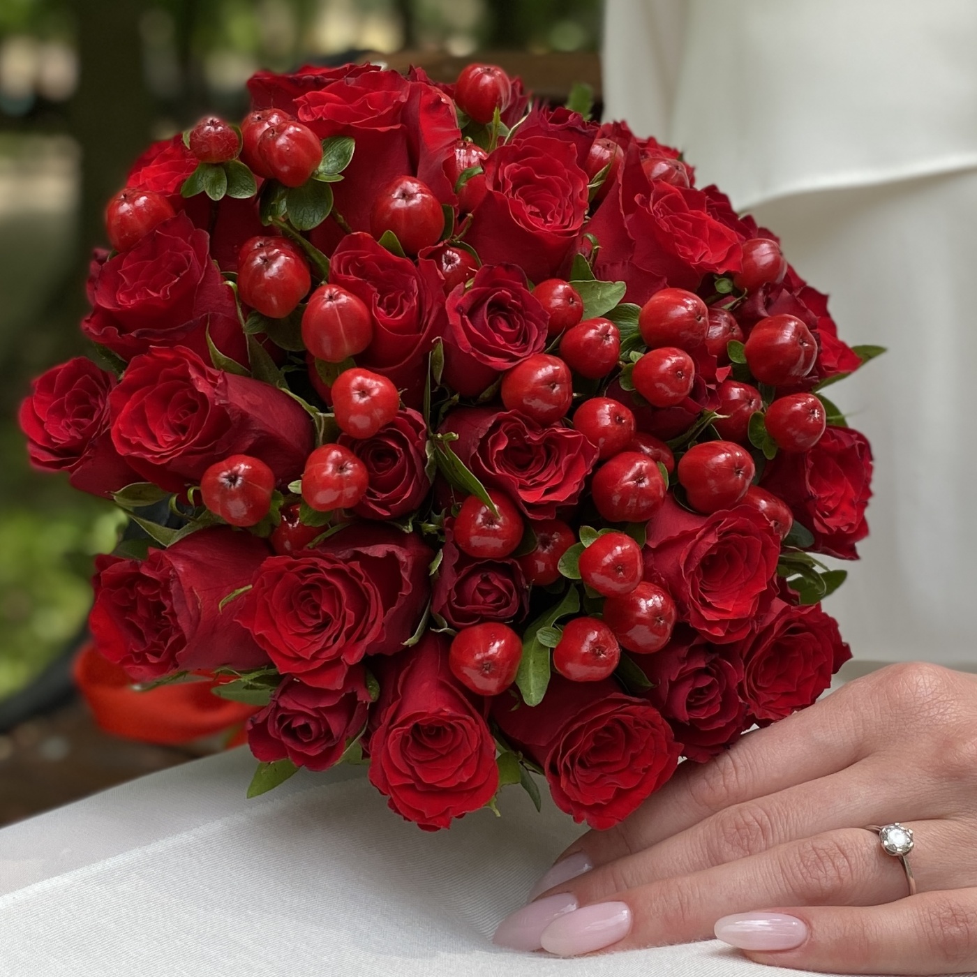 Вроде бы простой классический букет невесты, но ягодки придают ему особый шарм и индивидуальность. Красный, сдержанный букет будет прекрасно смотреться на фоне белого платья.