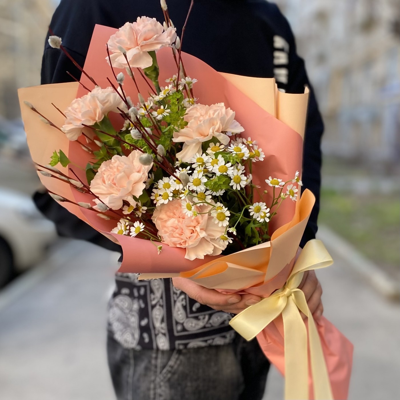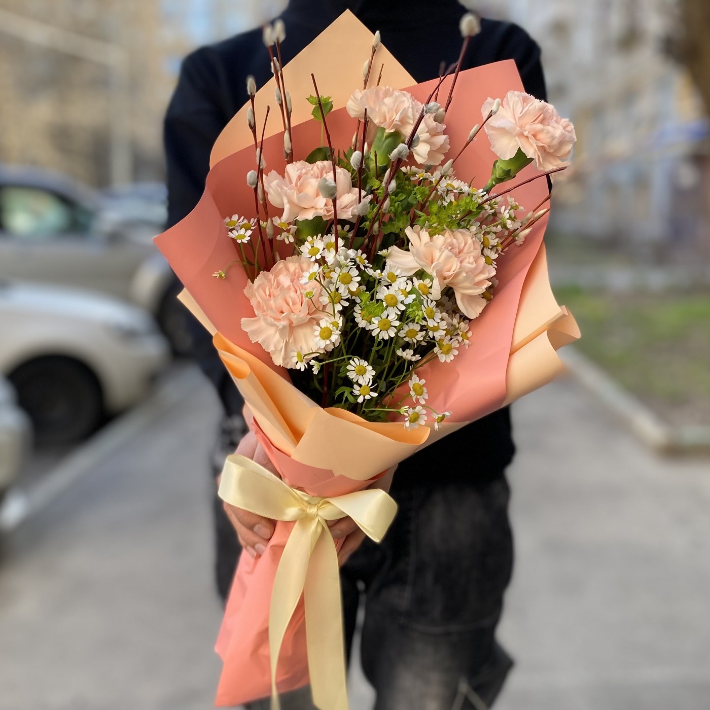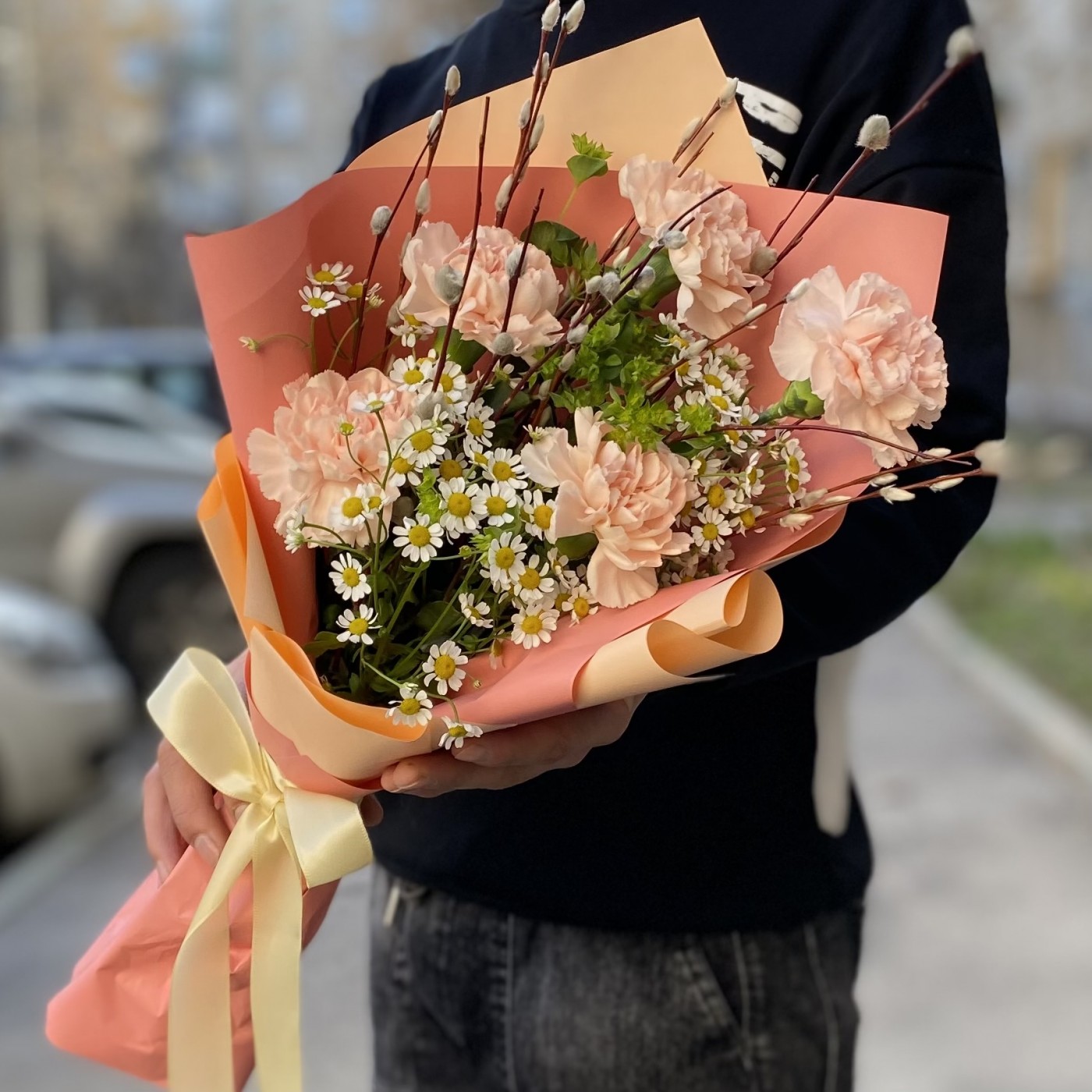 Нежный букет с вербой и диантусами прекрасный комплимент для того чтобы пойти в гости в день вербного воскресенья.