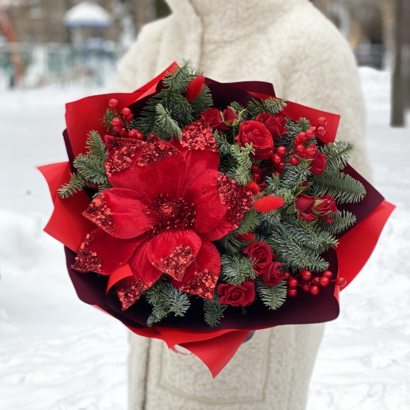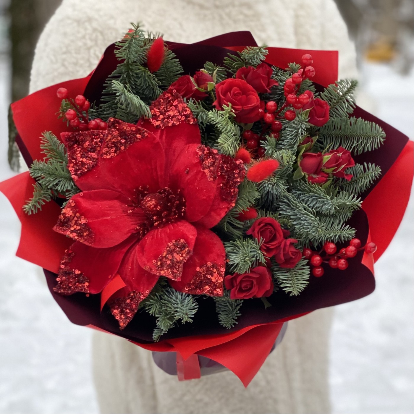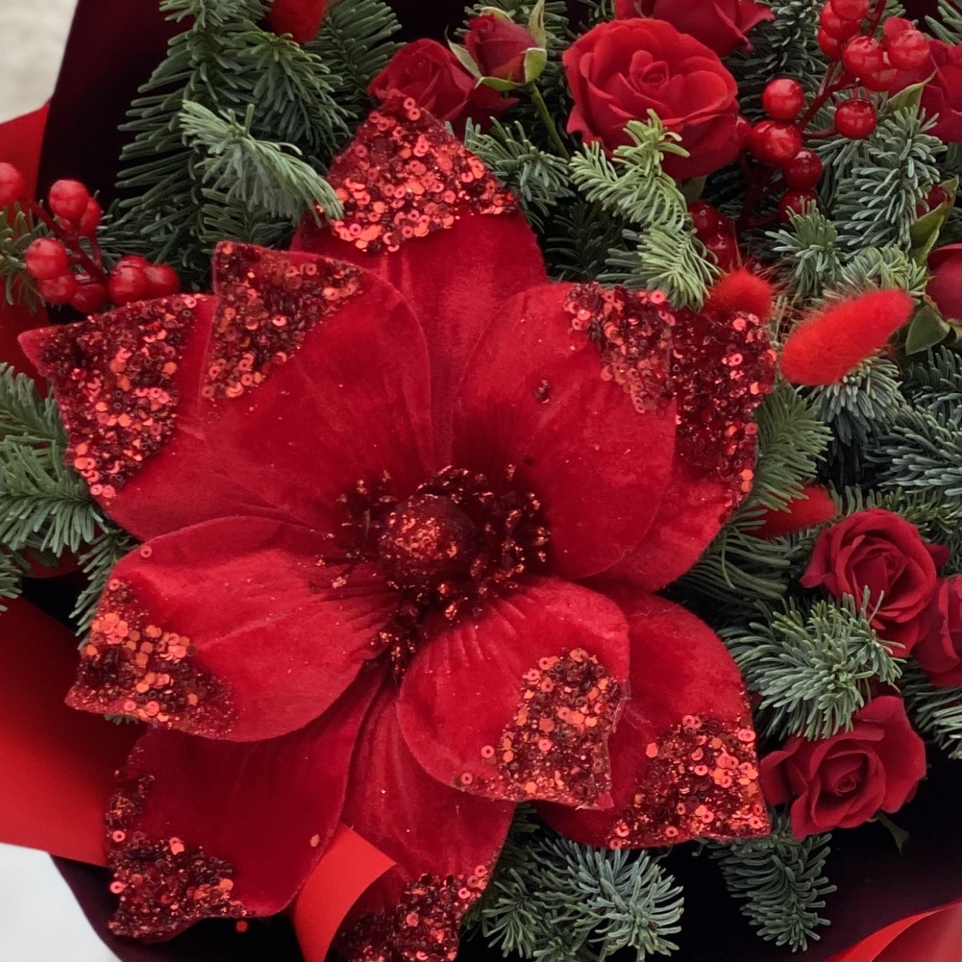 Красный новогодний букет с живым нобилисом и кустовыми розами. Букет украшен праздничными декоративными элементами.