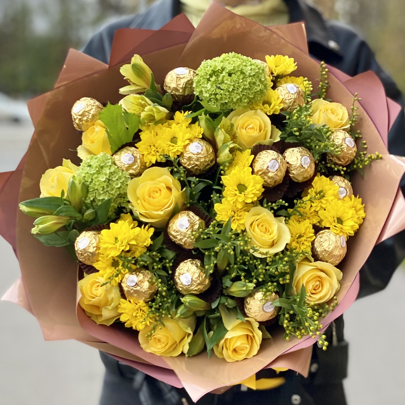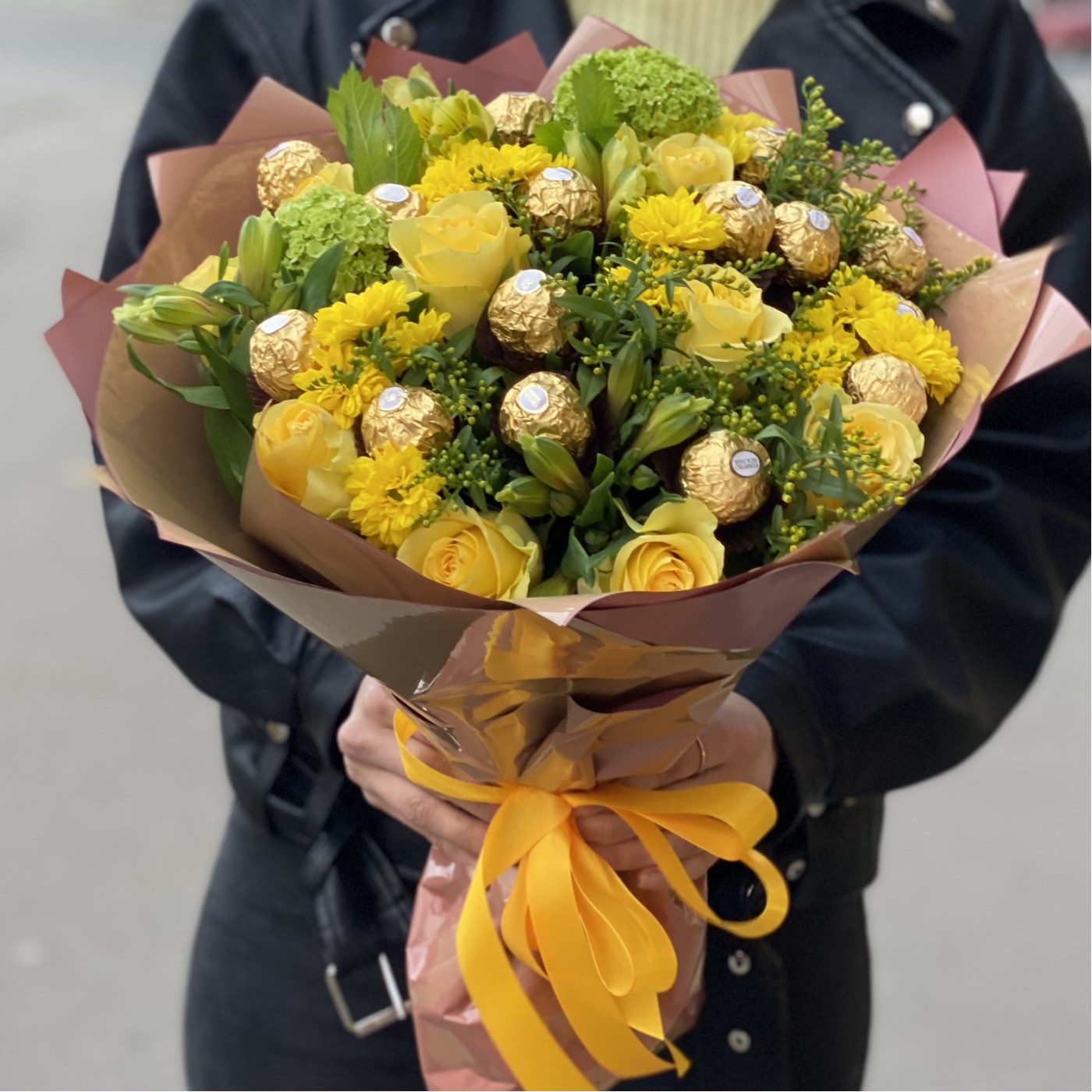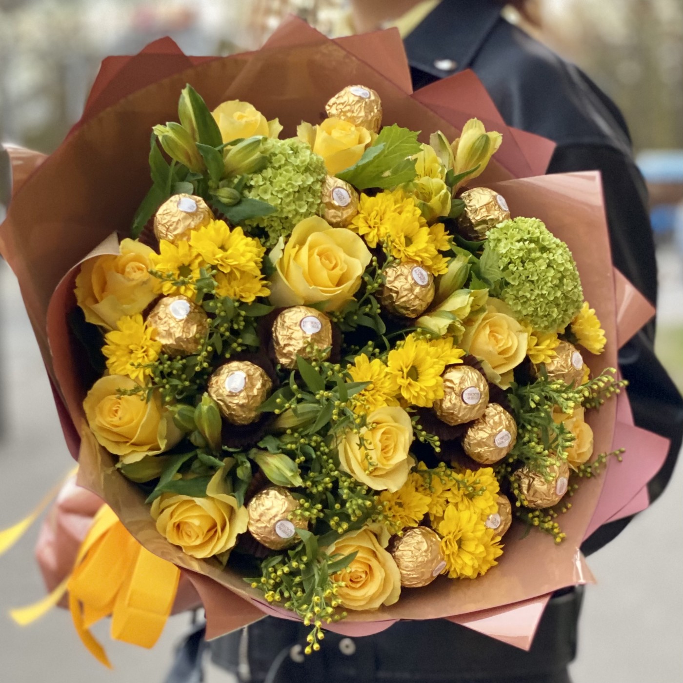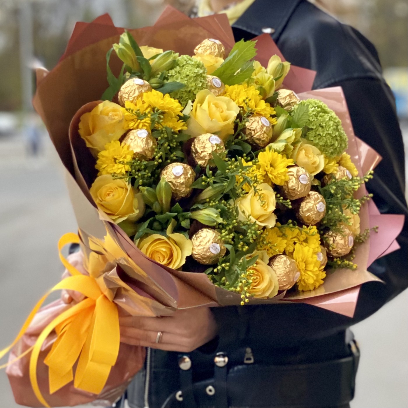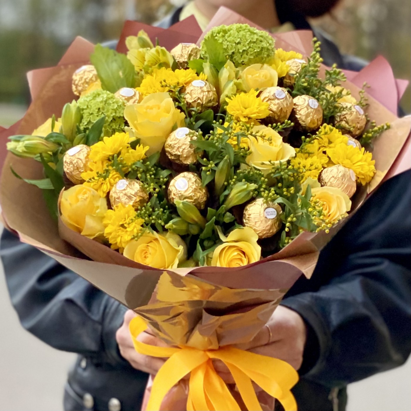 Стильный осенний букет, дополнен любимыми всеми конфетами Ferrero Roche. Сочетание ярко-желтых роз и хризантем с сочной зеленью и шоколадом – верный способ поднять настроение! Глядя на этот букет, вспоминаешь фрагмент из стихотворения А.С.Пушкина: