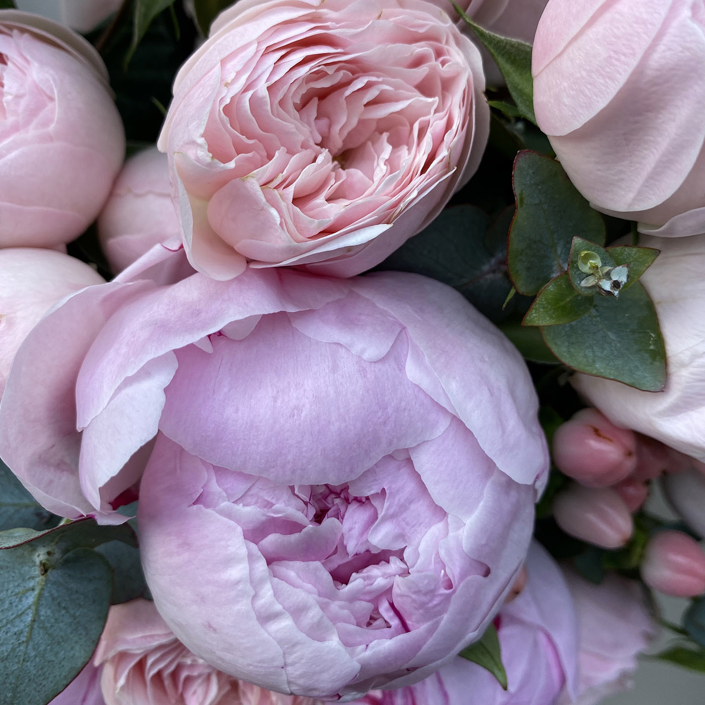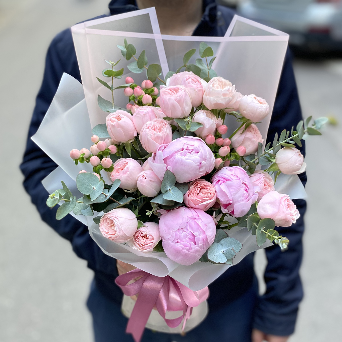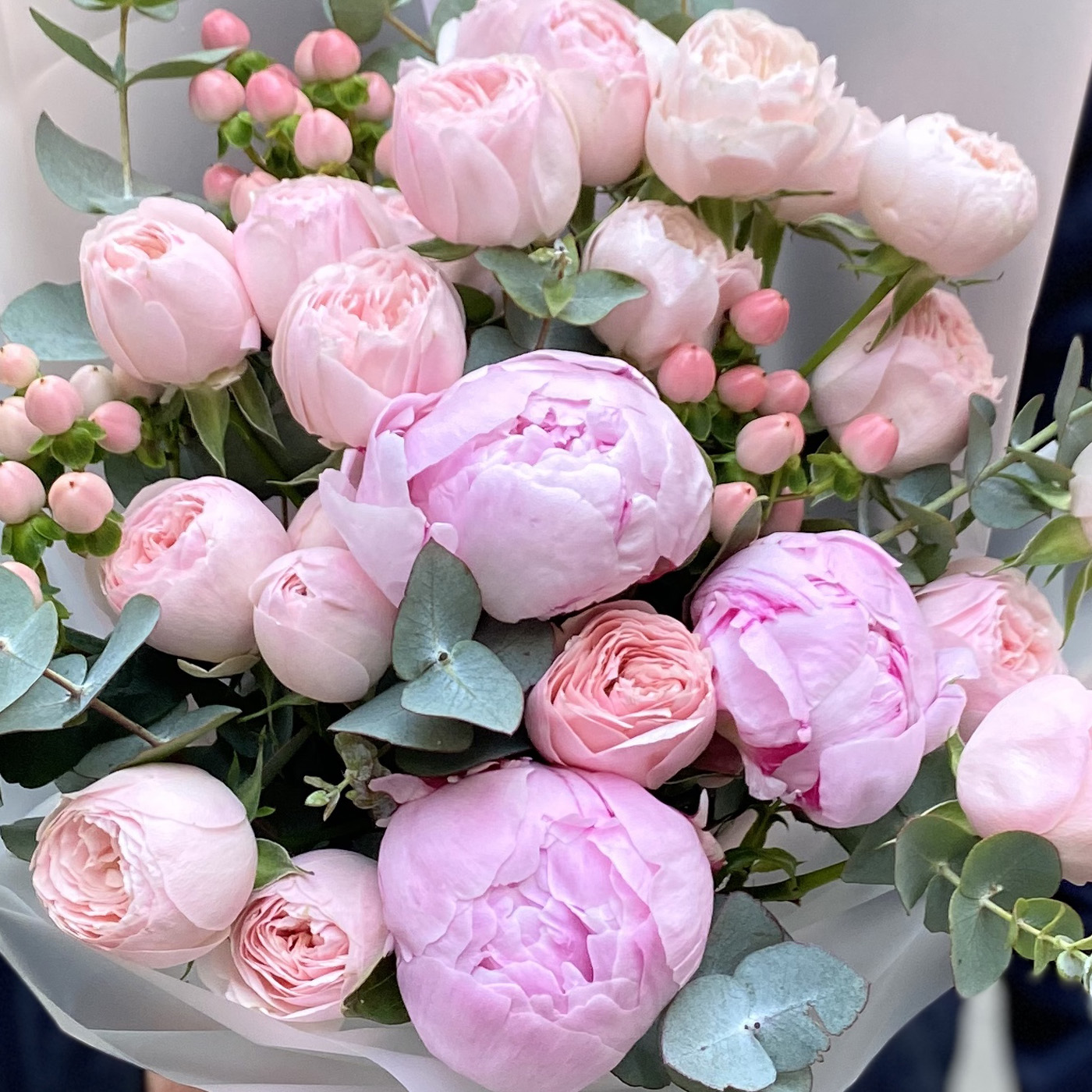 Состав букета: кустовая пионовидная роза – 5 шт, пион – 3 шт, гиперикум – 3 шт, эвкалипт, упаковка.