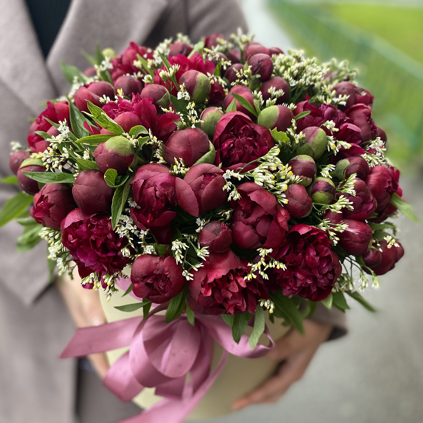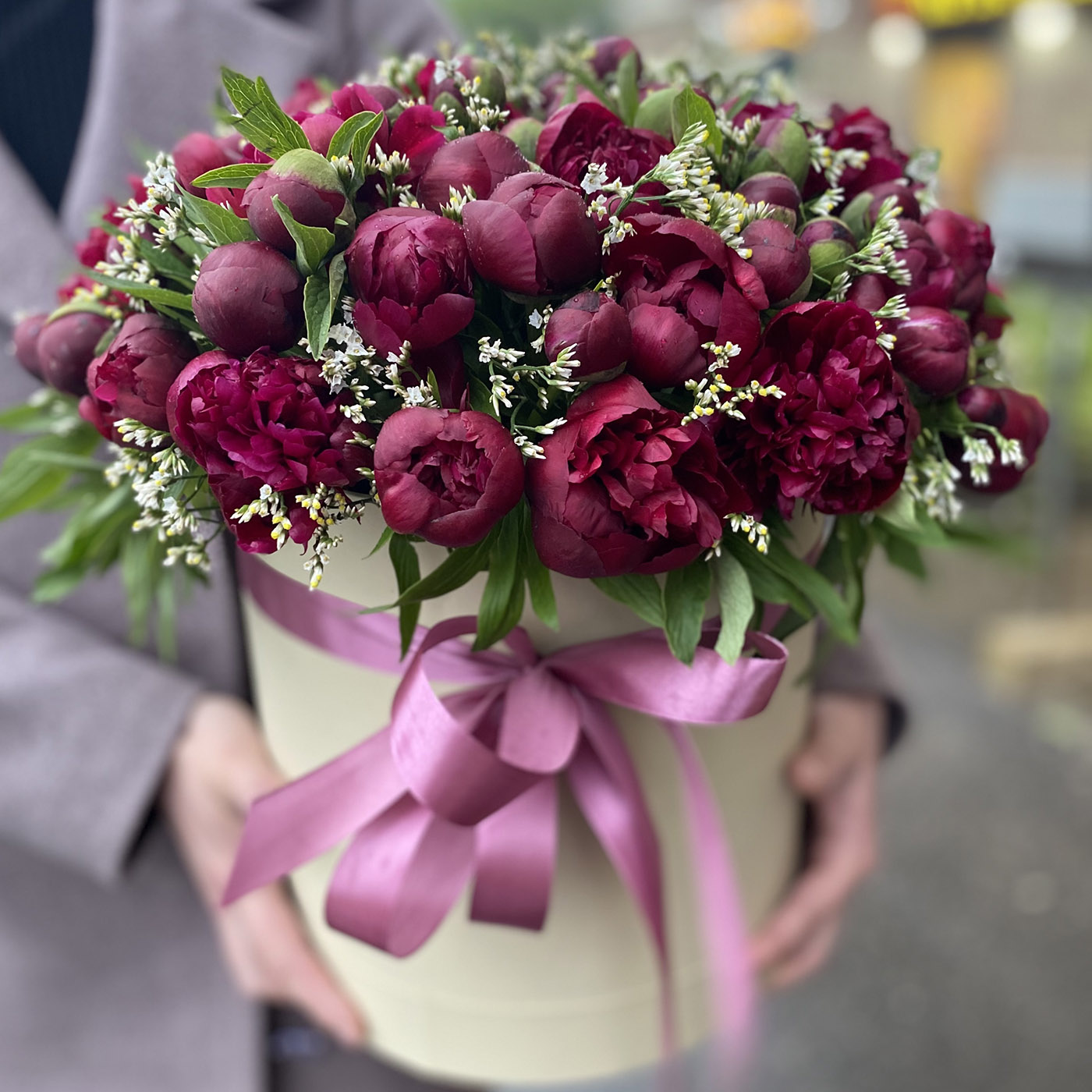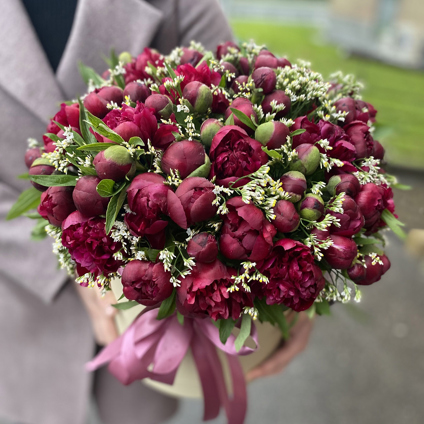 Цвет пионов в коробке может меняться в зависимости от сезона. На данный момент в наличии малиновые пионы.