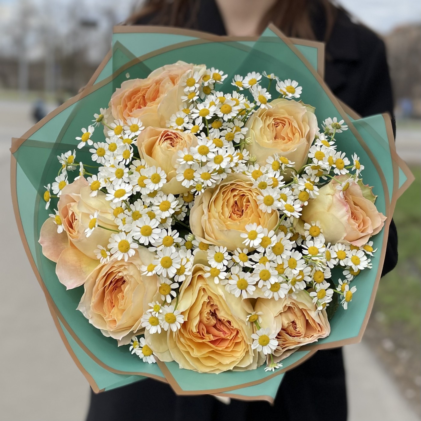 Пионовидные розы карамельного цвета с красивым бутоном и ароматом сада. В состав букета входят нежные ромашки, они добавляют романтики и нежности.