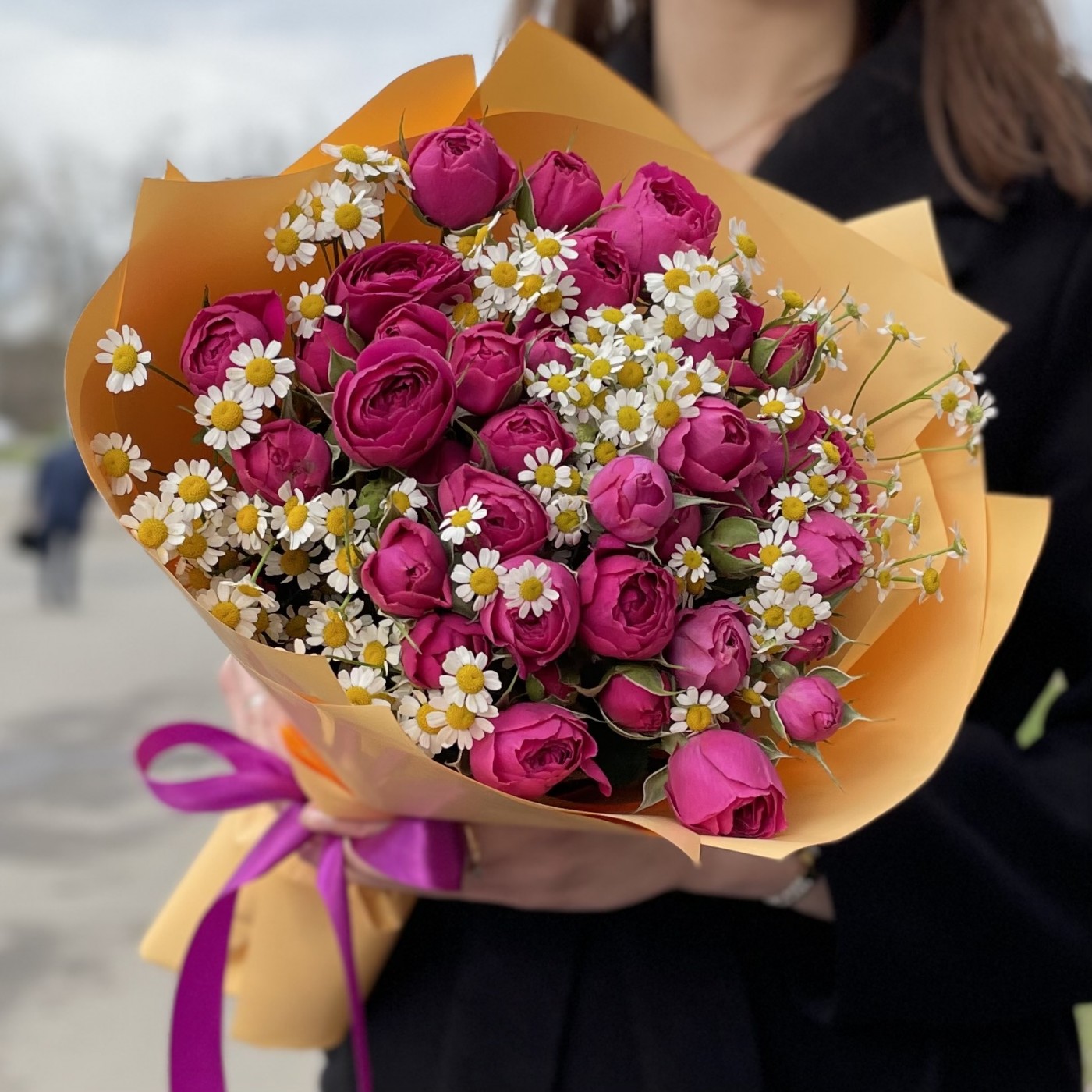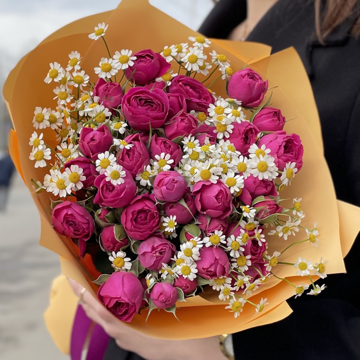 Малиновые кустовые пионовидные розы с нежными и ароматными ромашками. Прекрасный вариант подарка на день рождения или просто как знак внимания.