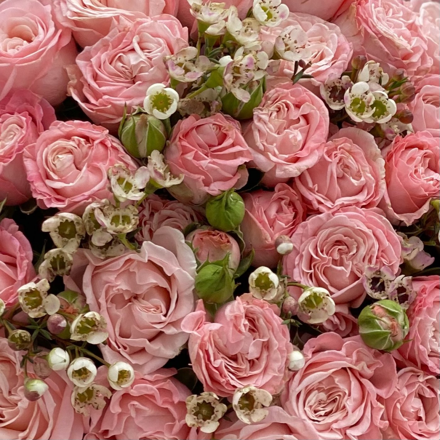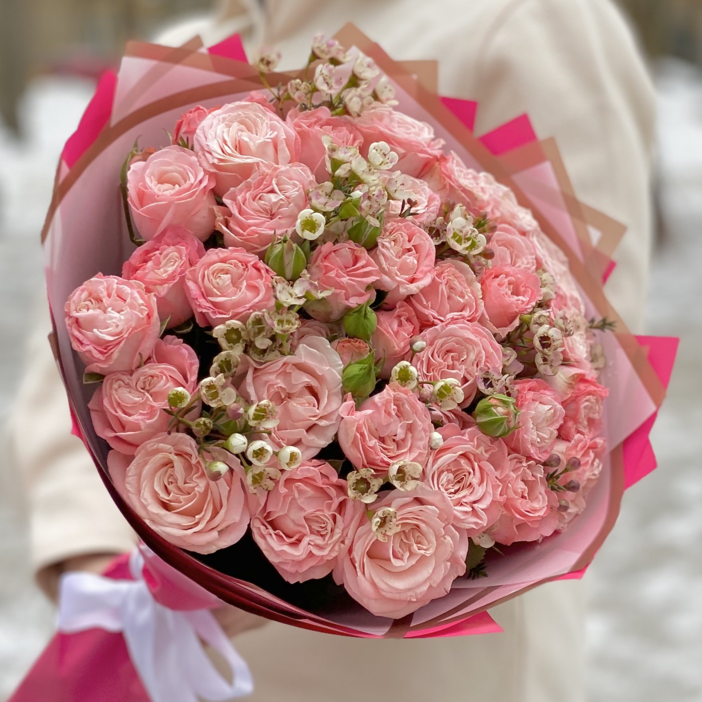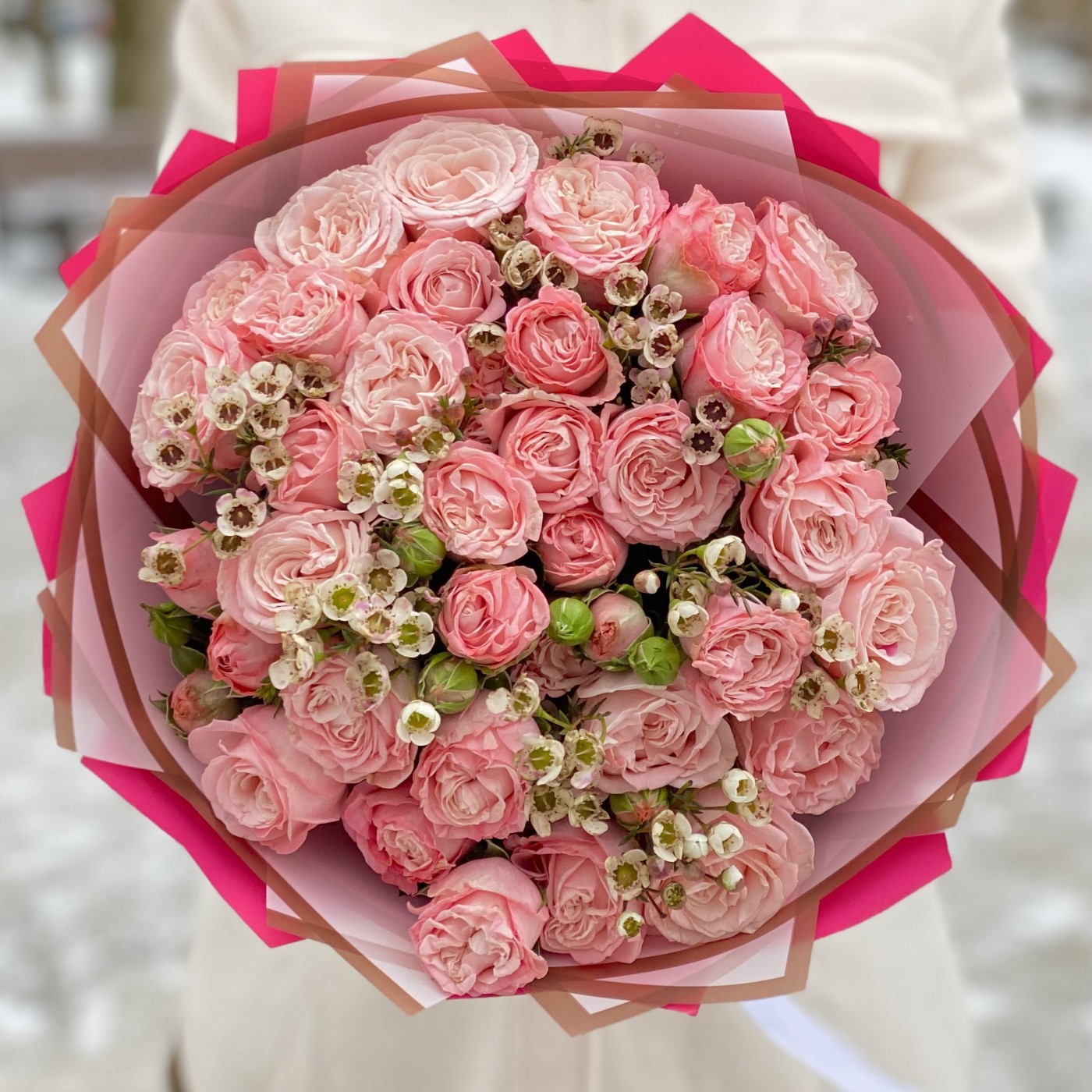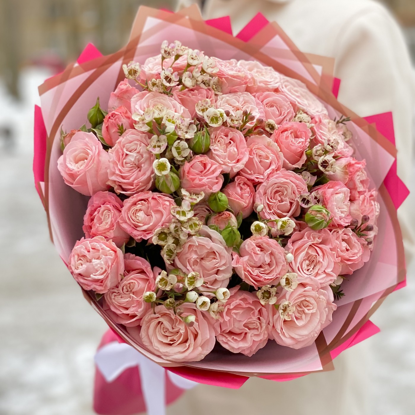 Нежные пионовидные розы сорта Мадам бомбастик с ароматным Ваксфлауэром. Прекрасное сочетание нежных цветов в одном букете. Букет можно преподнести на день рождения, свадьбу или любое другое торжественное мероприятие.