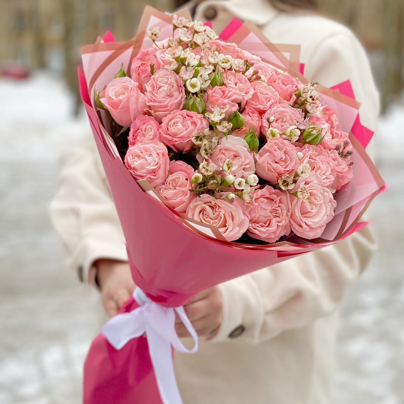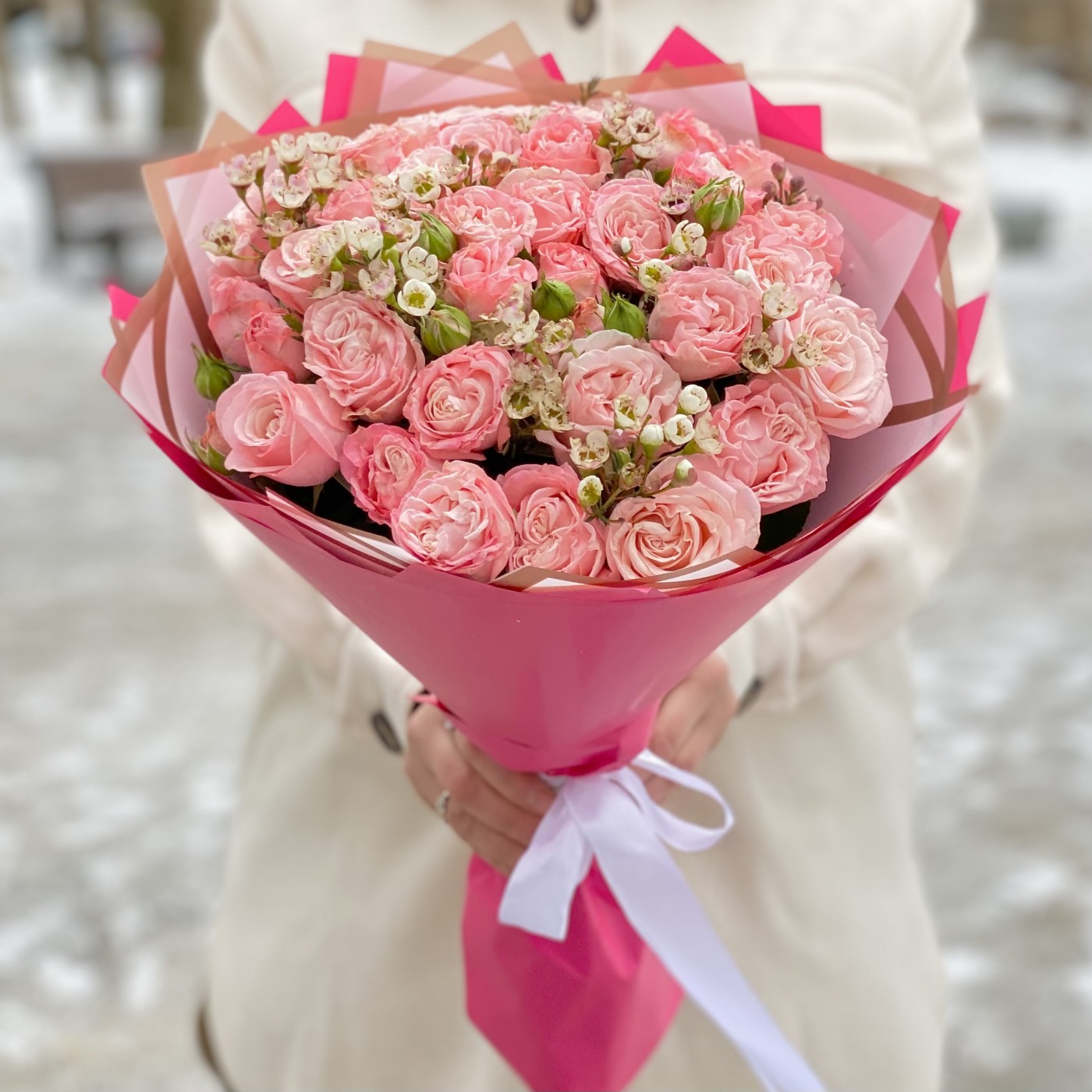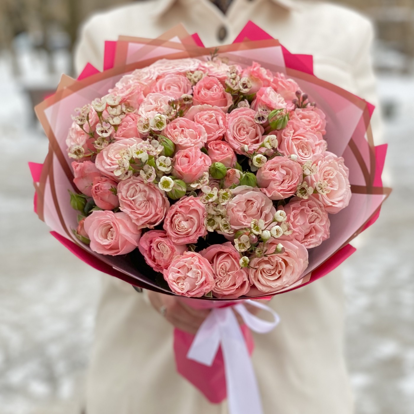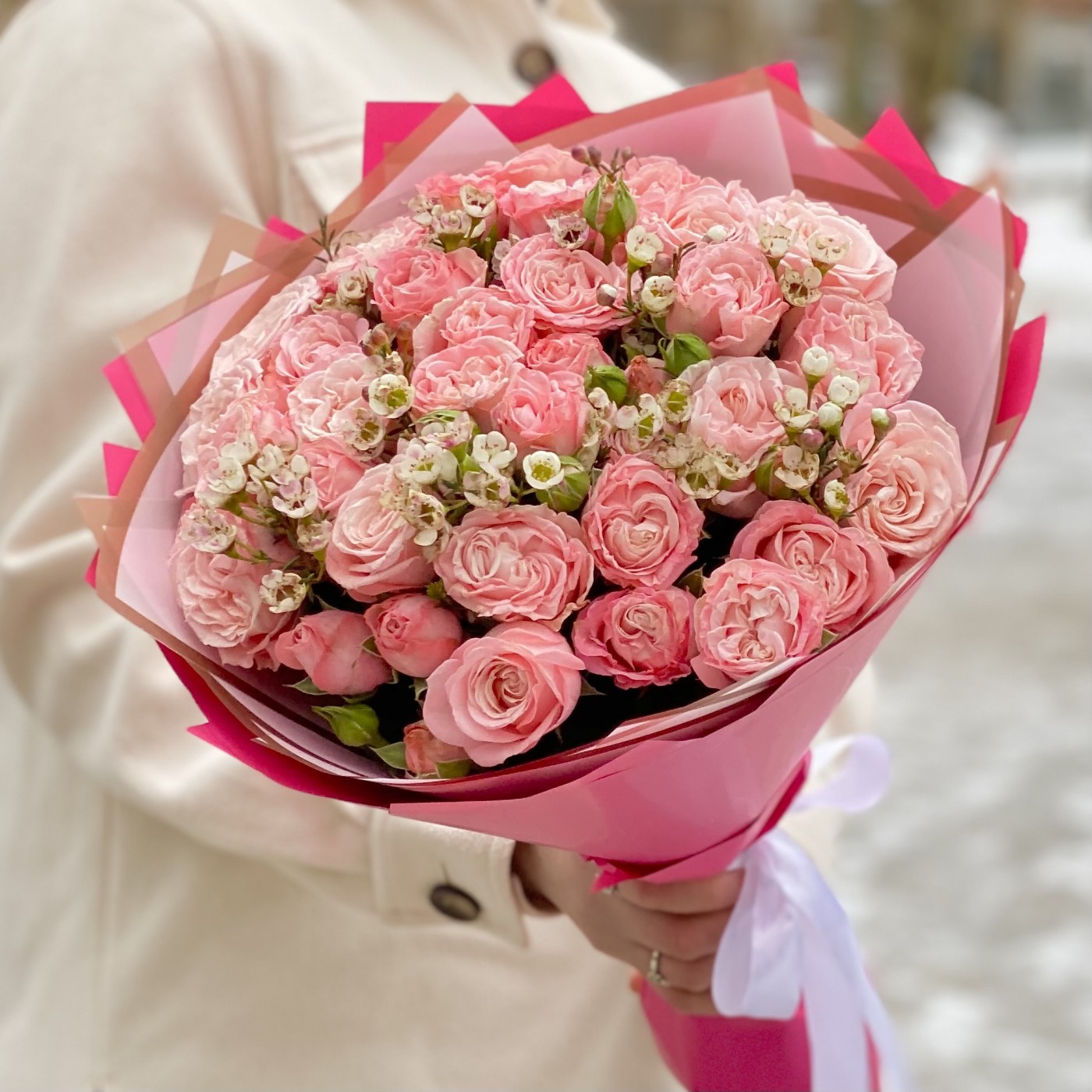 Нежные пионовидные розы сорта Мадам бомбастик с ароматным Ваксфлауэром. Прекрасное сочетание нежных цветов в одном букете. Букет можно преподнести на день рождения, свадьбу или любое другое торжественное мероприятие.
