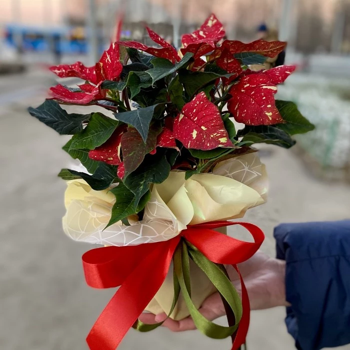 Пуансеттия или Рождественская звезда издавна является символом Нового года и Рождества. Великолепный яркий цветок в горшке станет прекрасным украшением новогоднего стола и превосходным подарком для Ваших близких. Сказочный вид растения создаст в доме особую волшебную атмосферу и создаст праздничное настроение. Согласно Фен-Шуй, пуансеттия приносит в дом положительную энергию, создает благоприятную ауру и привлекает благополучие.