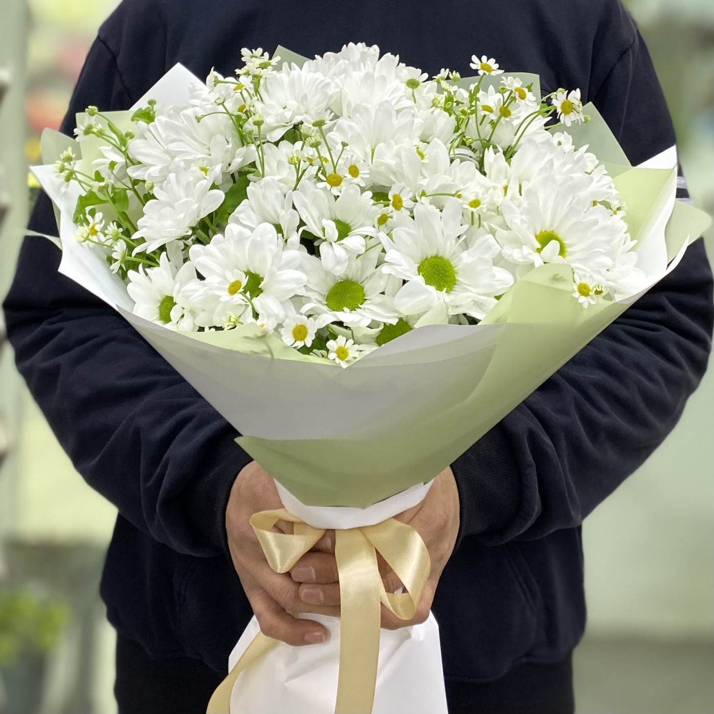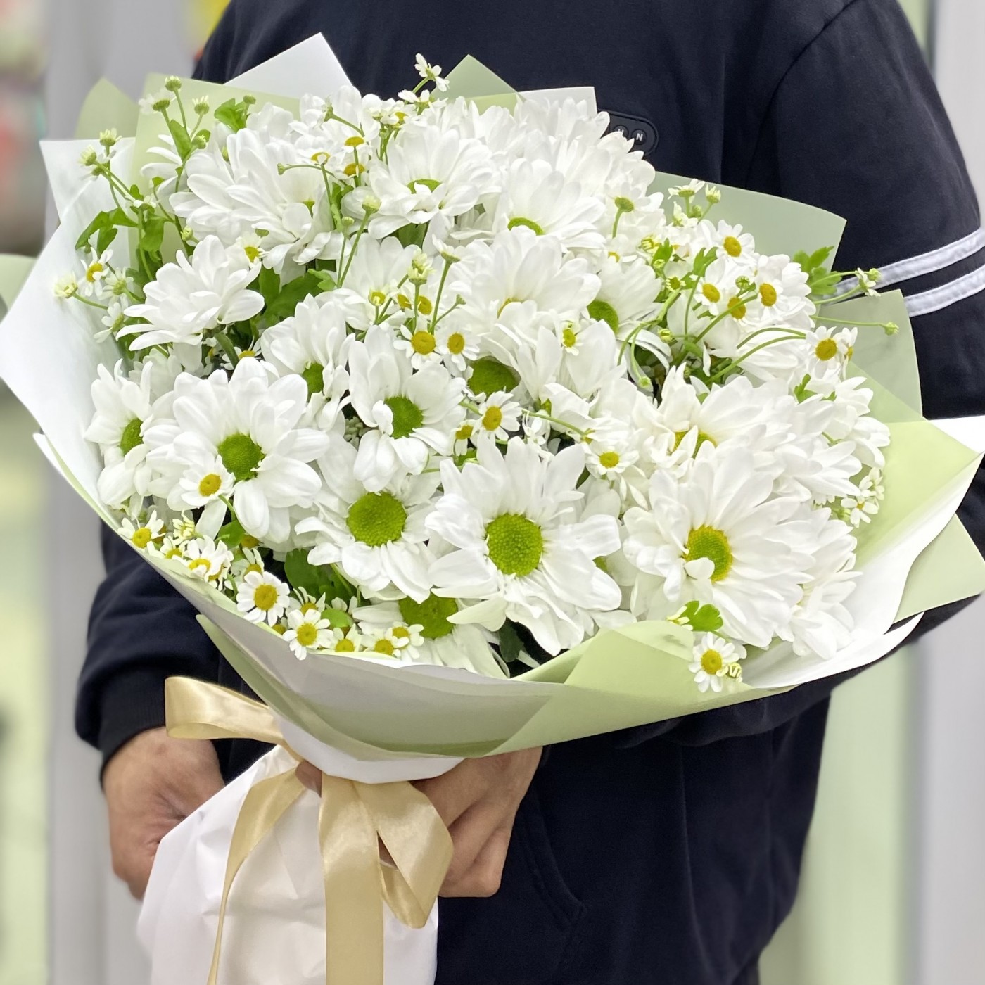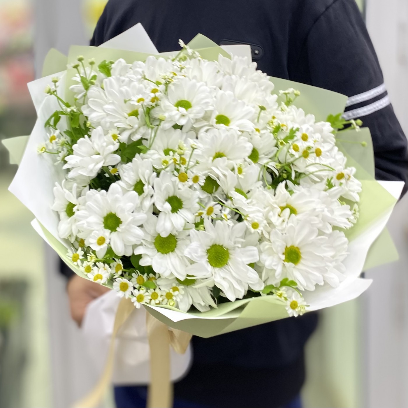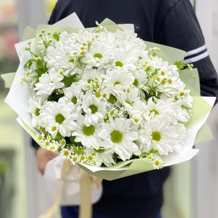 Нежный полевой букет из кустовых ромашек и ромашковых белых хризантем с тонким пряным ароматом.