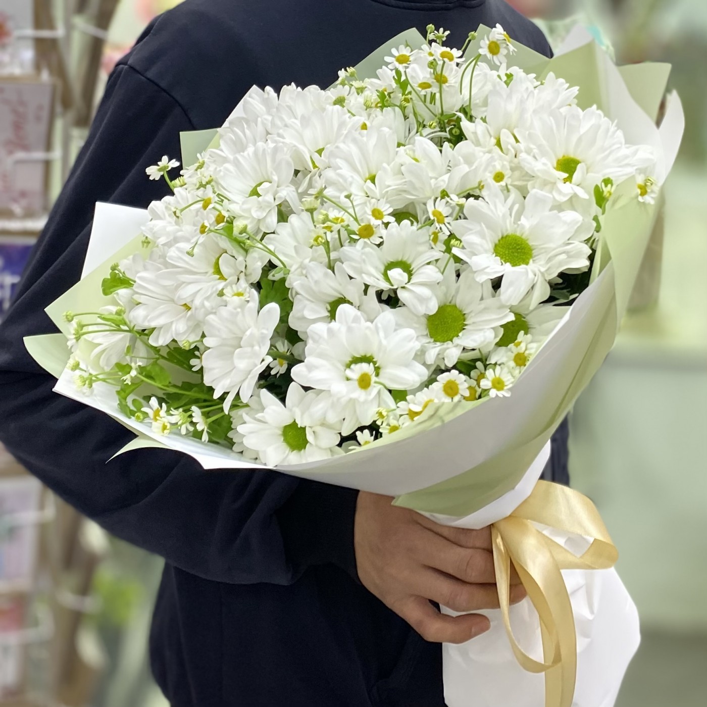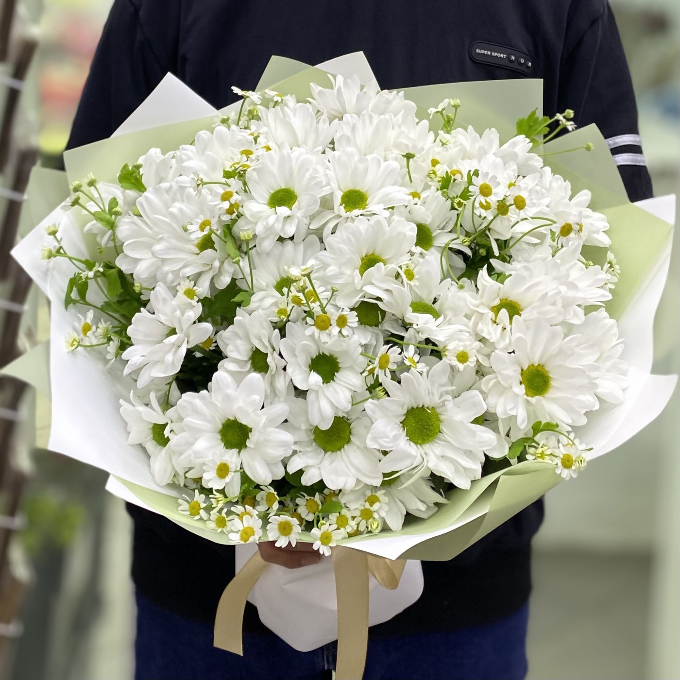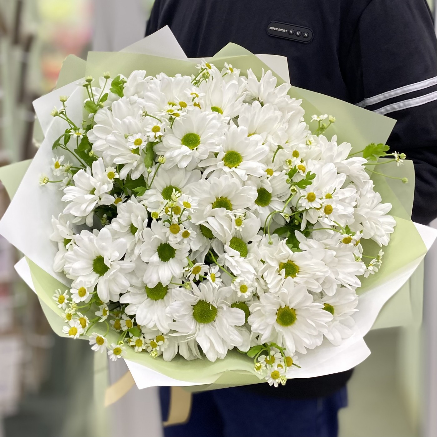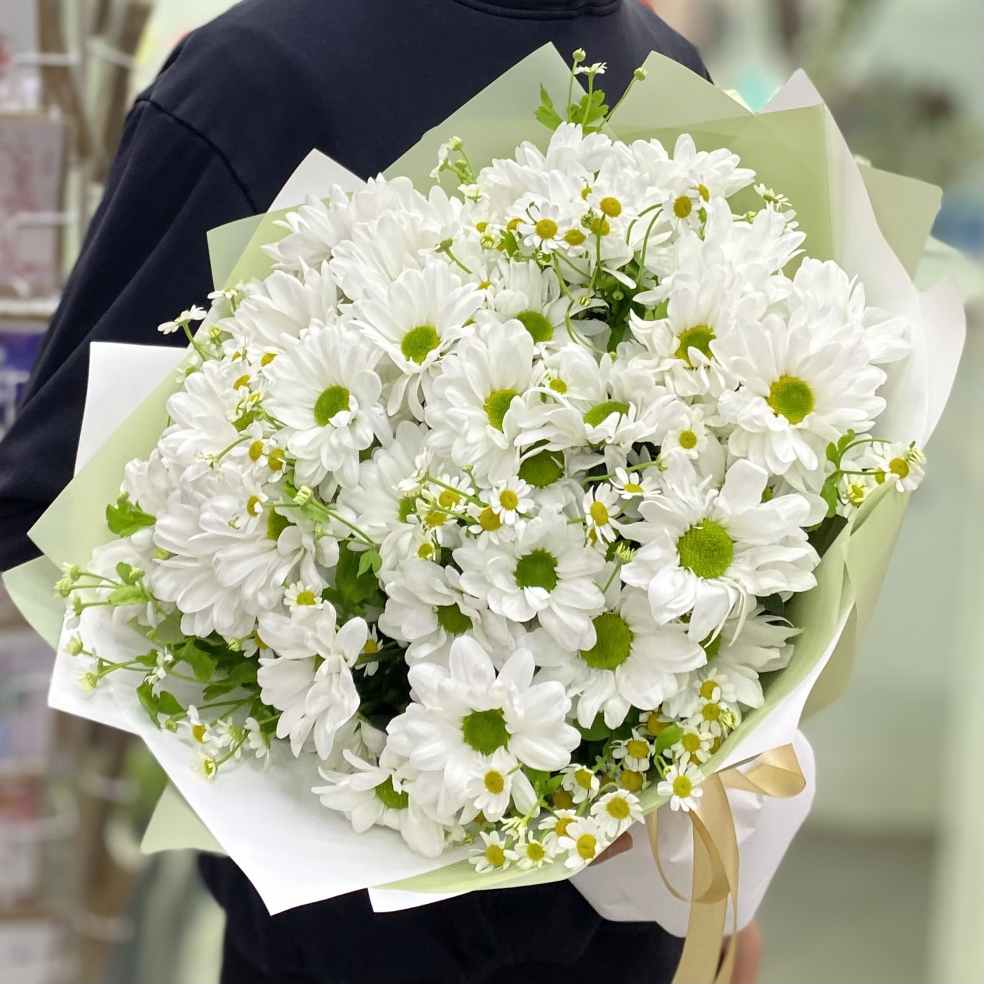 Нежный полевой букет из кустовых ромашек и ромашковых белых хризантем с тонким пряным ароматом.