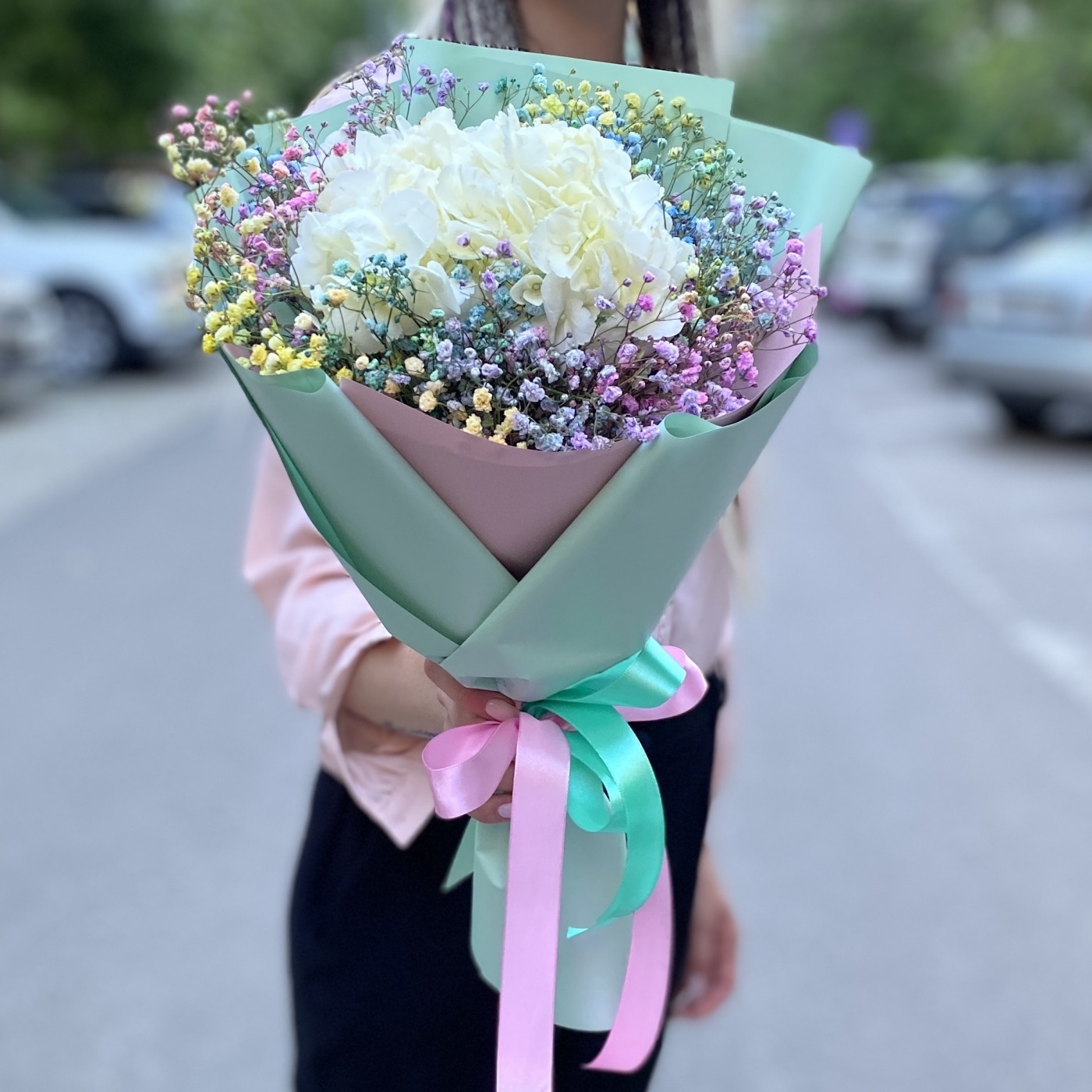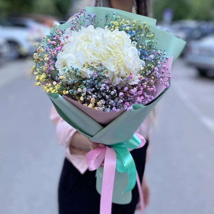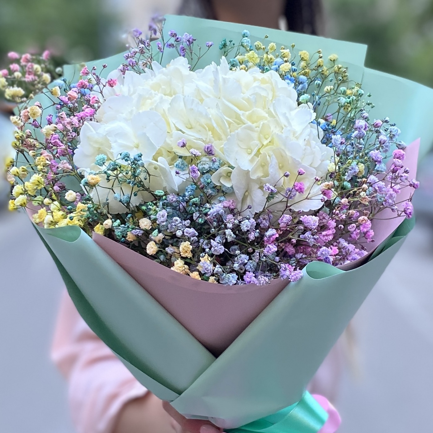 Радостный и необычный букет, с радужной гипсофилой и белой гортензией, смотрится очень стильно и интересно. Его можно взять с собой на свидание или преподнести как комплемент. Яркий и воздушный, понравится даже ребенку.