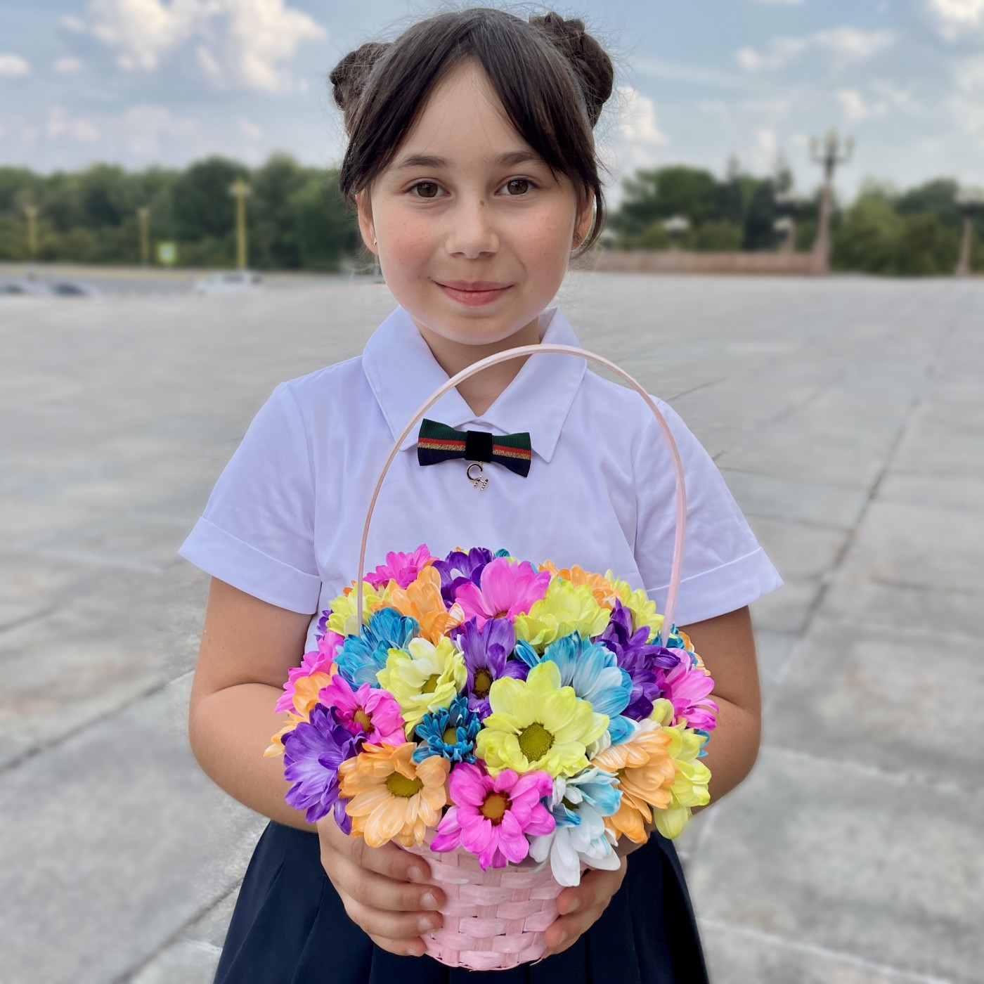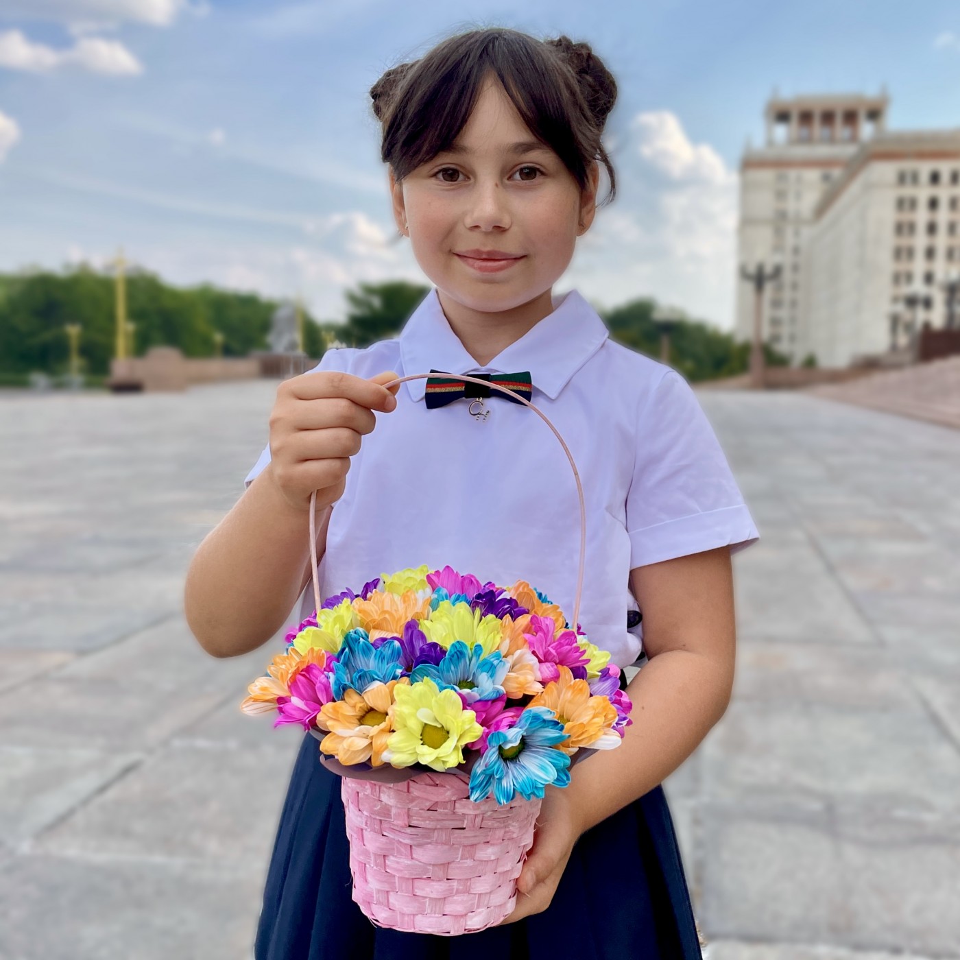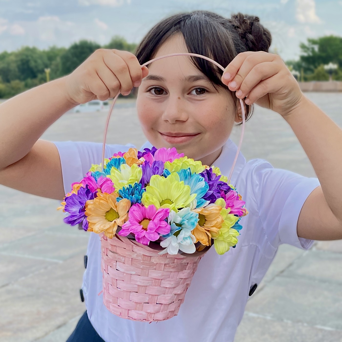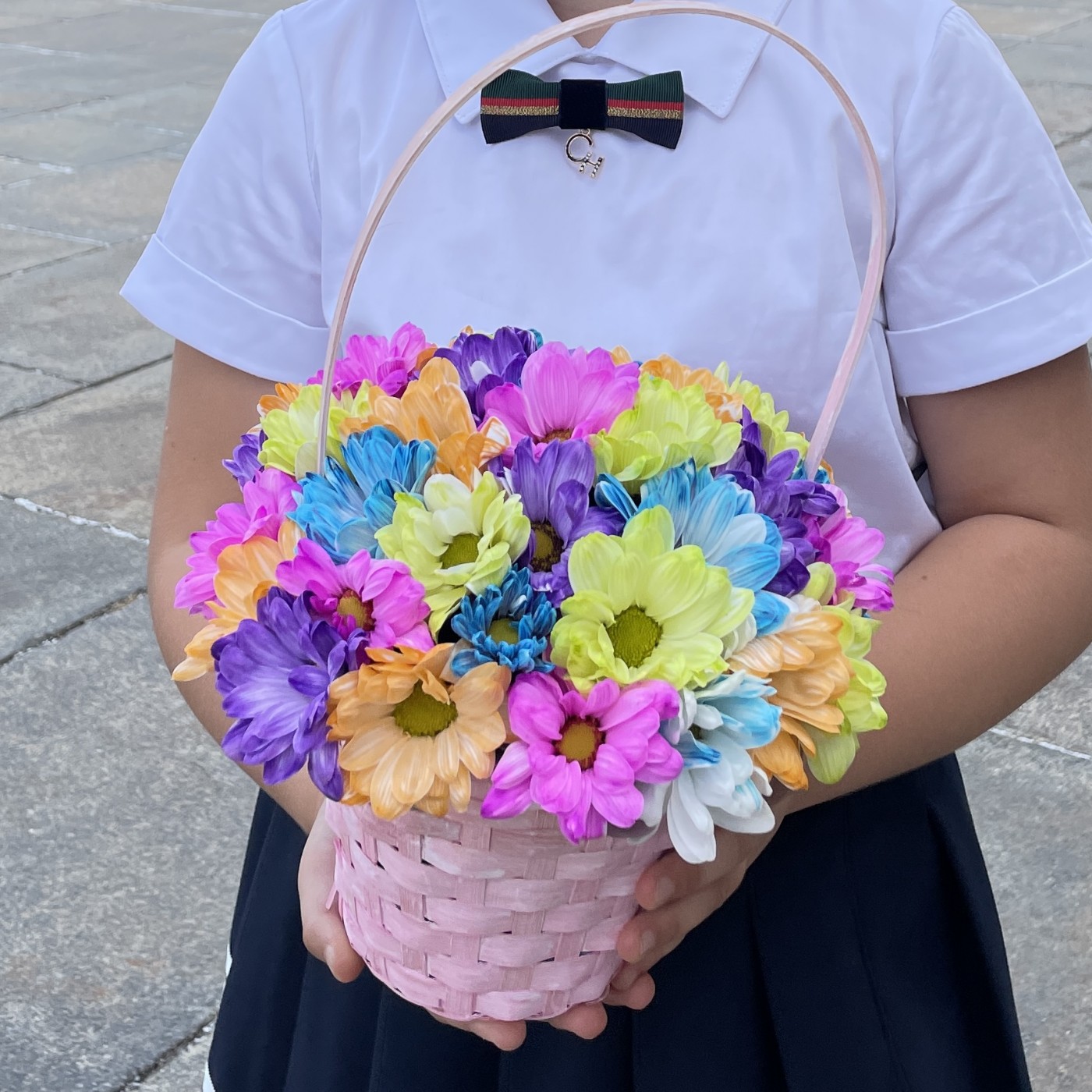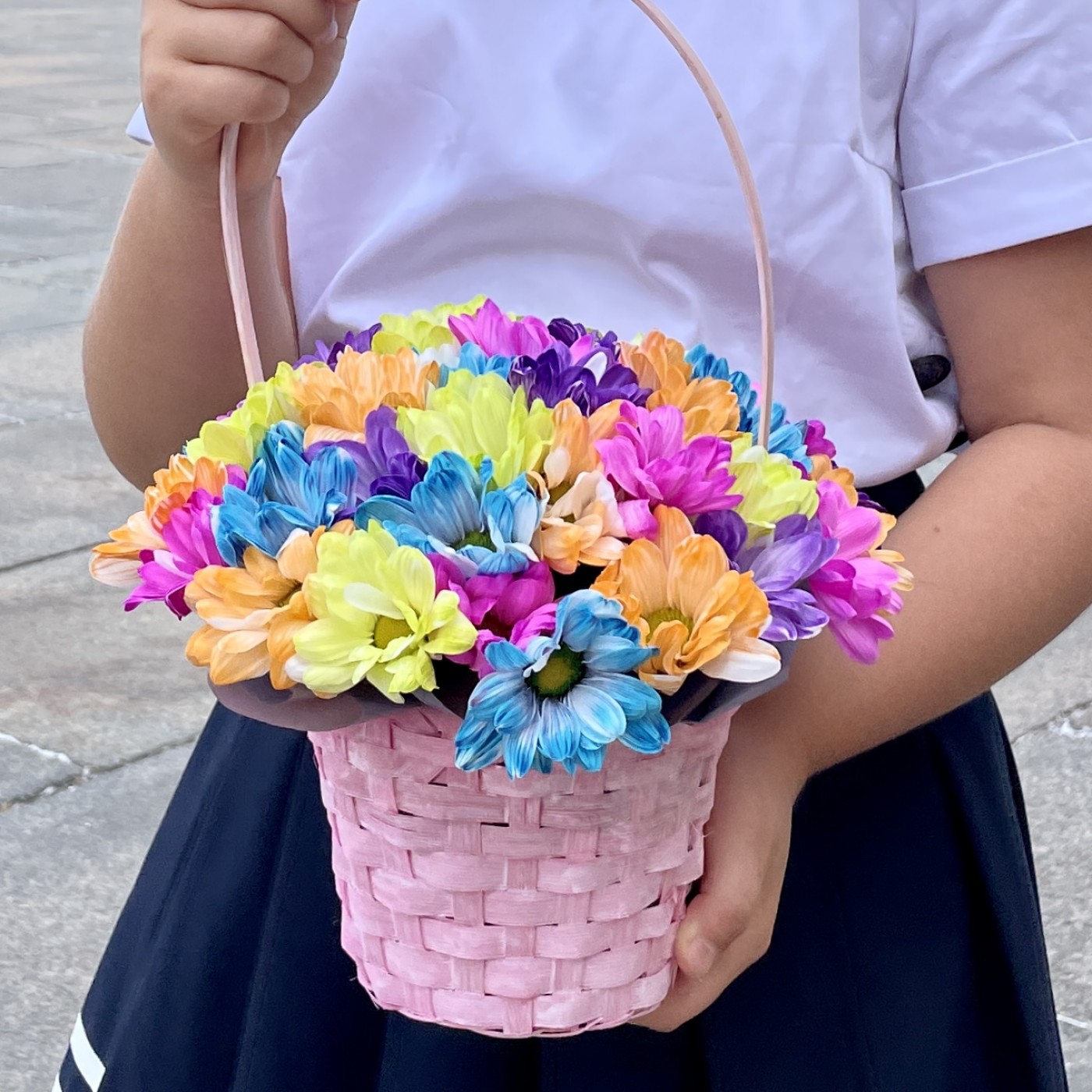 Радужные хризантемы в розовой корзинке
