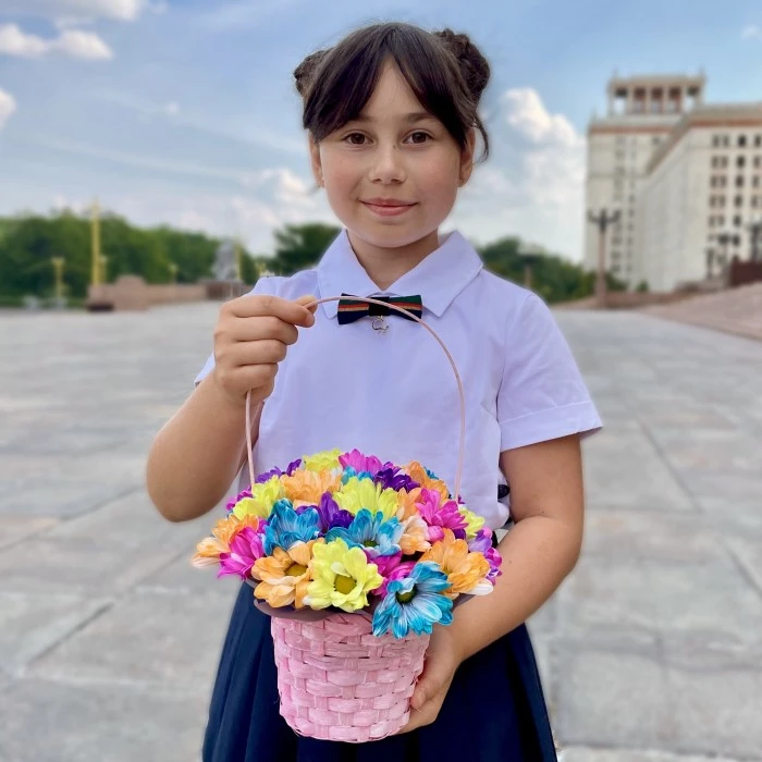 Композиция из ярких радужных хризантем в плетёной корзинке розового цвета. Прекрасный подарок педагогу, уместный комплимент яркой личности, превосходный способ сделать пасмурный день ярче!