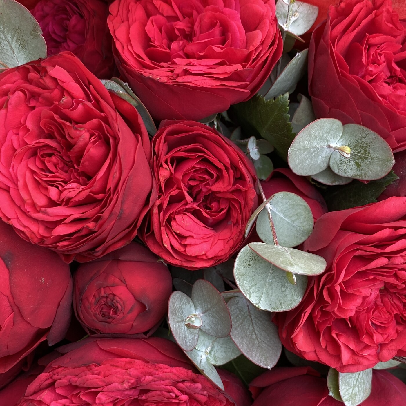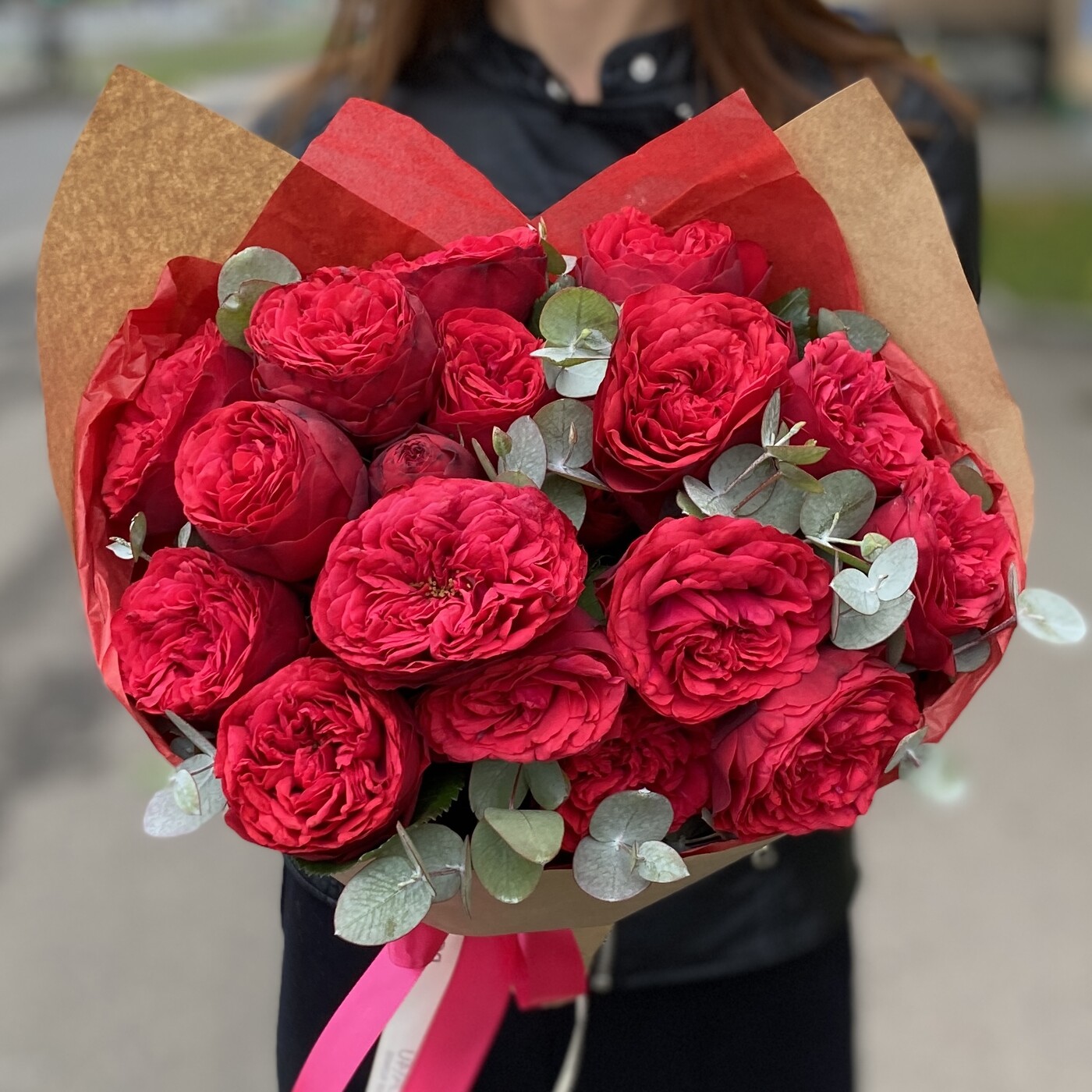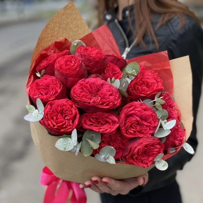 Кустовая пионовидная роза сорта Ред Пиано прекрасно сочетается с эвкалиптом и крафт бумагой. Букет подойдет на любое событие.