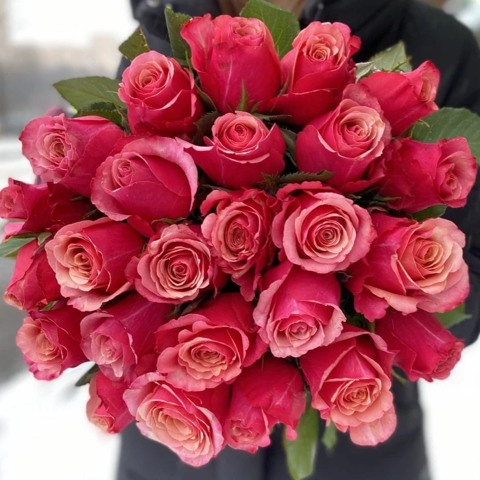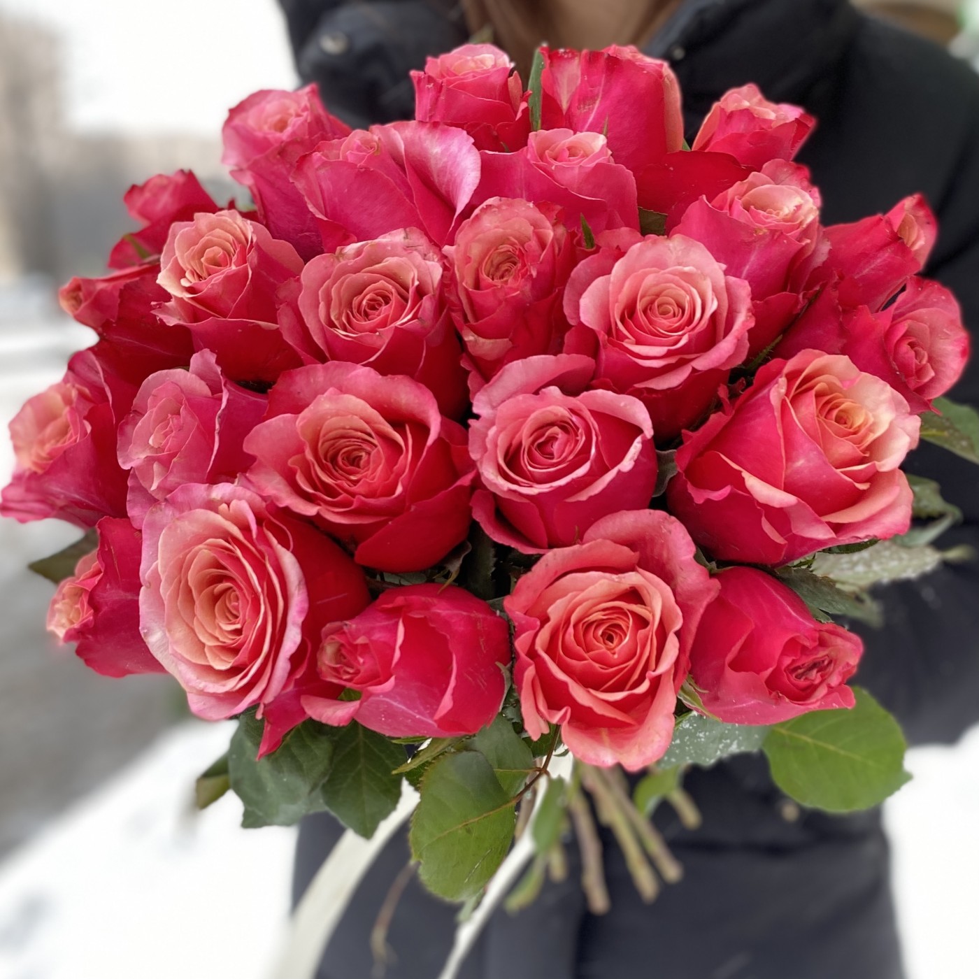 Анна о заказе: 51 малиновая розаСпасибо! Букет великолепный! Цветы свежайшие, упругие, очень красивые, крупные. Добавлено 4 коралловые розы и зелень