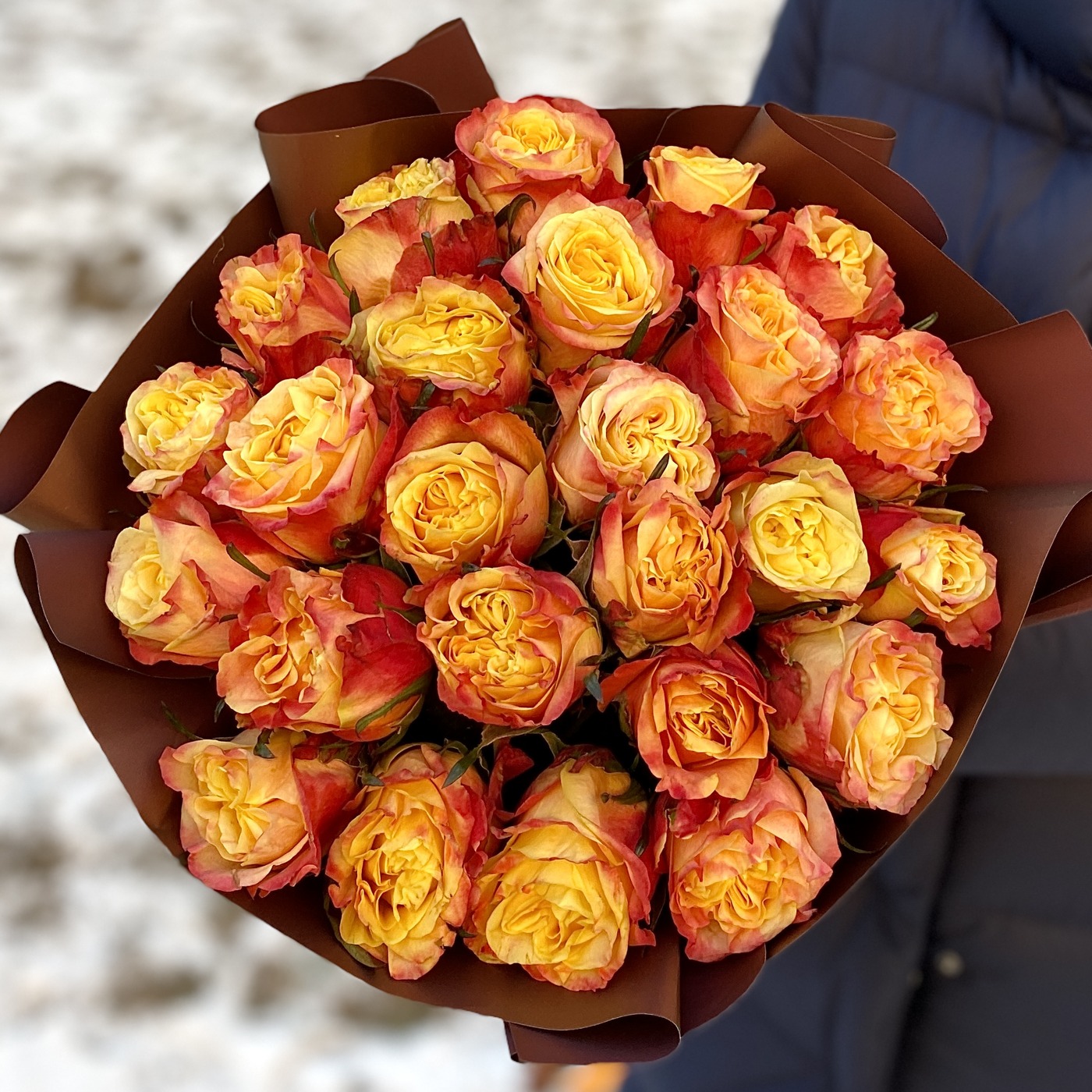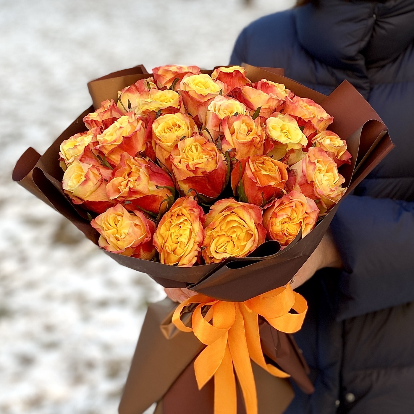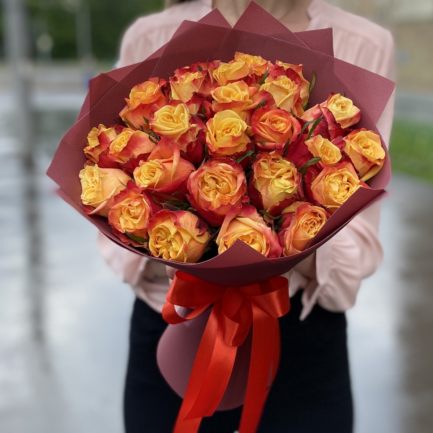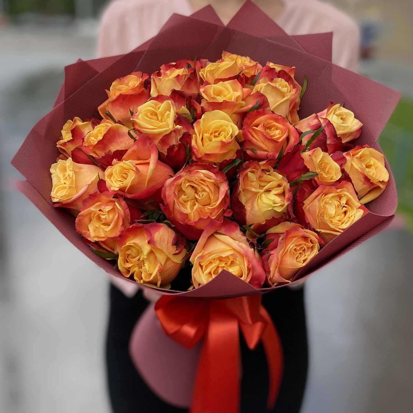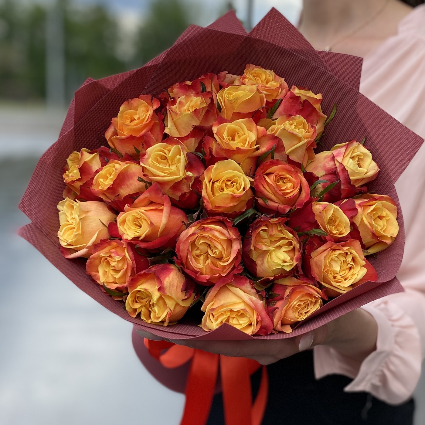 Состав на фото: пионовидная роза Фаер Экспрешн – 25 шт, упаковка.