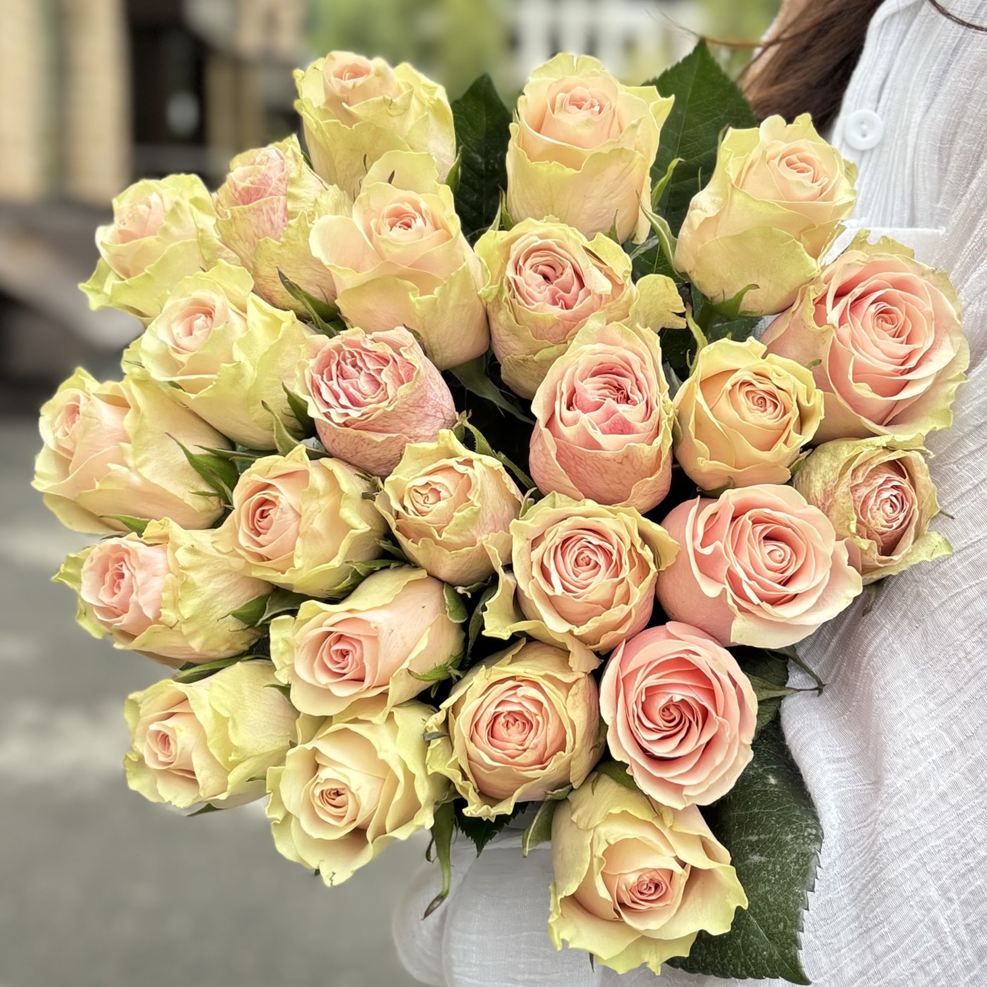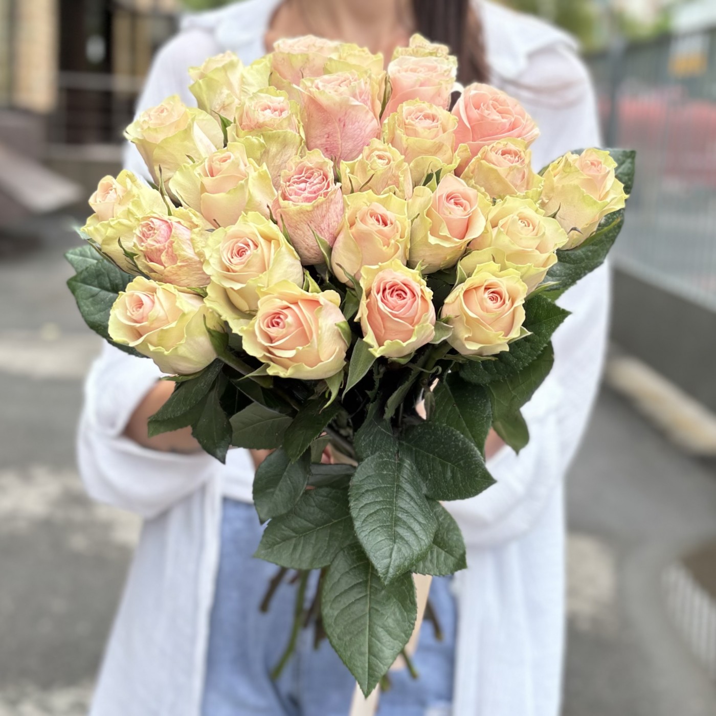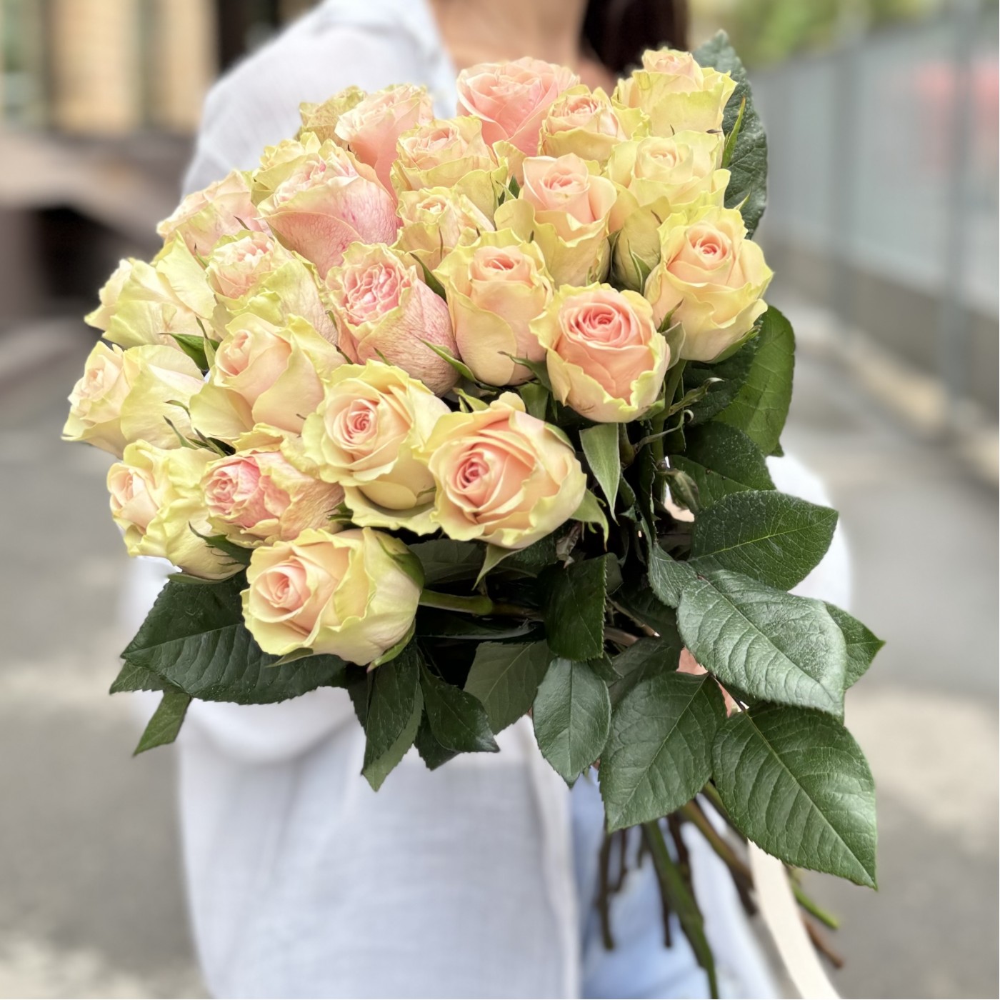Нежно-розовые розы с фисташковыми лепестками по краям сорта Фруттето. Роза обладает легким сладковатым ароматом.