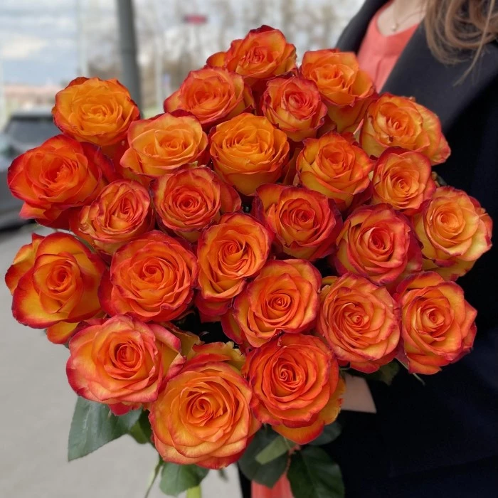 Двухцветная длинная роза с эффектными переливами цвета от ярко-желтого до огненно-красного.