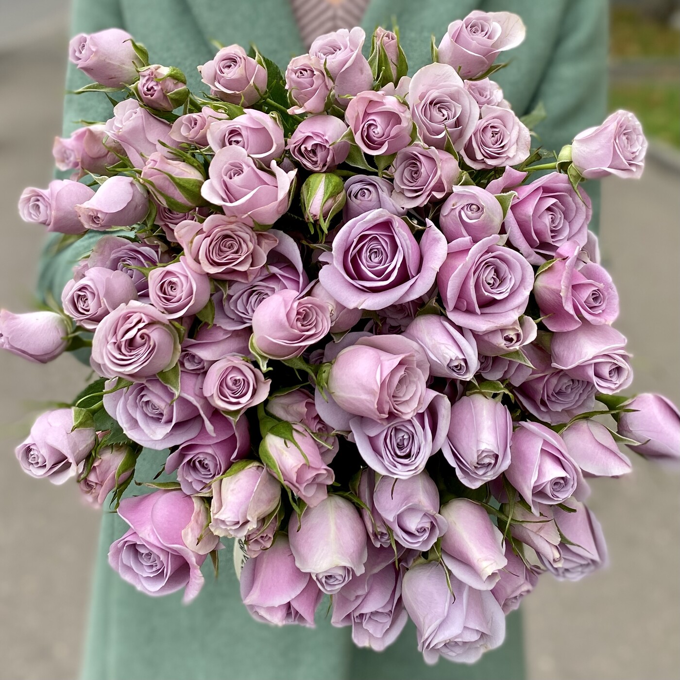 Кустовая роза сорта Сильвер Шедоу. Роза имеет сиреневый цвет, на ветке около 7-9 бутонов. На фото представлено 15 веток.