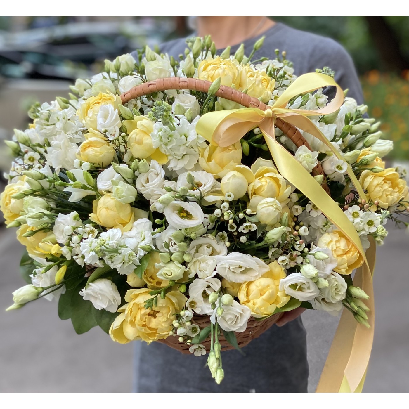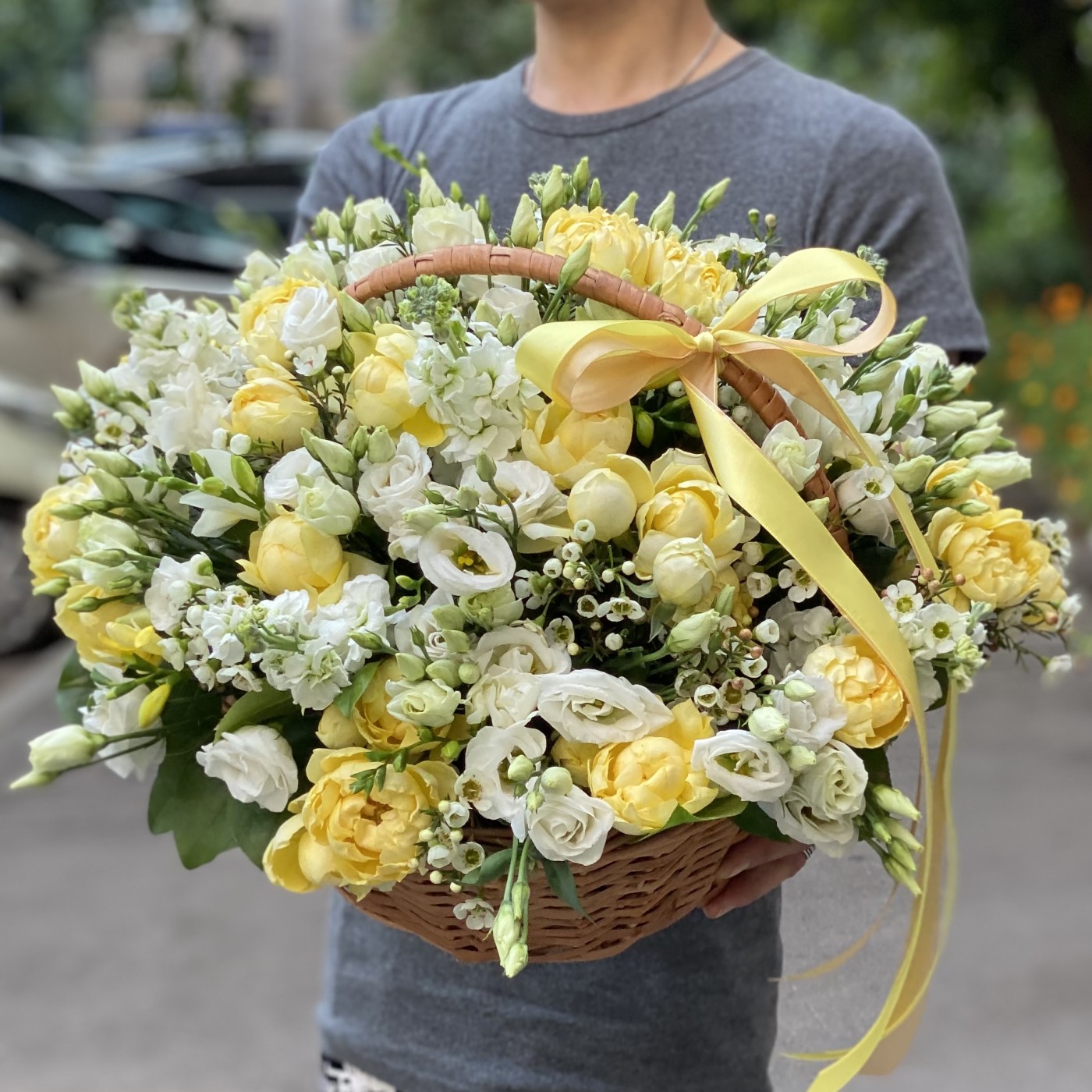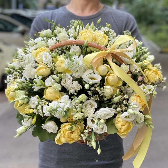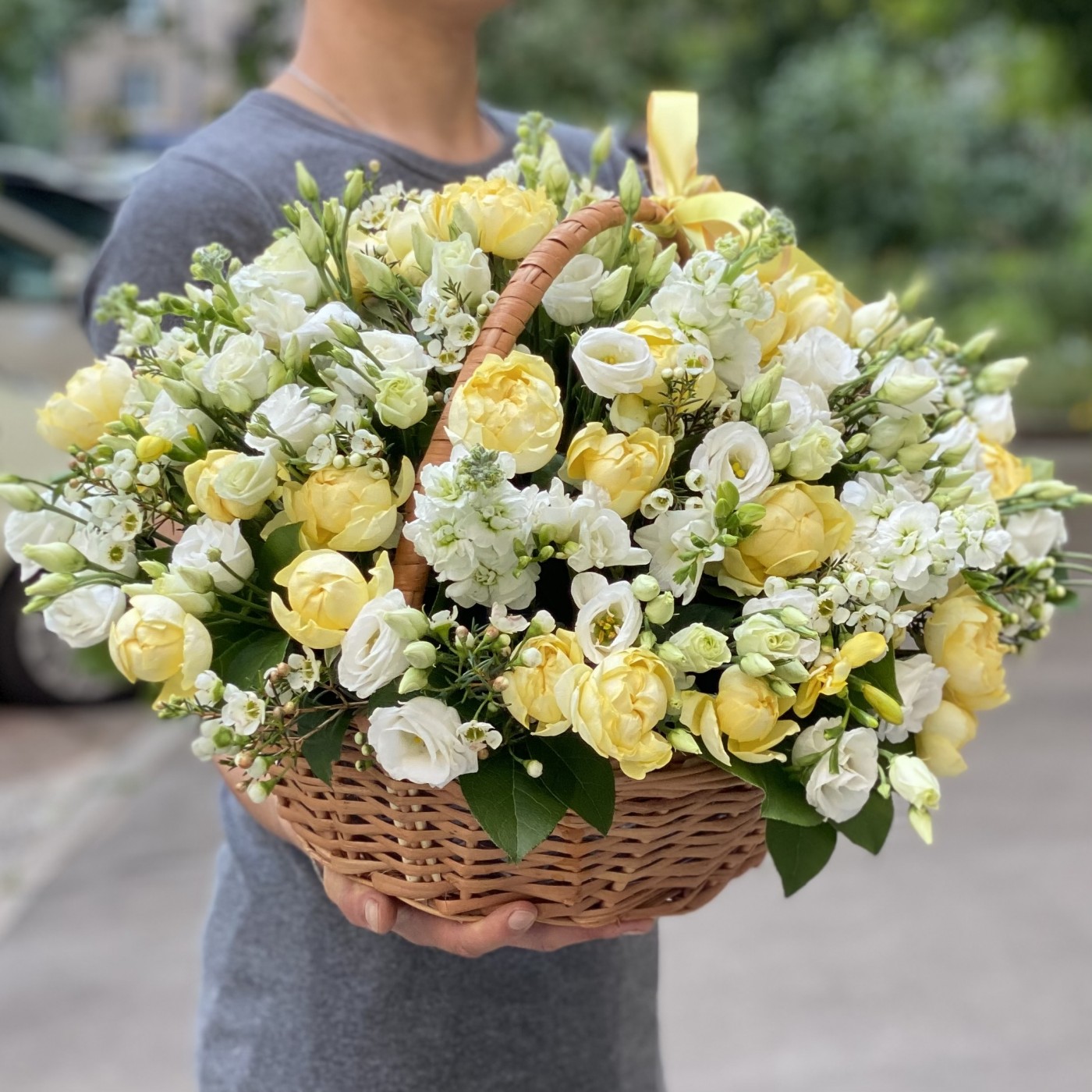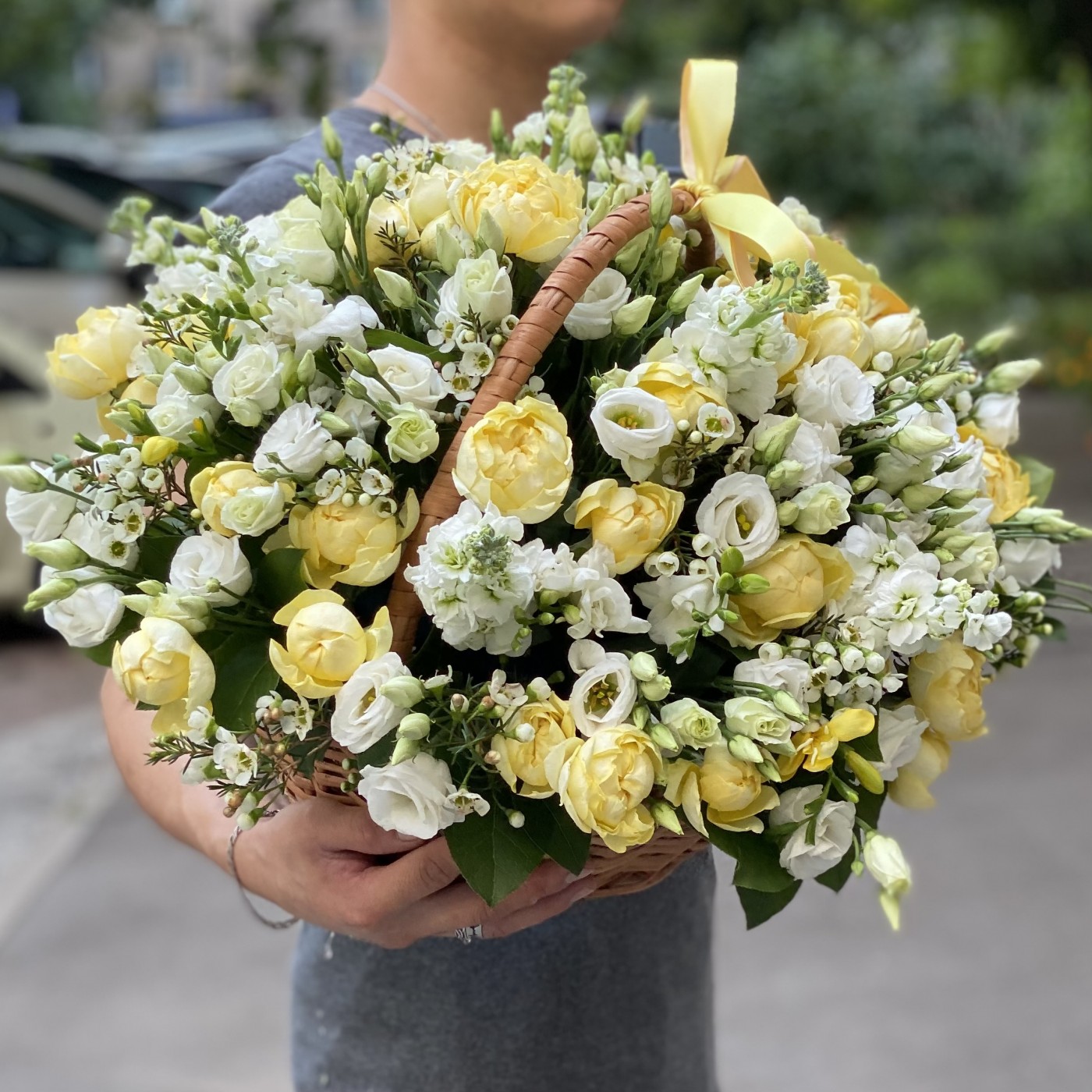 Композиция в бело-лимонных тонах с цветами в корзине. Роскошная композиция расскажет о самых высоких и добрых чувствах, создаст атмосферу радости, счастья и праздника!