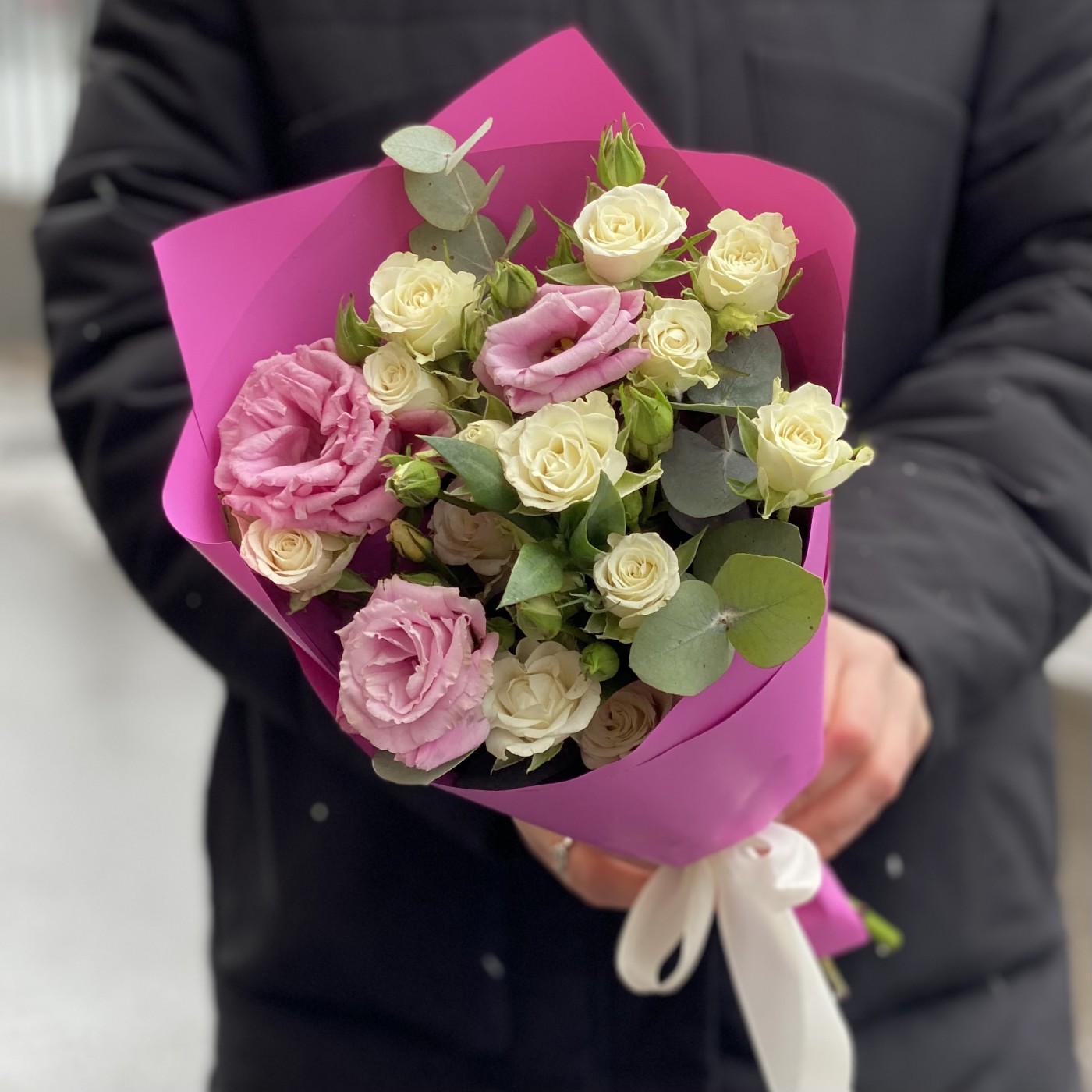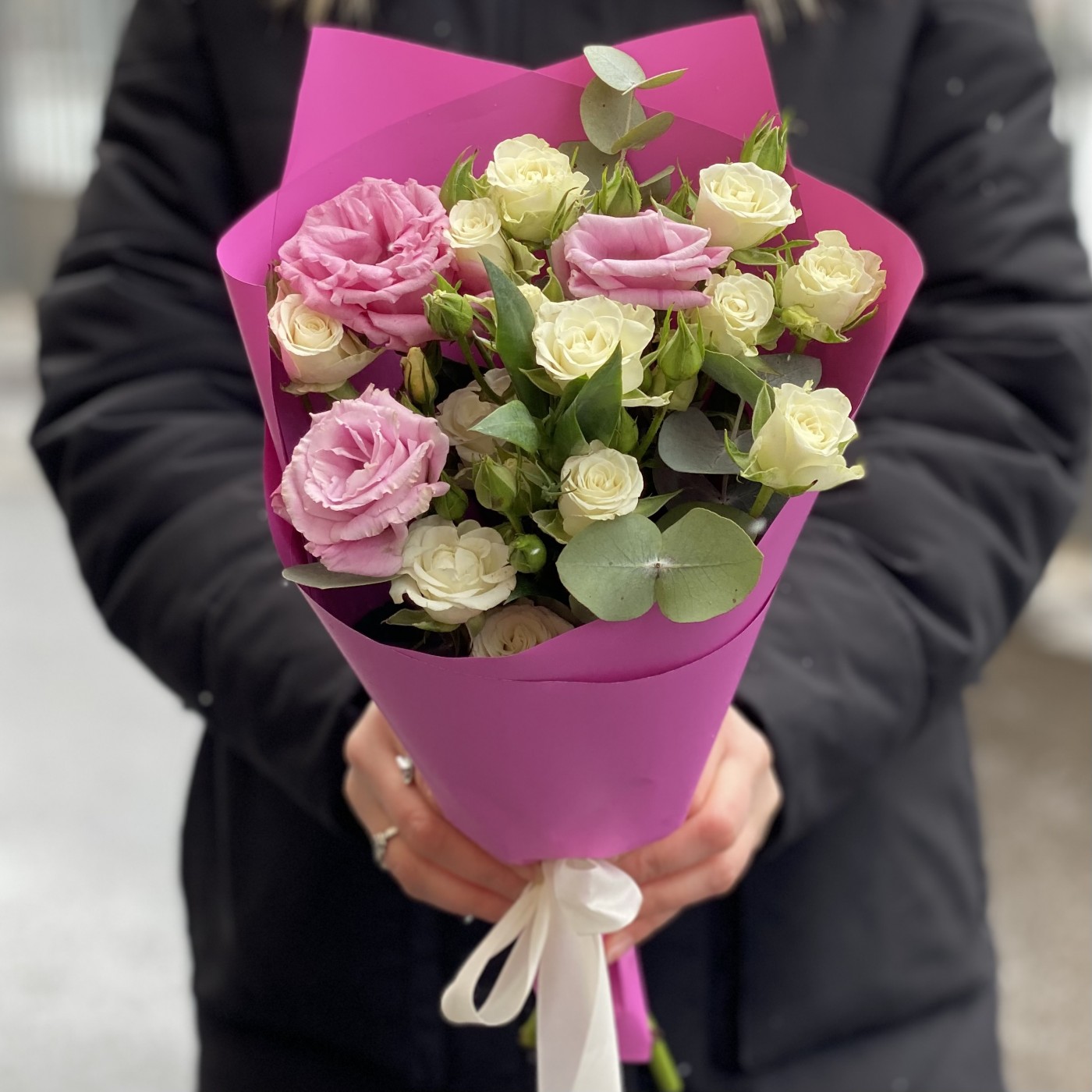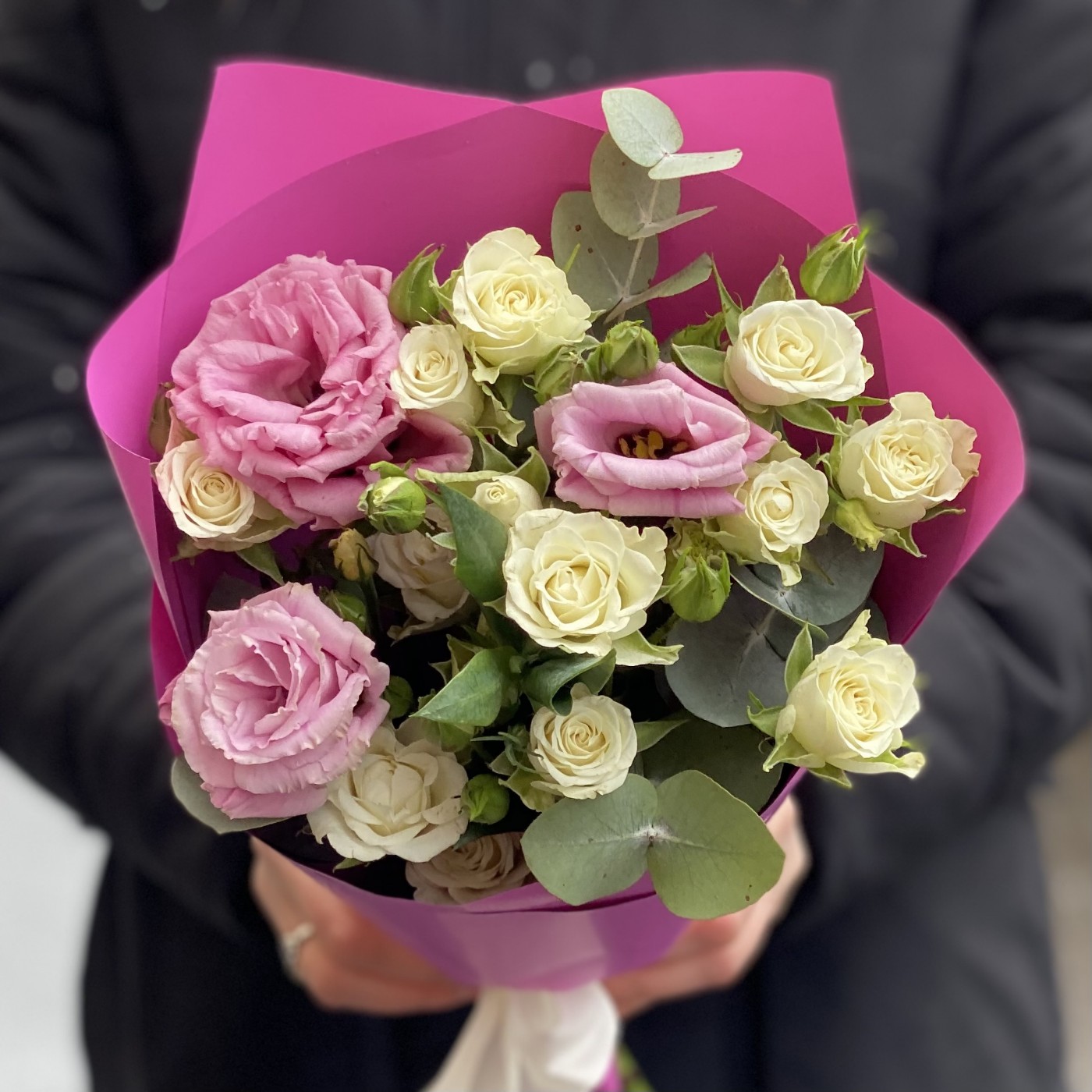 Купить букет из кустовых роз и эустомы в бело-розовой цветовой гамме в один клик можно на нашем сайте. Предлагаем всегда свежие и красивые цветы, доставляем букеты круглосуточно по Москве и области. По Вашему желанию дополним композицию бесплатной открыткой, куда впишем ваш текст.