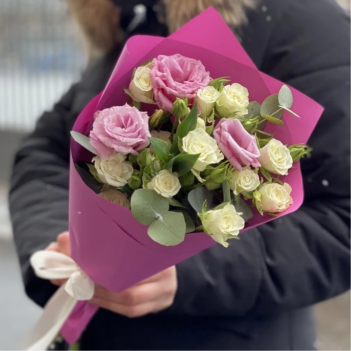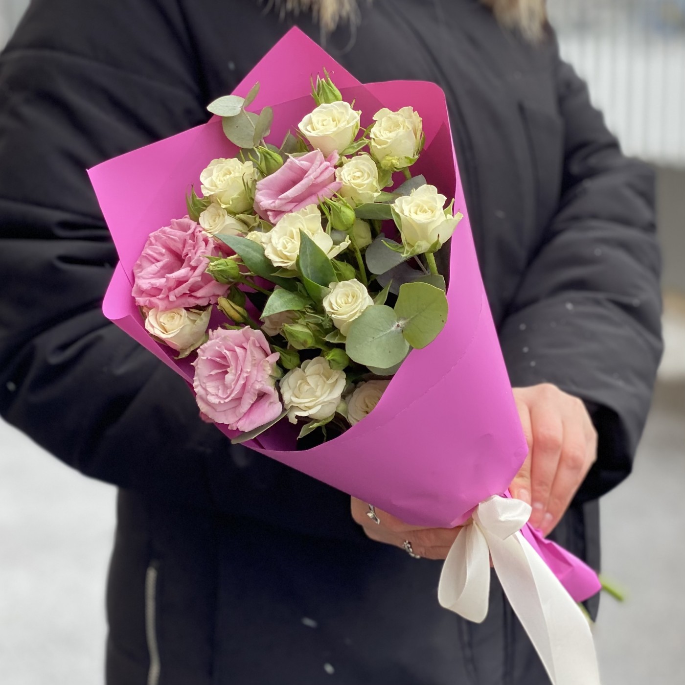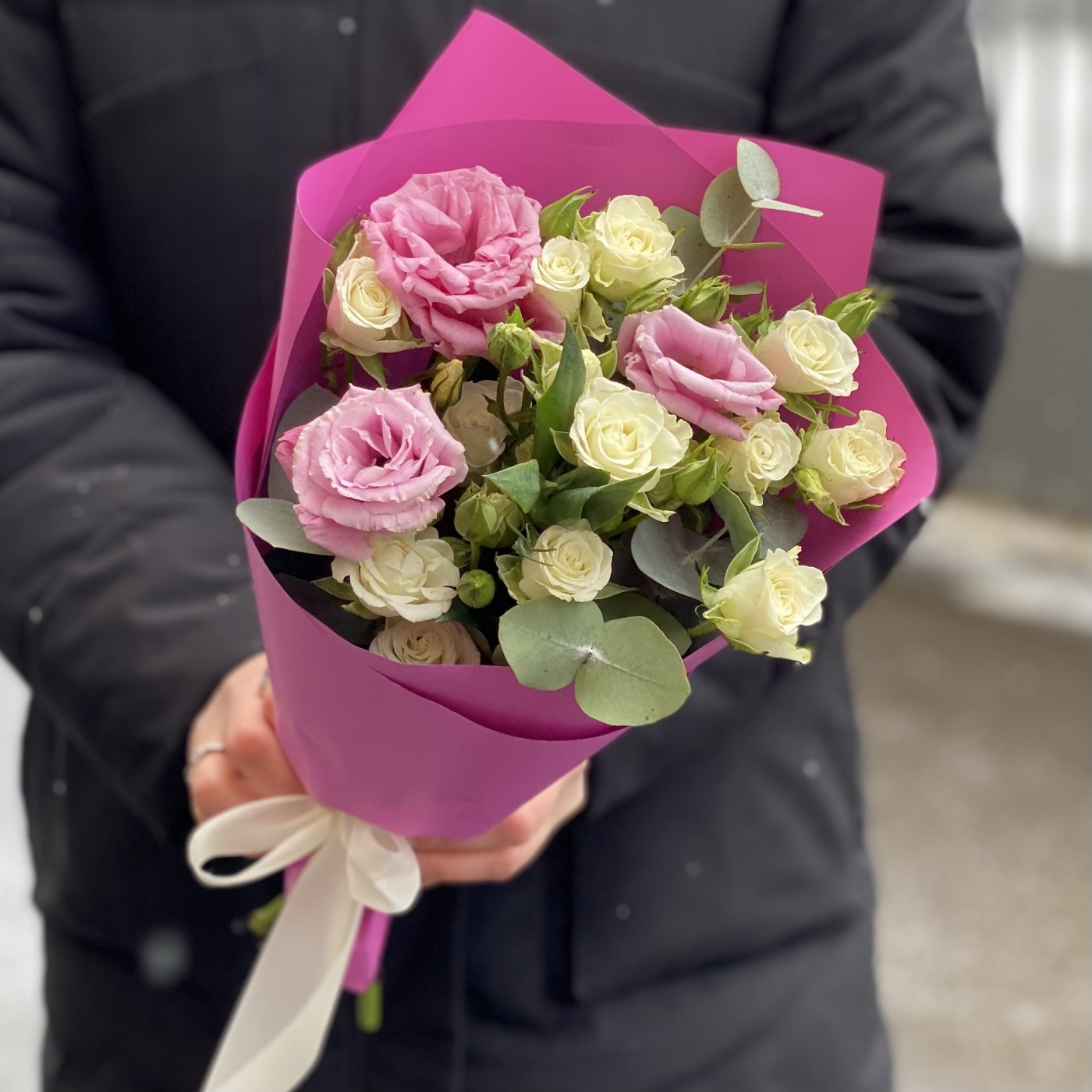 Купить букет из кустовых роз и эустомы в бело-розовой цветовой гамме в один клик можно на нашем сайте. Предлагаем всегда свежие и красивые цветы, доставляем букеты круглосуточно по Москве и области. По Вашему желанию дополним композицию бесплатной открыткой, куда впишем ваш текст.