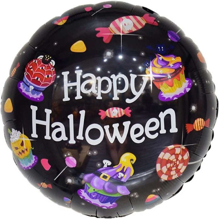 Шар фольгированный круглый Сладости на Хэллоуин цвет черный, дополнит ваш букет и создаст праздничное настроение.