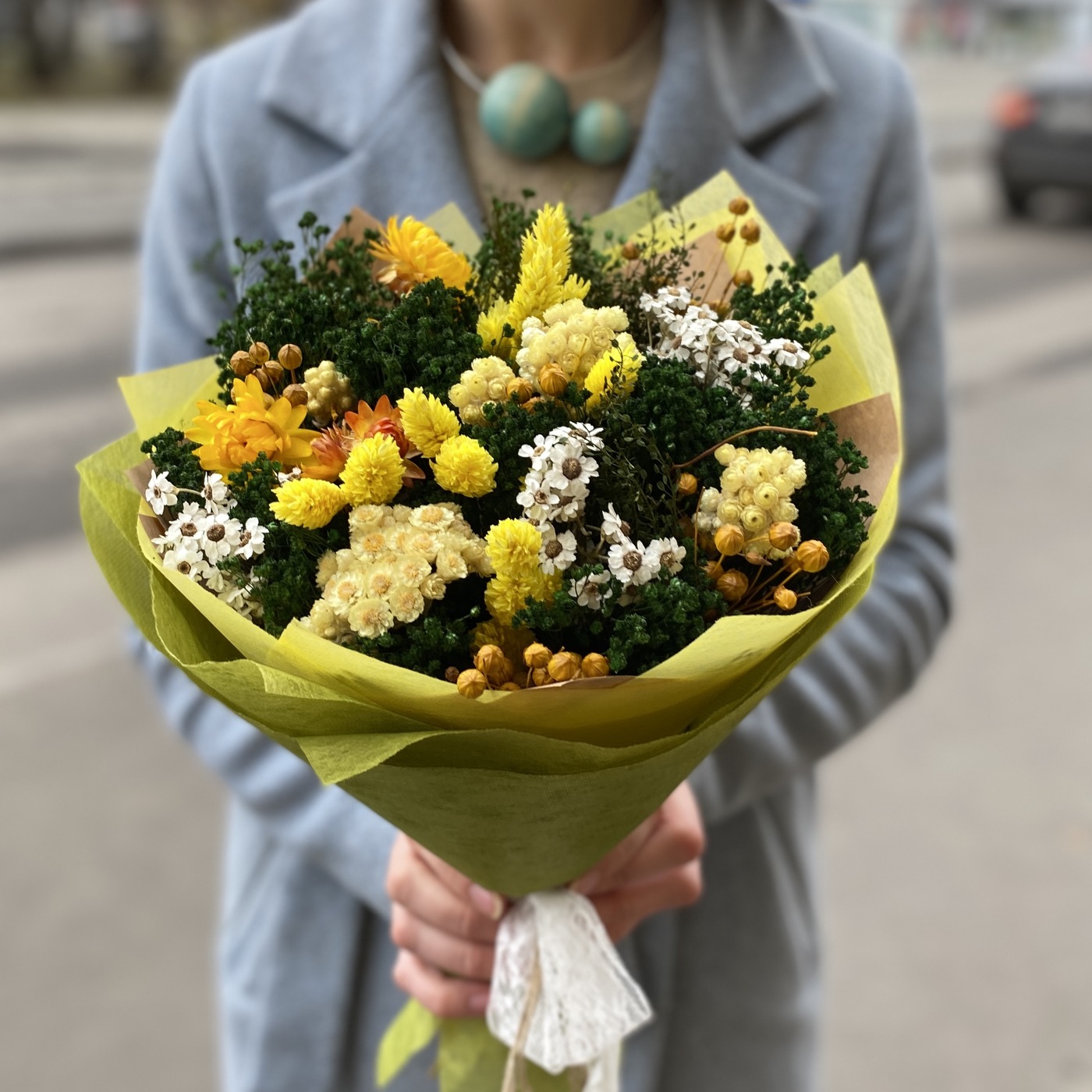 Яркий, одновременно с этим стильный, а главное - вечный букет из необыкновенных сухоцветов станет приятным и незабываемым комплиментом для ребенка или молодой мечтательной девушки.