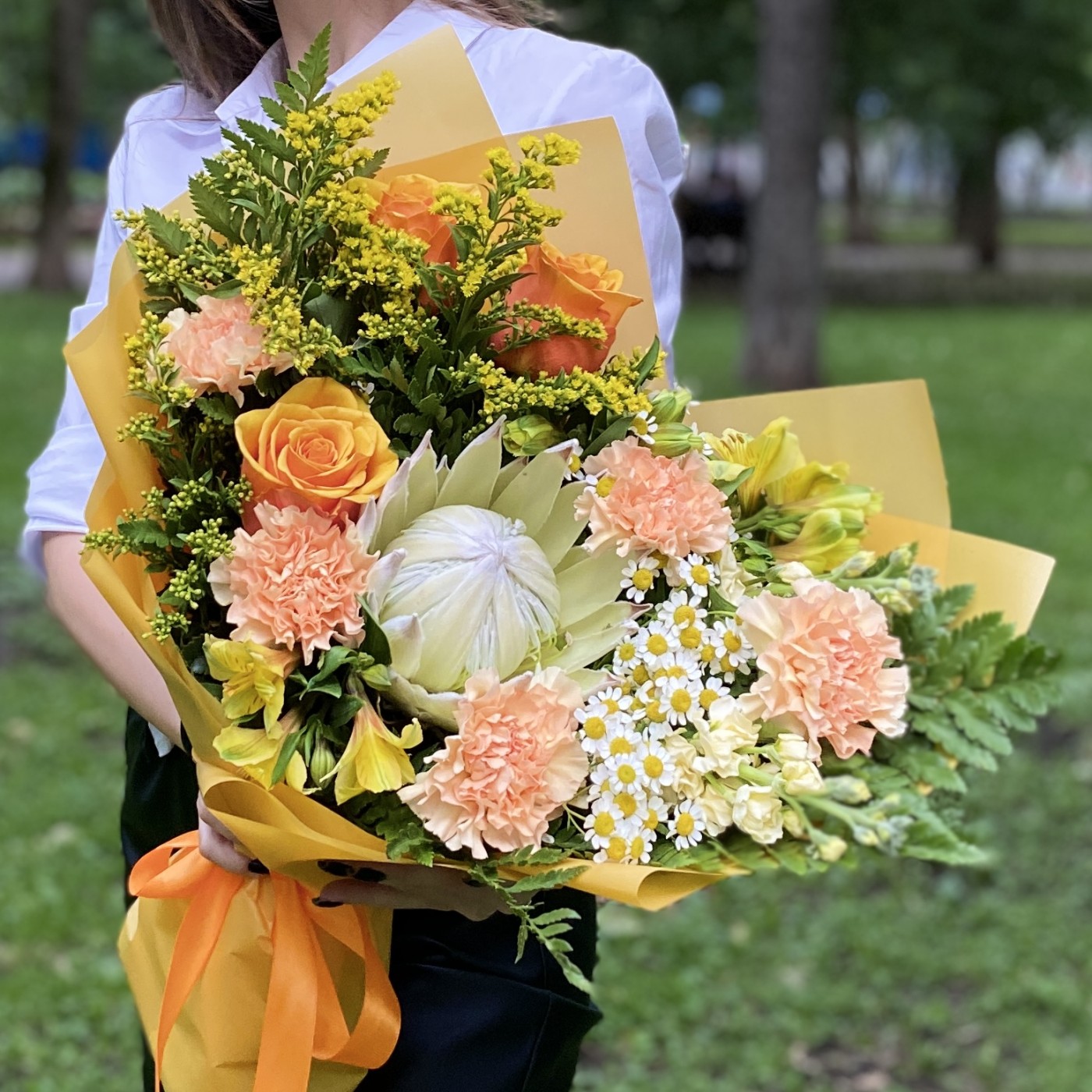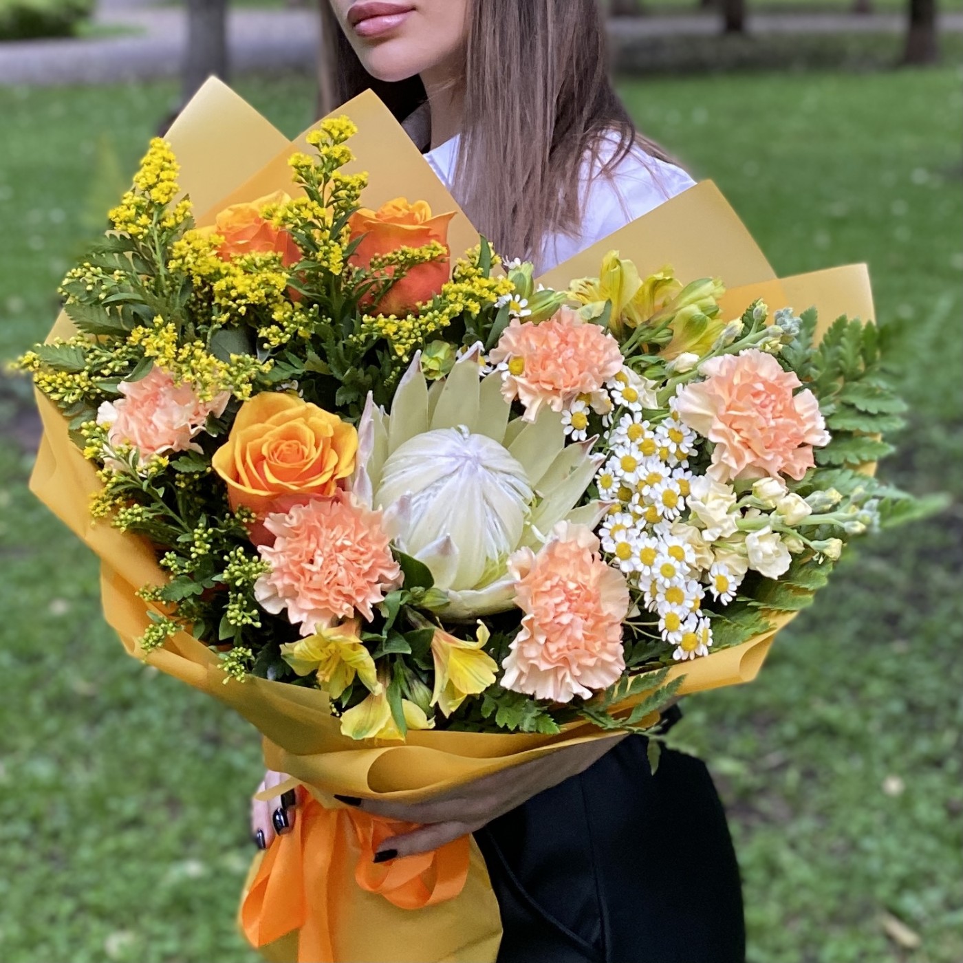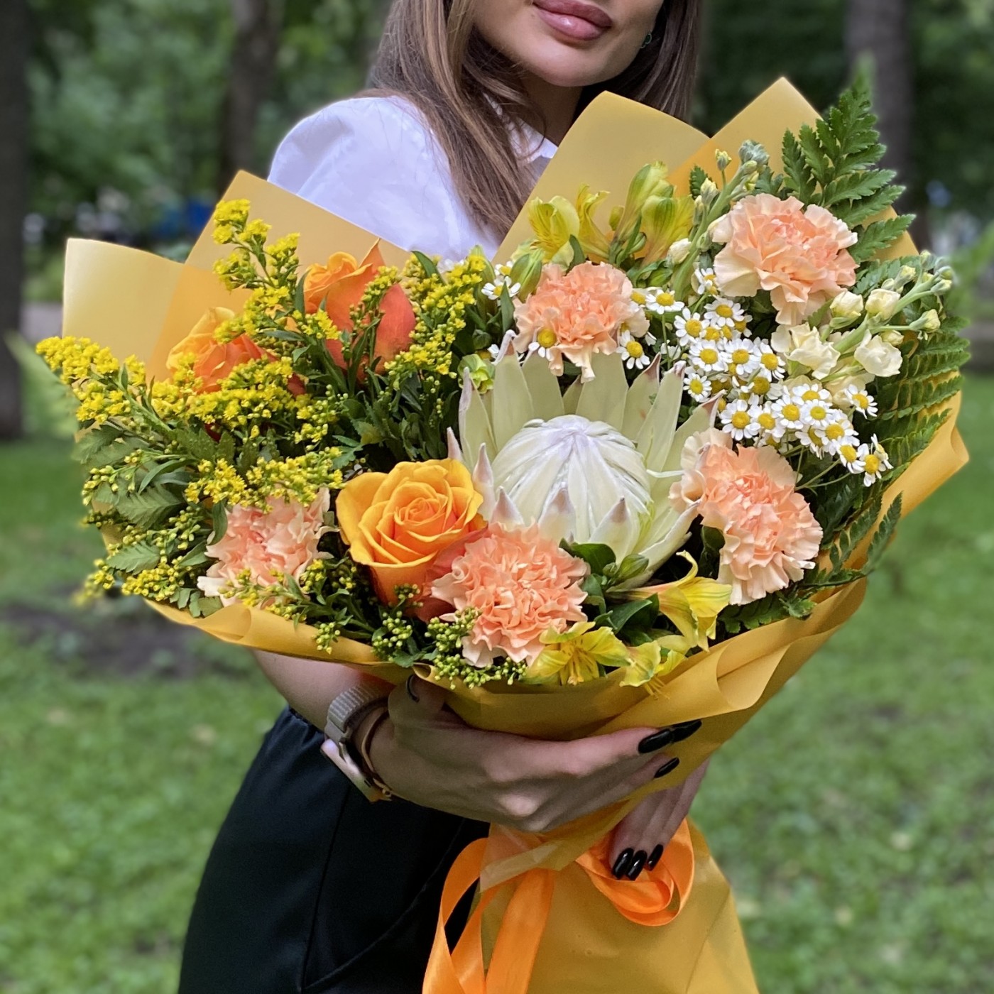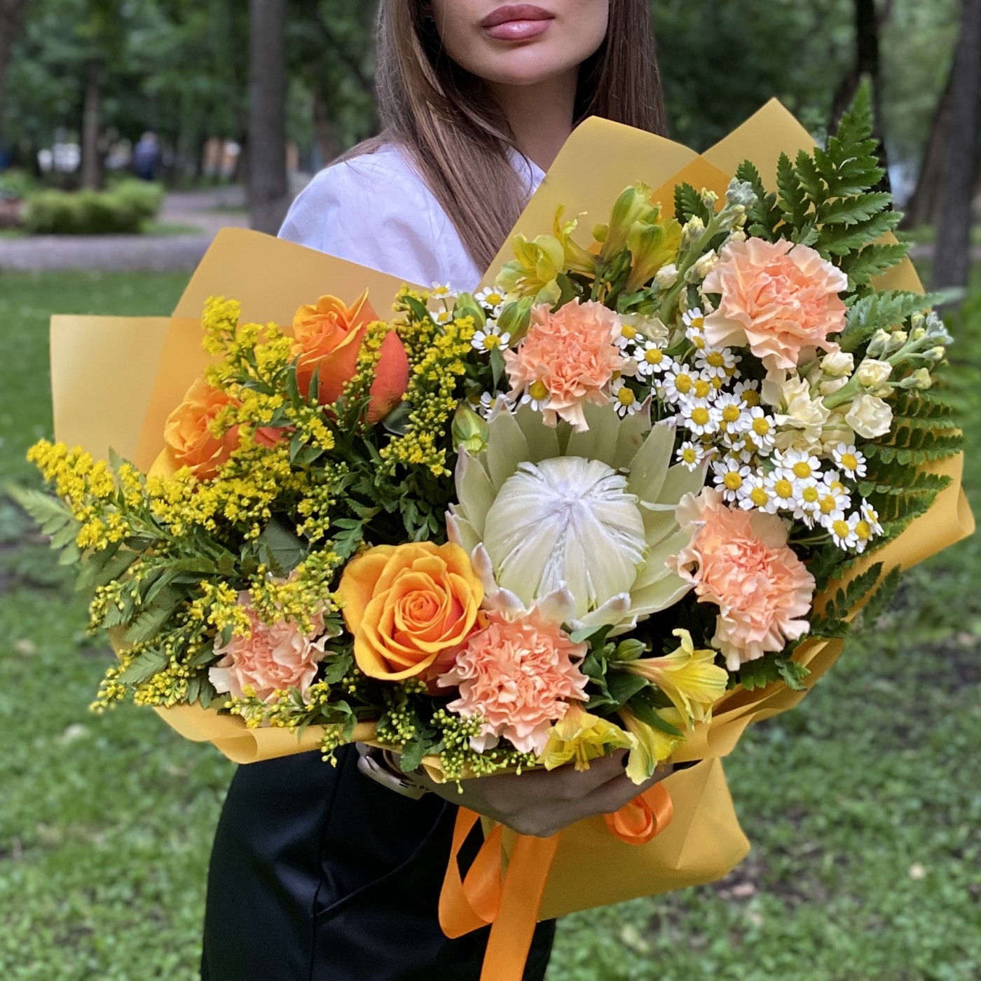 Яркий букет с шикарной протеей и пушистыми гвоздиками-диантусами станет запоминающимся для своей получательницы. Доставим к указанному времени по Москве и Московской области.