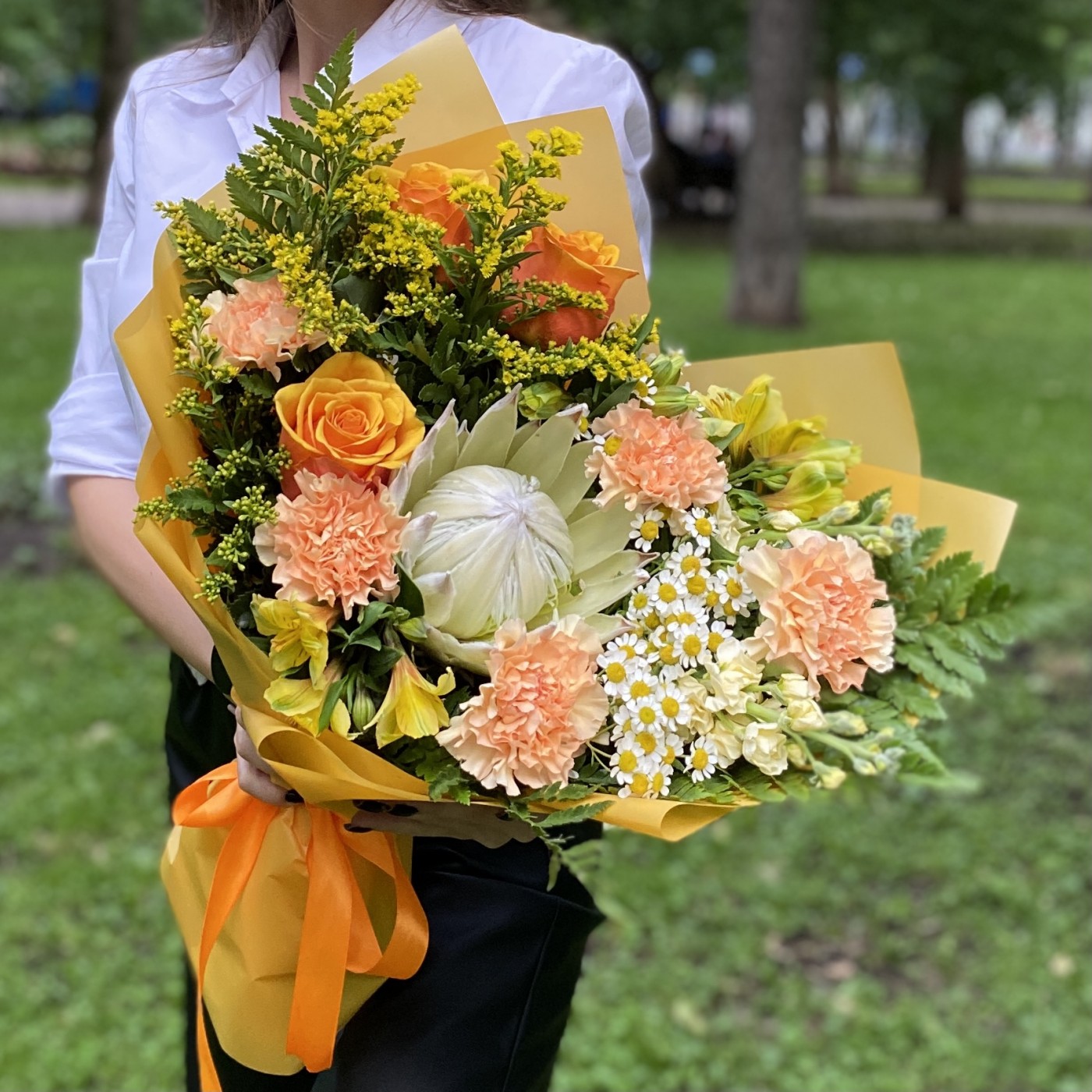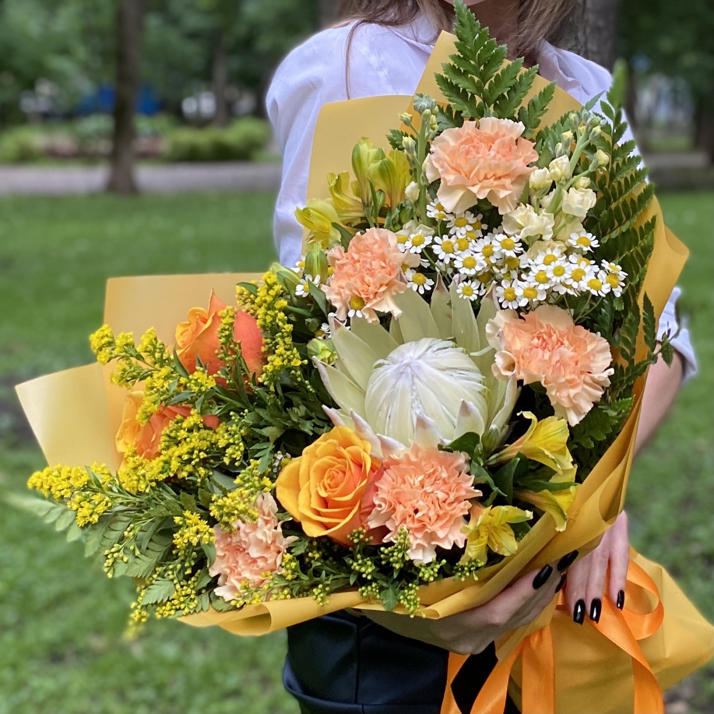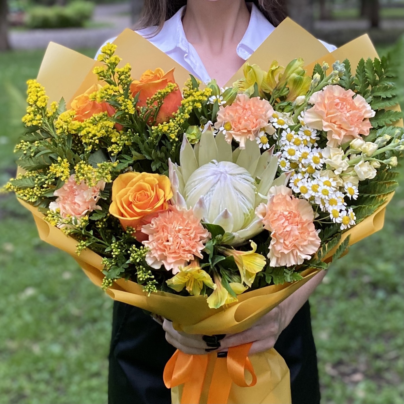 Яркий букет с шикарной протеей и пушистыми гвоздиками-диантусами станет запоминающимся для своей получательницы. Доставим к указанному времени по Москве и Московской области.