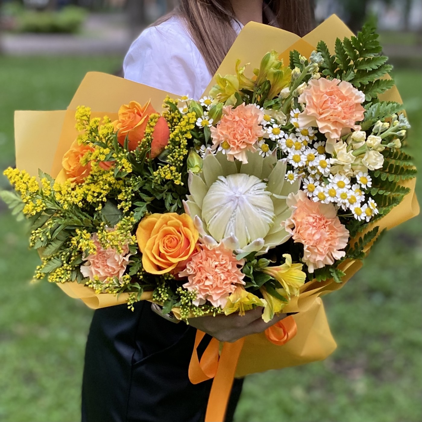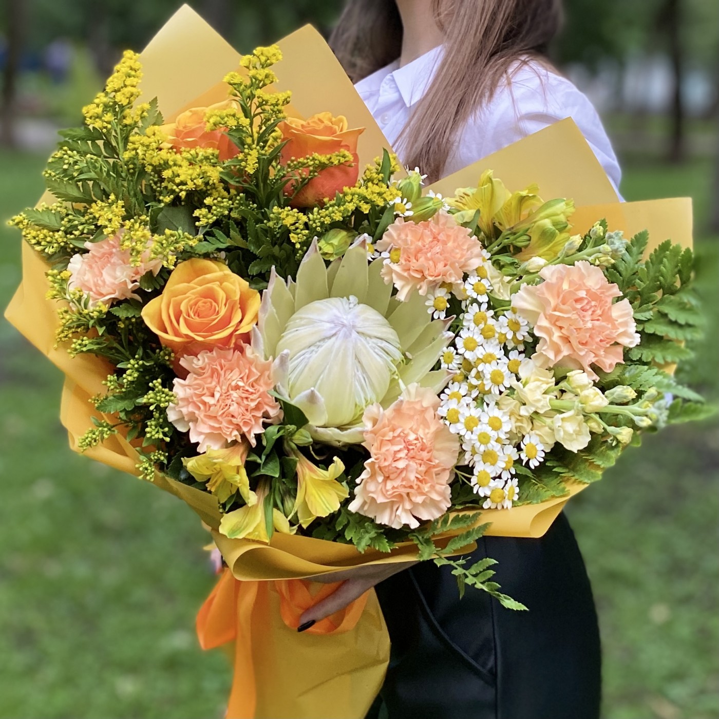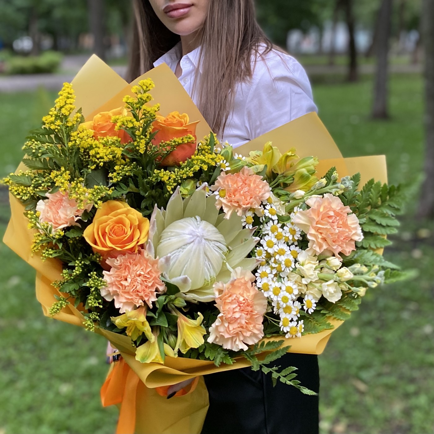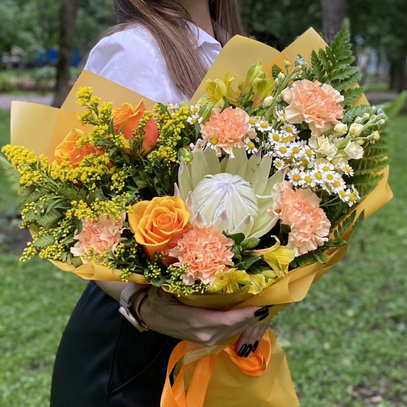 Яркий букет с шикарной протеей и пушистыми гвоздиками-диантусами станет запоминающимся для своей получательницы. Доставим к указанному времени по Москве и Московской области.