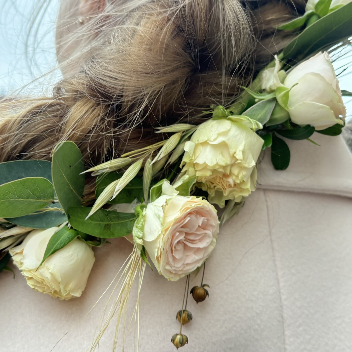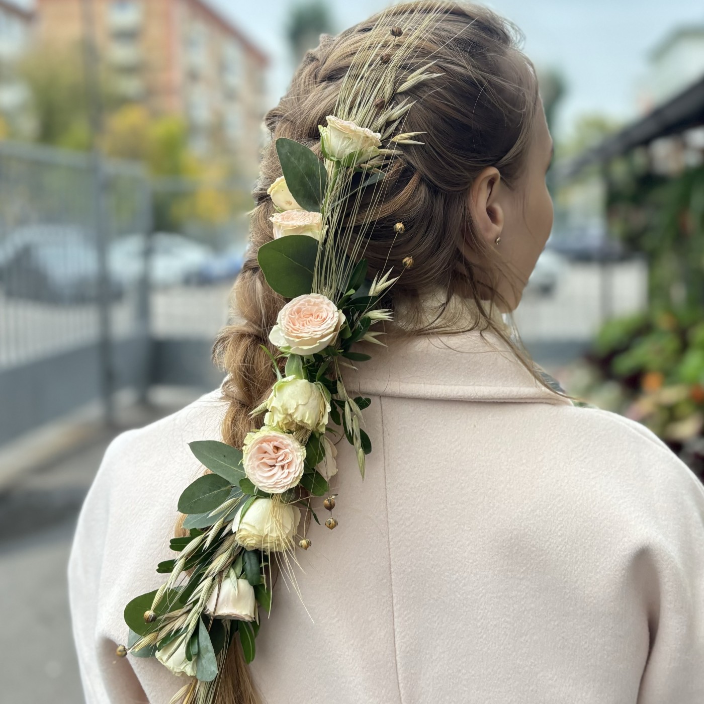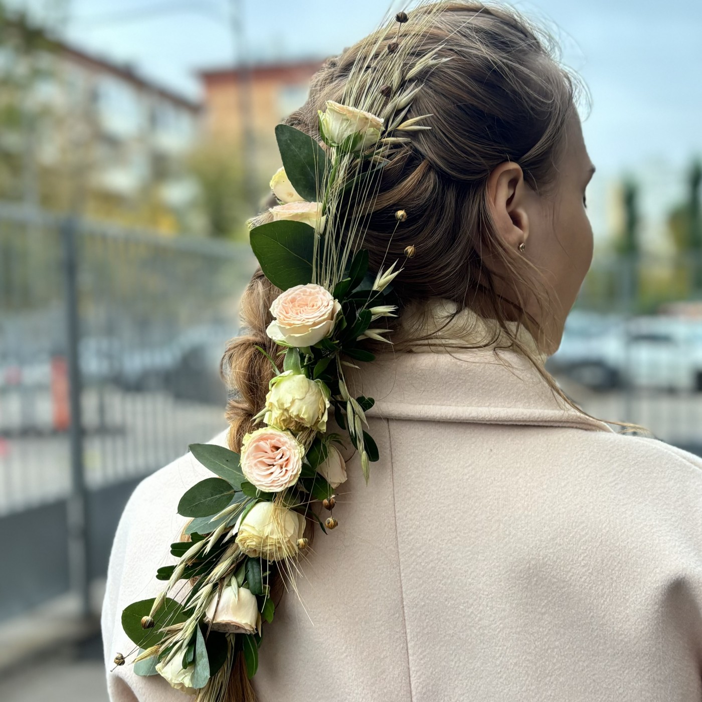 Украшение из цветов в волосы с кустовой пионовидной розой и сухоцветами – это прекрасный и романтичный аксессуар, который отлично подойдет для свадебного торжества, особенно для невесты и подружек невесты.