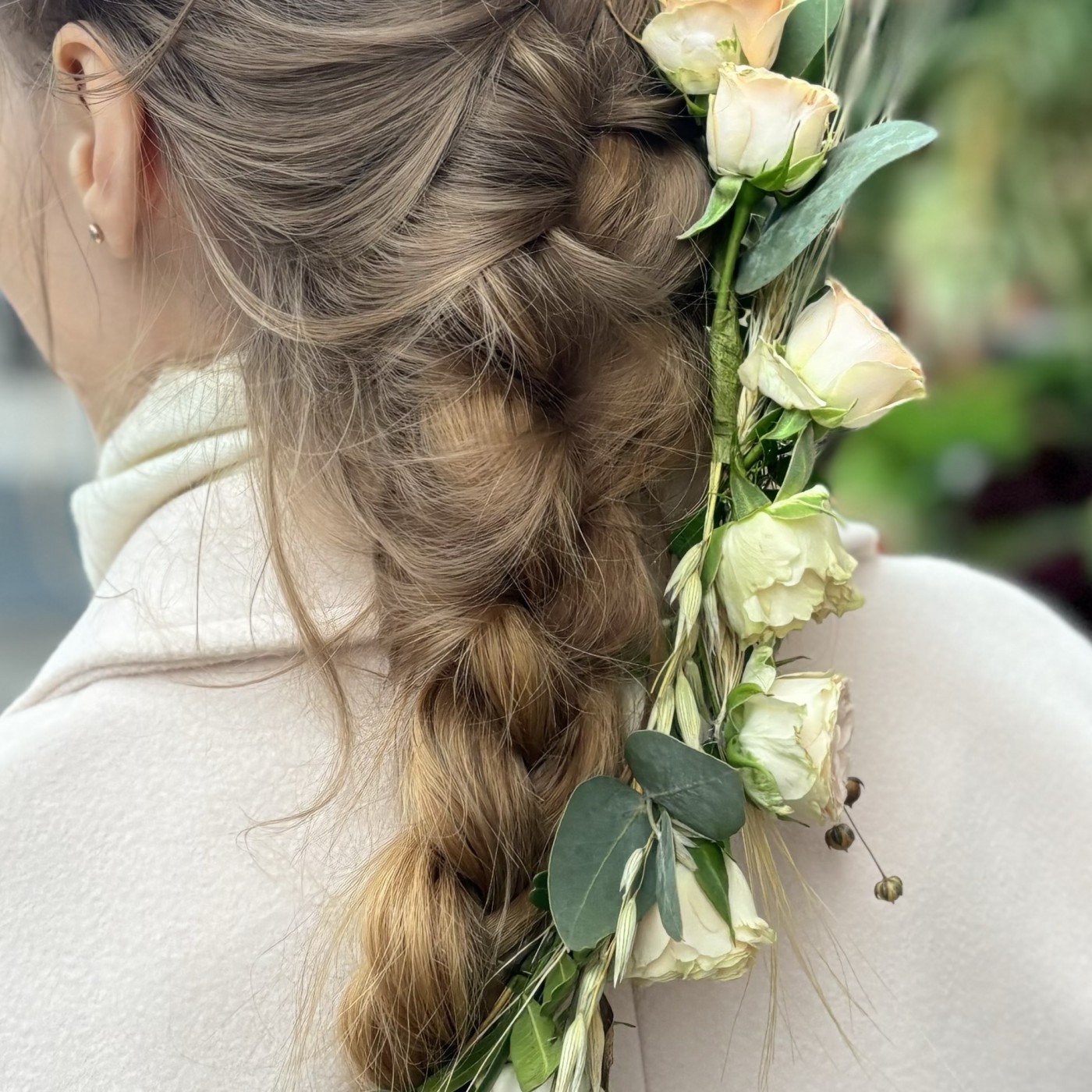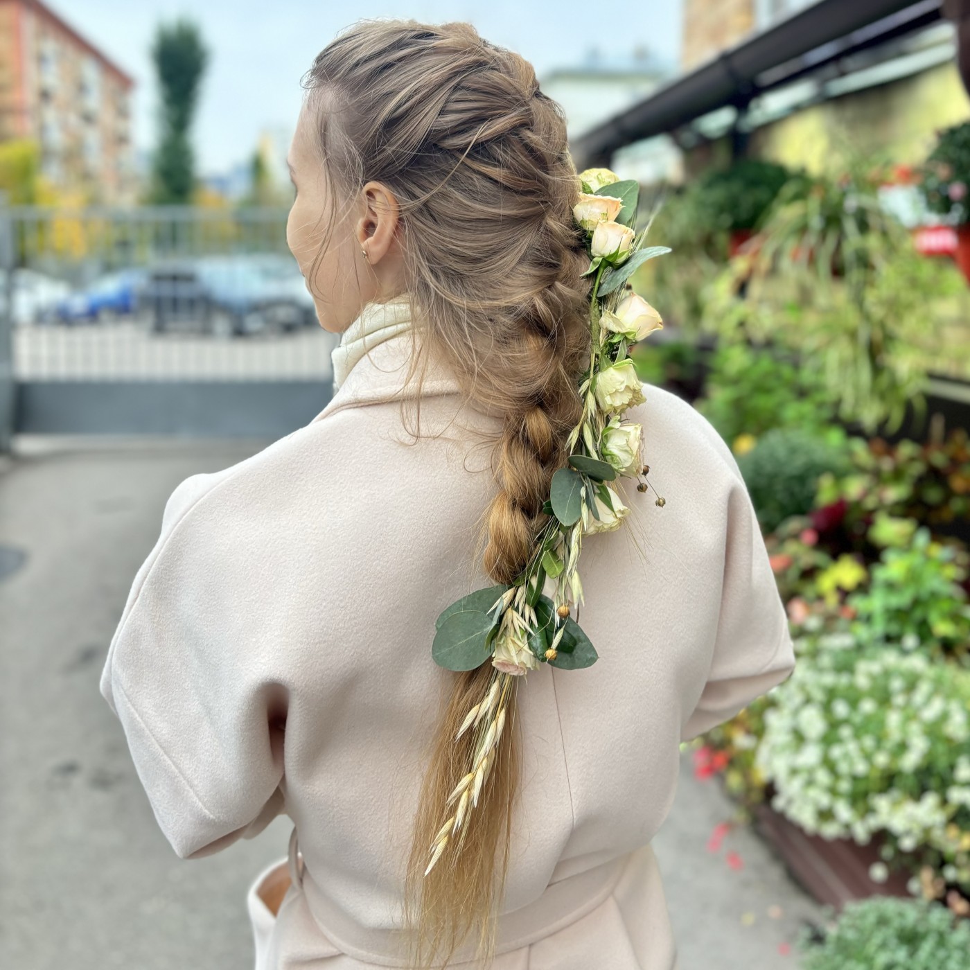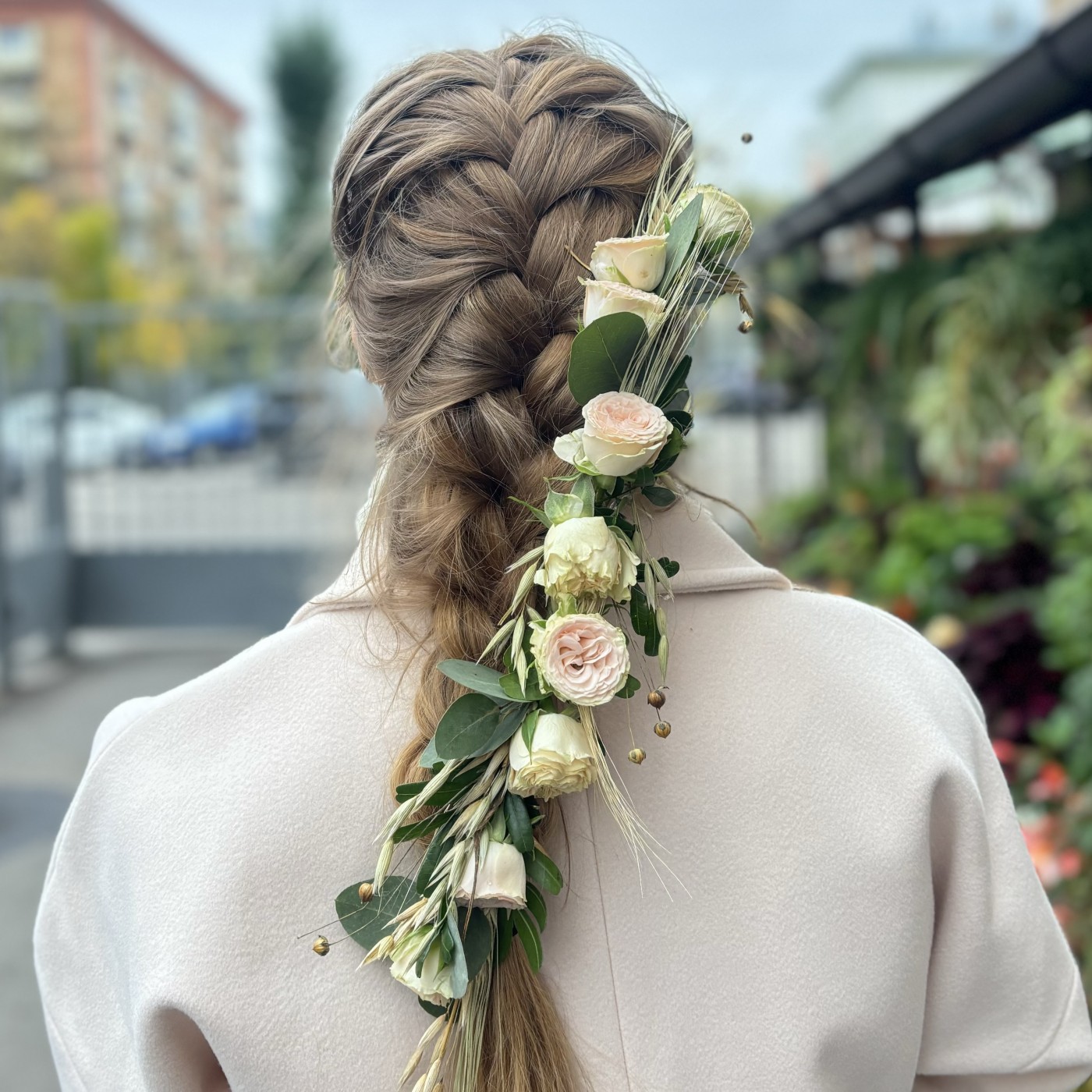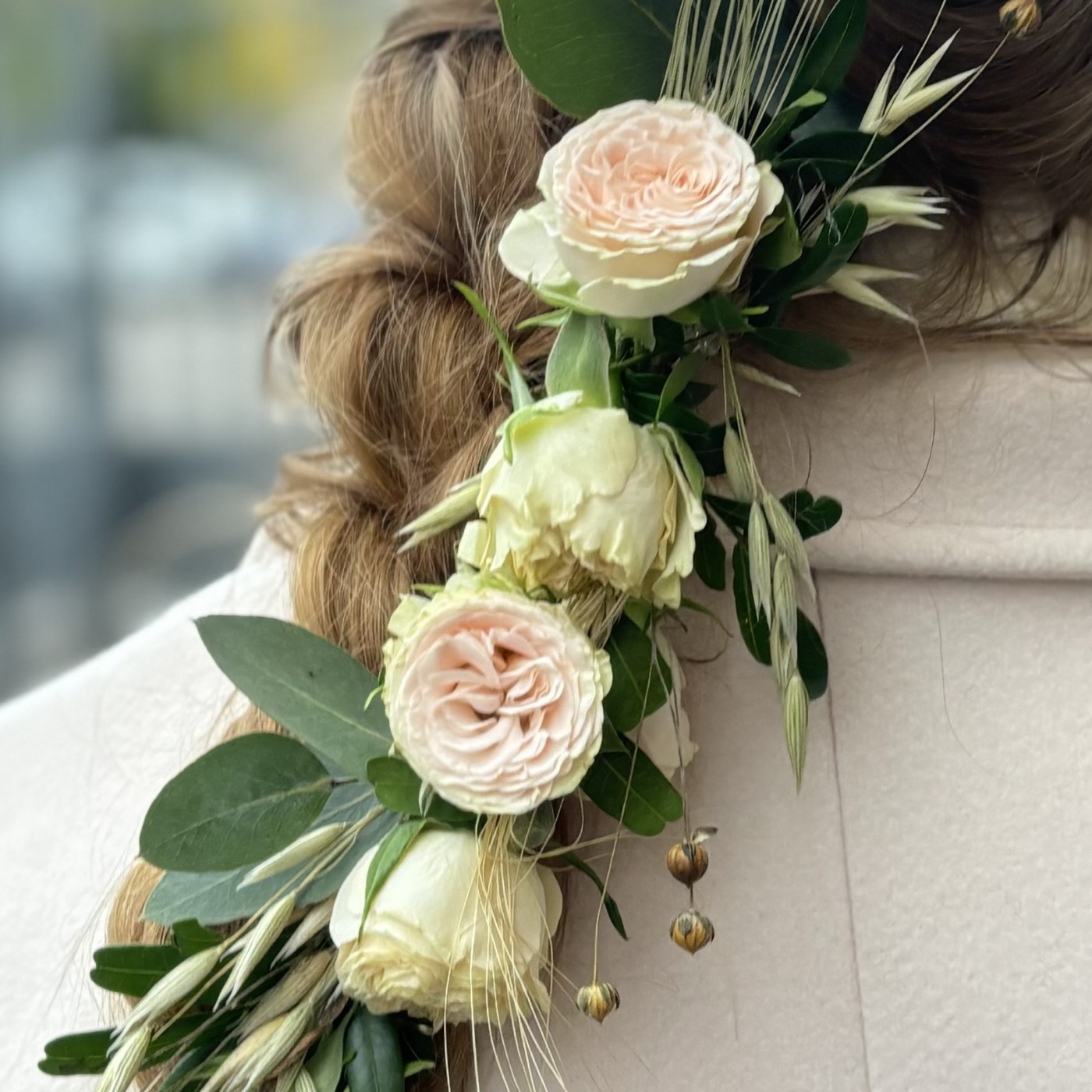 Украшение из цветов в волосы с кустовой пионовидной розой и сухоцветами – это прекрасный и романтичный аксессуар, который отлично подойдет для свадебного торжества, особенно для невесты и подружек невесты.